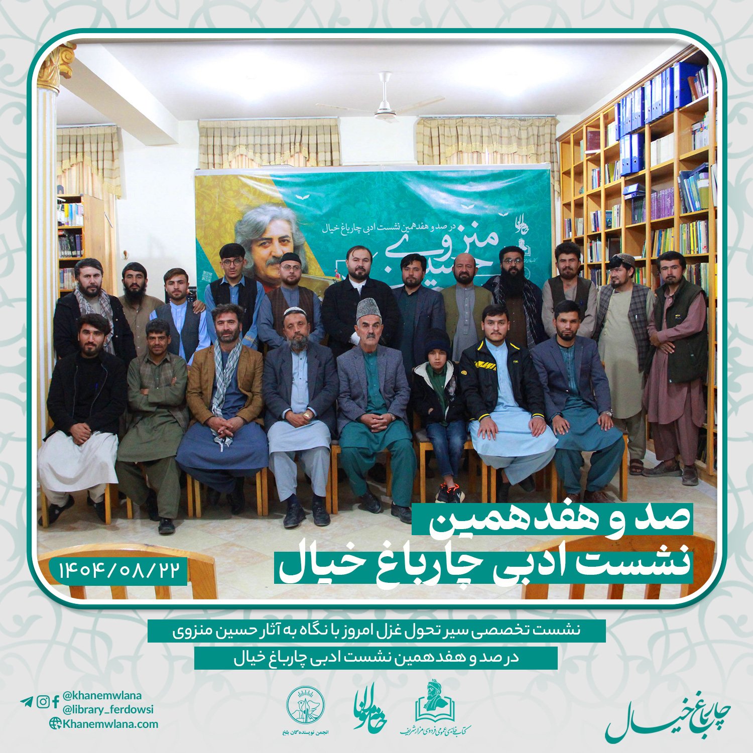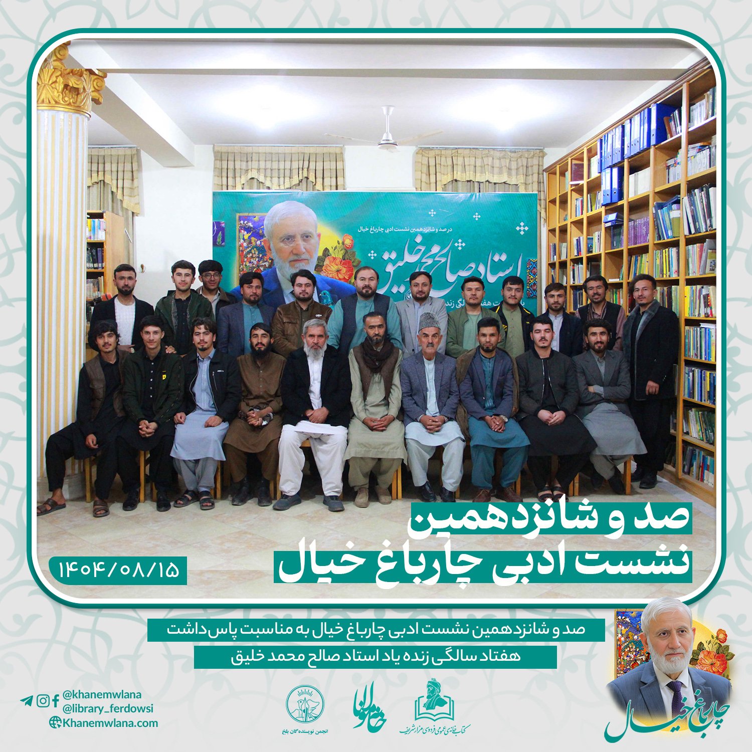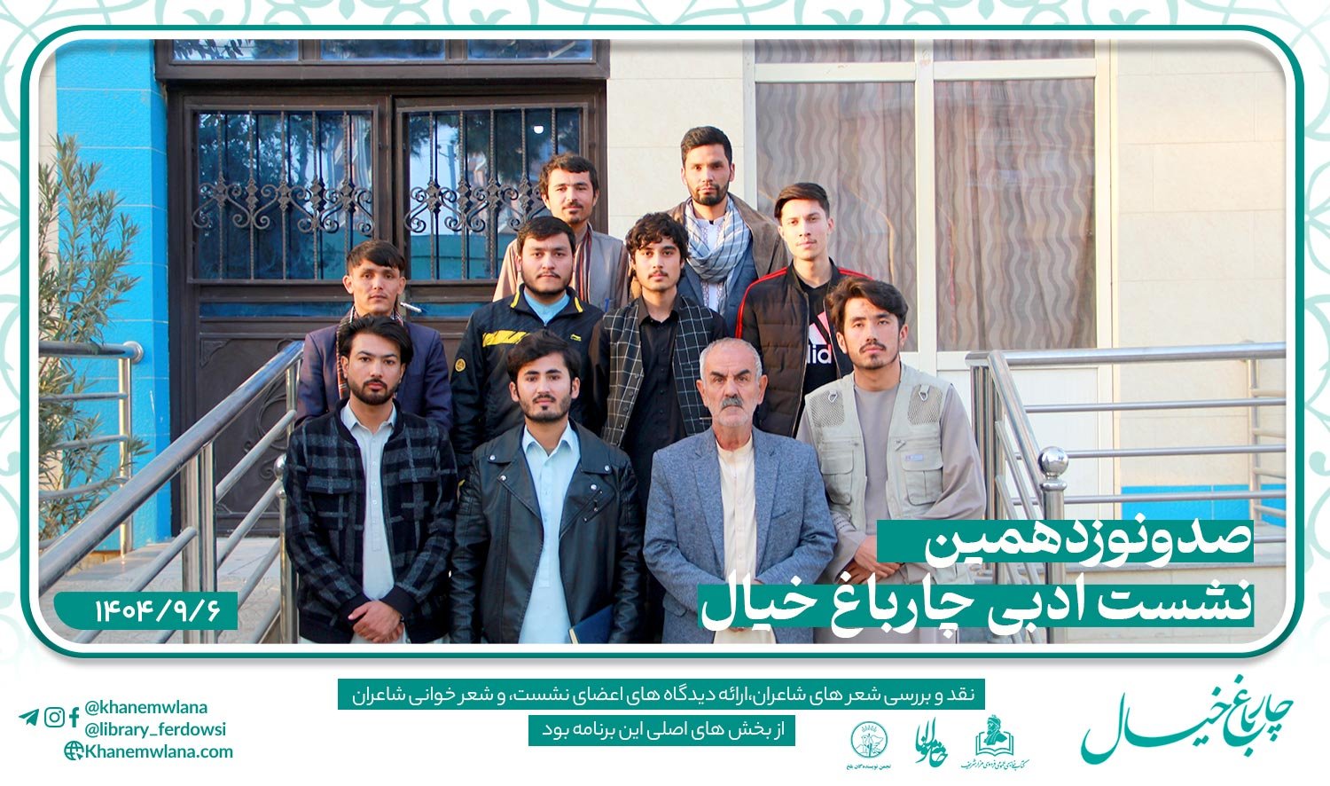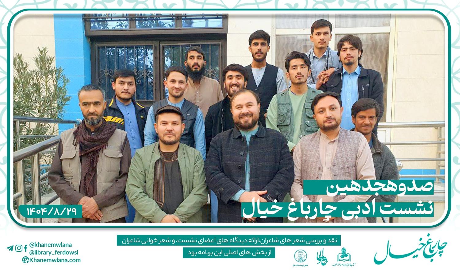 نشست: صد و هجدهمعصر پنجشنبه، ۲۹ عقرب ۱۴۰۴ خورشیدی، صد و هجدهمین نشست هفتگی «چارباغ خیال» با حضور جمعی از شاعران و علاقهمندان در بلخ برگزار شد. گردانندگی این برنامه...