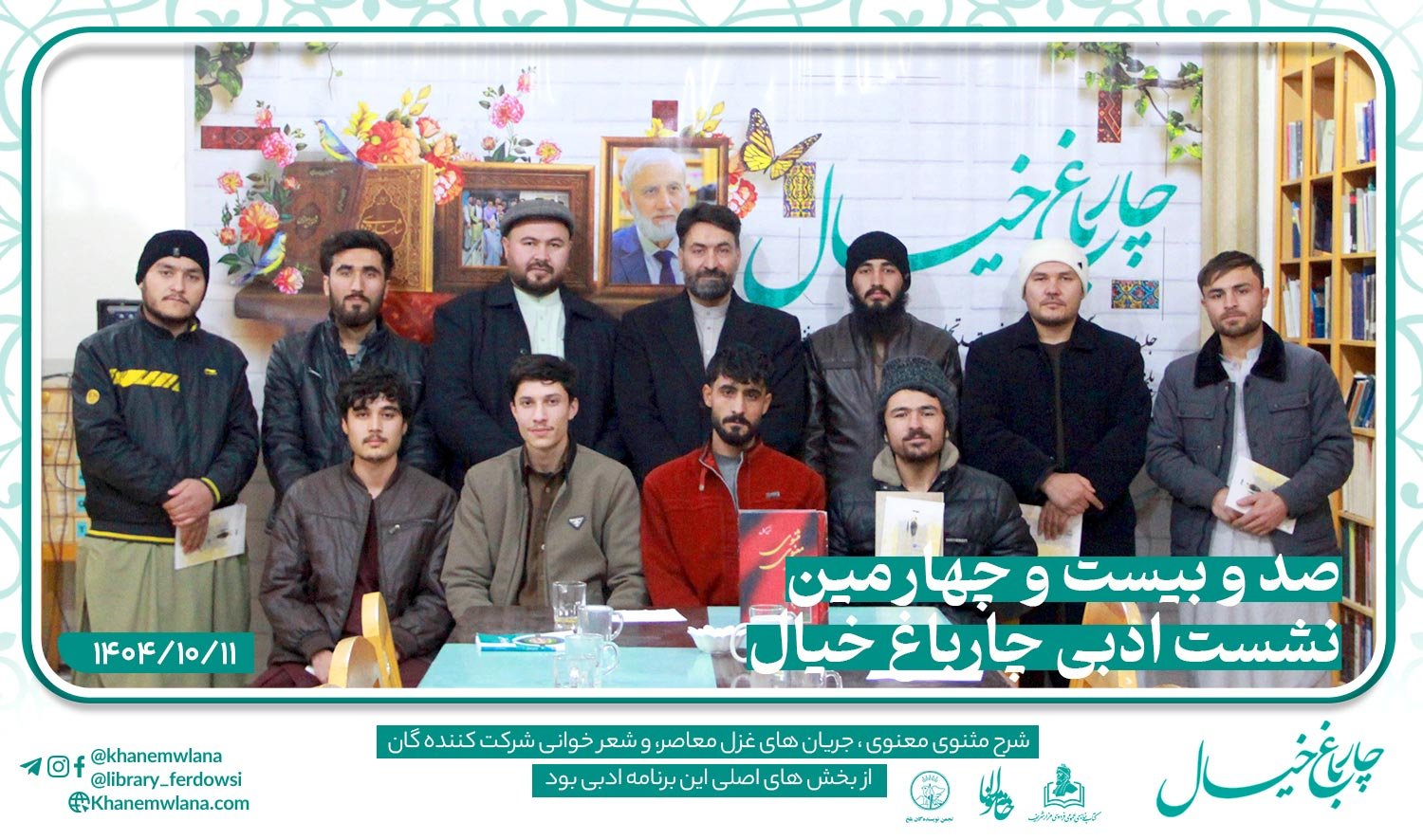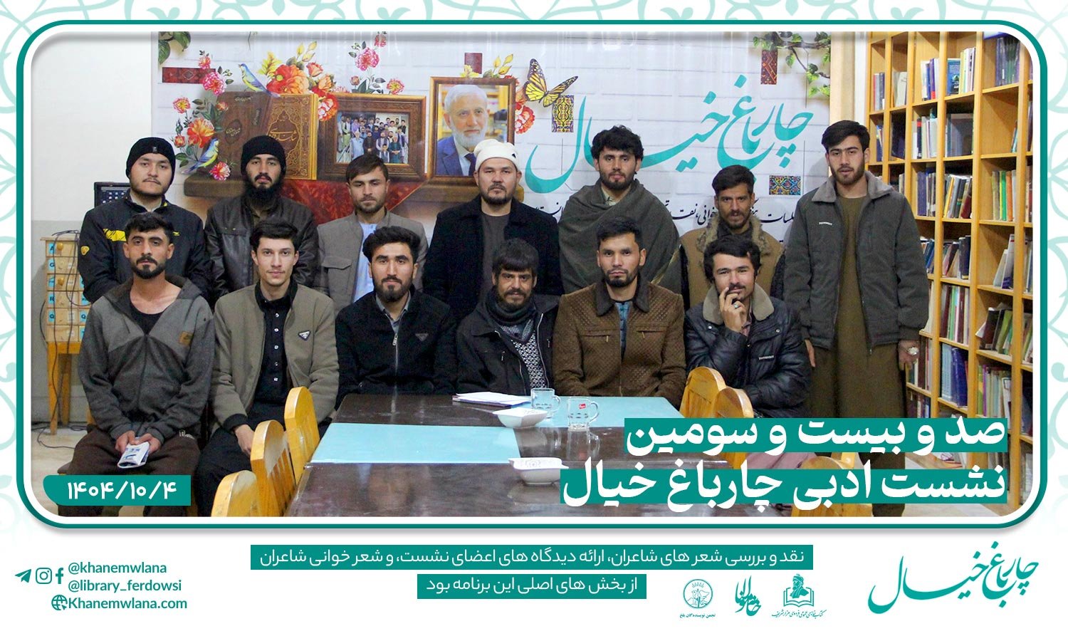 نشست صد و بیست و چهارمین گزارش:سهراب سوشیان صد و بیست و چهارمین نشست ادبی «چارباغ خیال» در بلخ، بعدازظهر روز پنجشنبه یازدهم جدی (دیماه) ۱۴۰۴ خورشیدی، با مقدمه و گردانندگی حمزهی...