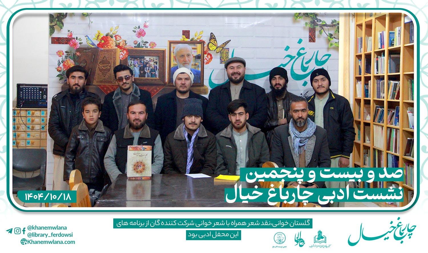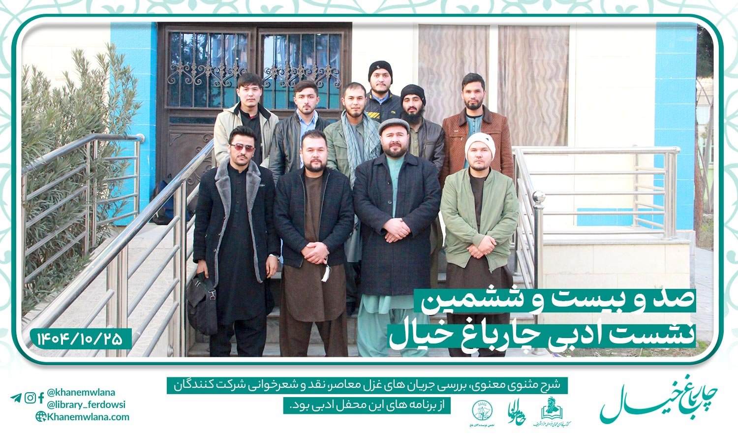 نشست صد و بیست و پنجمین گزارش: سهراب سوشیان صد و بیست و پنجمین نشستِ ادبی «چارباغ خیال» در بلخ، بعد از ظهر روز پنجشنبه ۱۸ جدی (دیماه) ۱۴۰۴ هجری خورشیدی،...