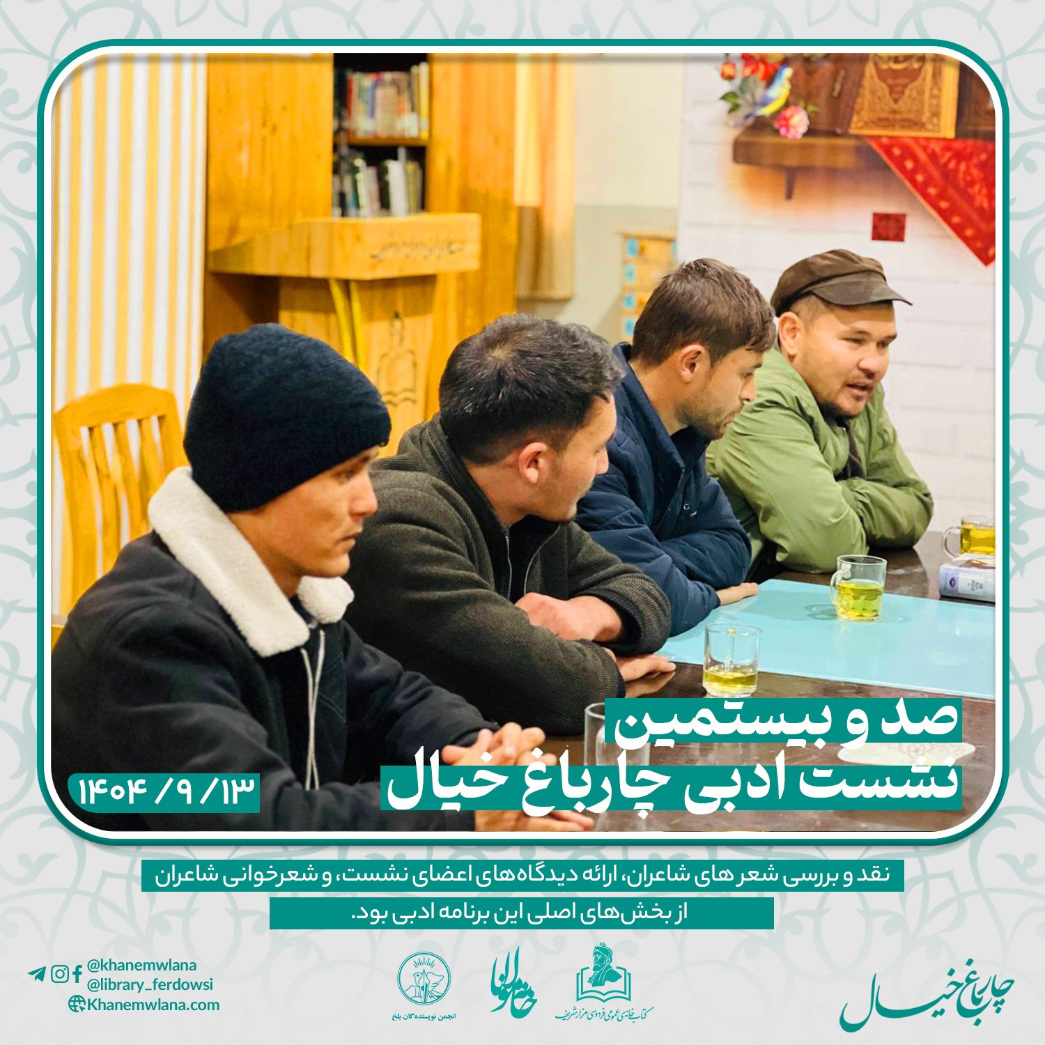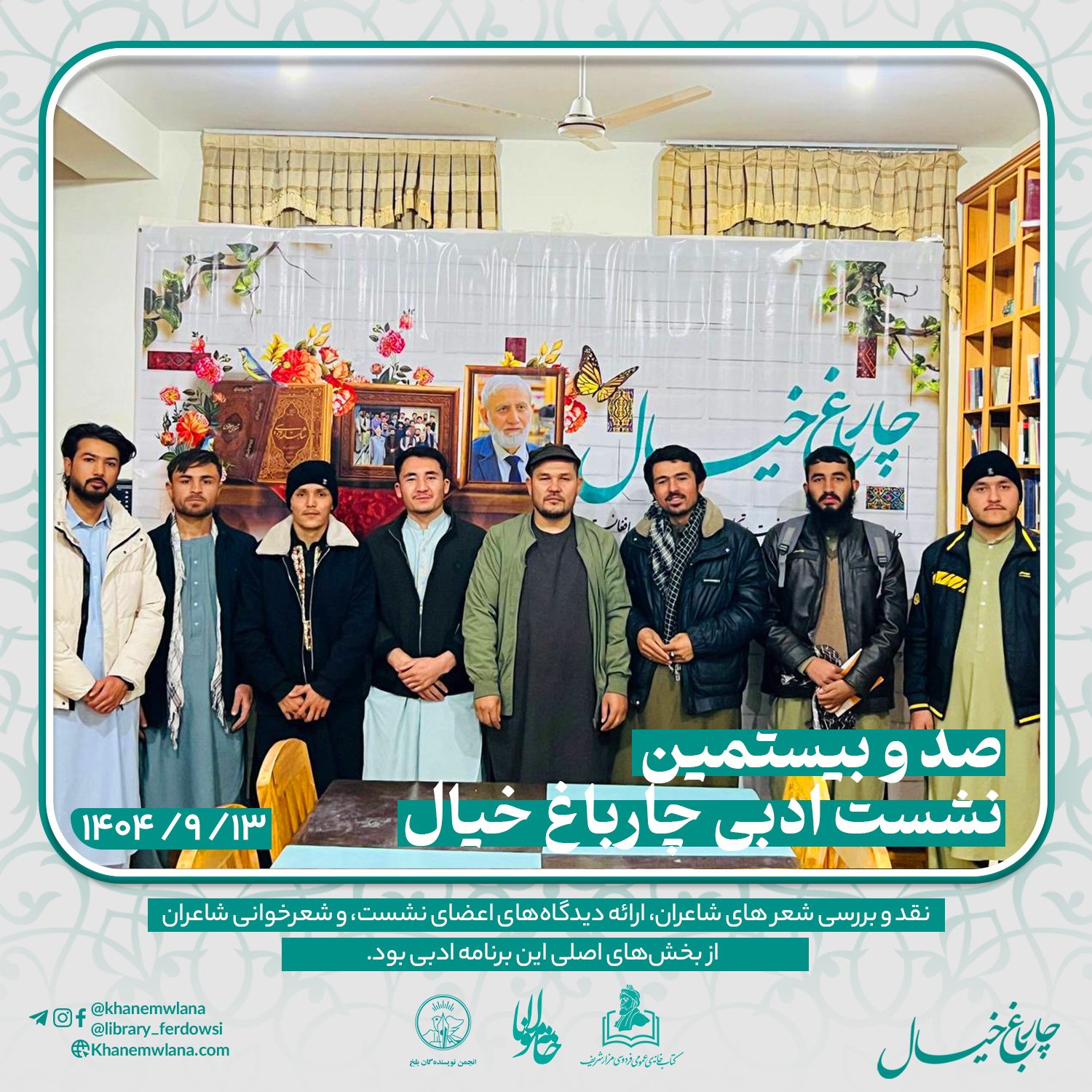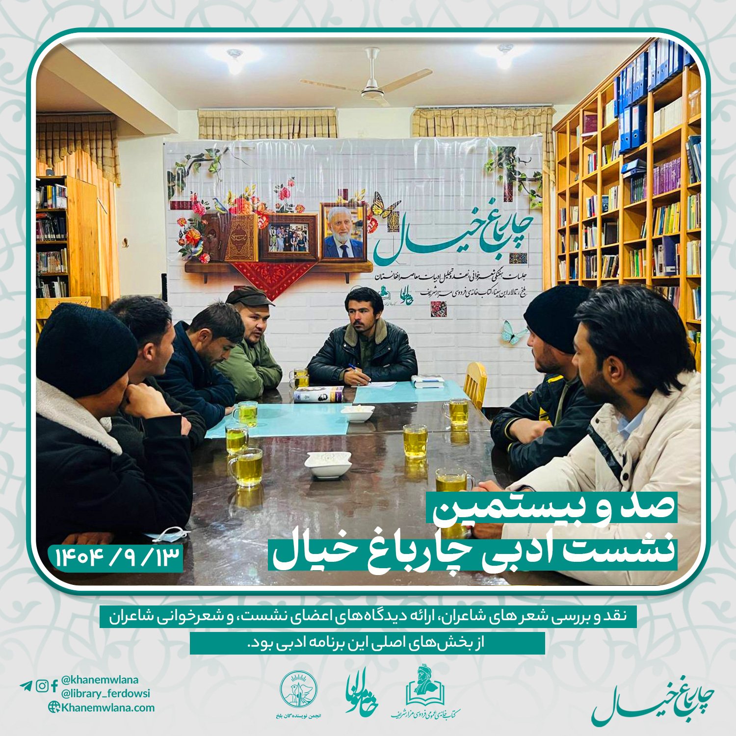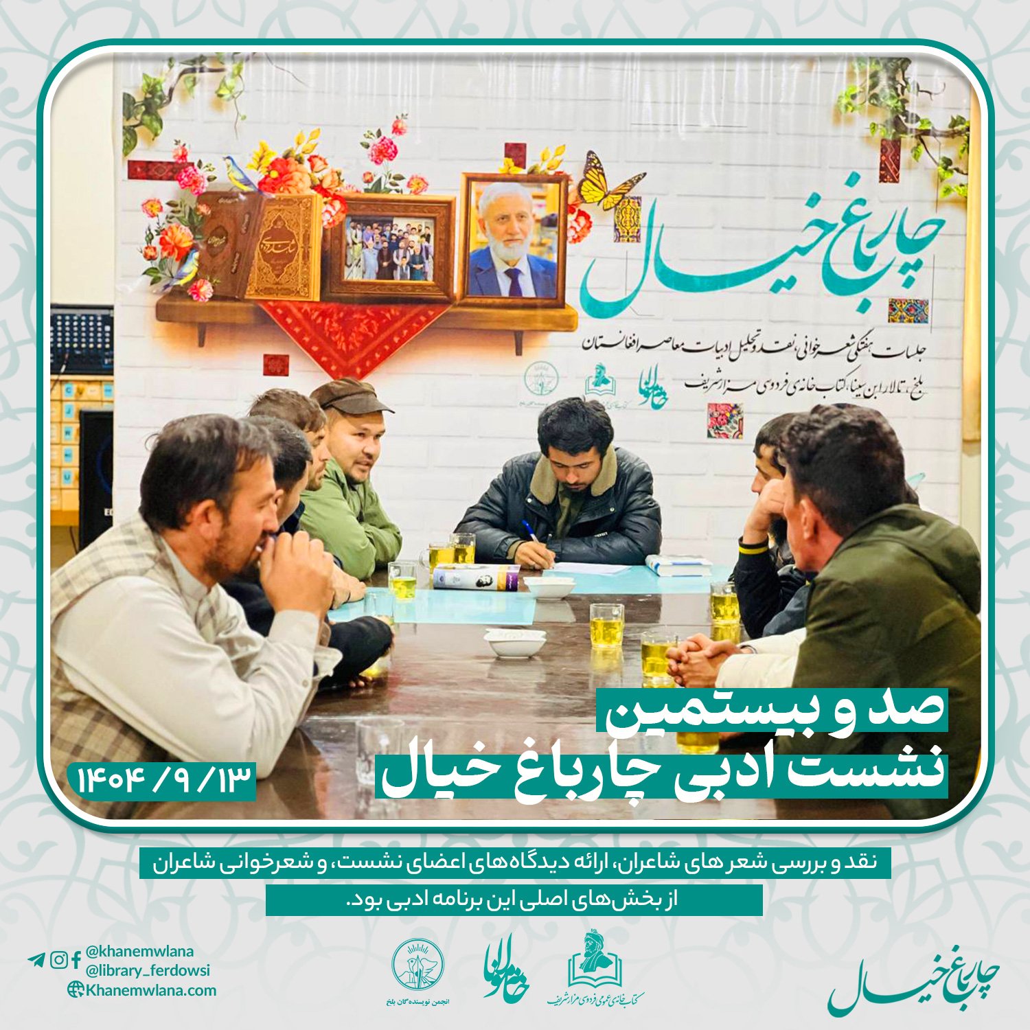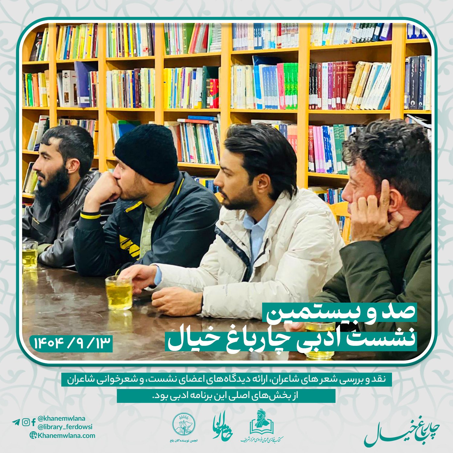 بعدازظهر پنجشنبه، ۱۴ قوس ۱۴۰۴ خورشیدی، صدو بیستمین نشست ادبی «چارباغ خیال» با حضور جمعی از شاعران و نویسندگان بلخی، در مخزن کتابخانهٔ عمومی فردوسی برگزار شد. مقدمه و گردانندگی این نشست را آقای موسی مهربان بر عهده داشت و برنامه در سه بخش گفتوگوی ادبی، نقد و بررسی شعر و خوشخوانی شعر اجرا شد.