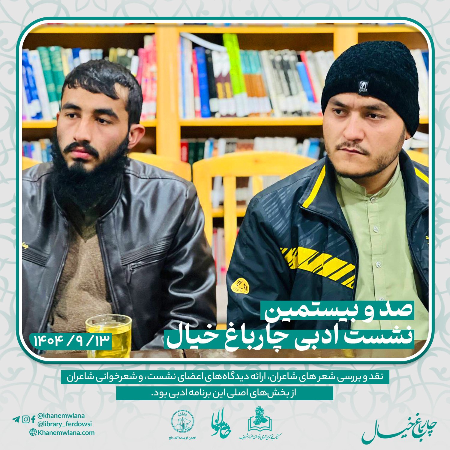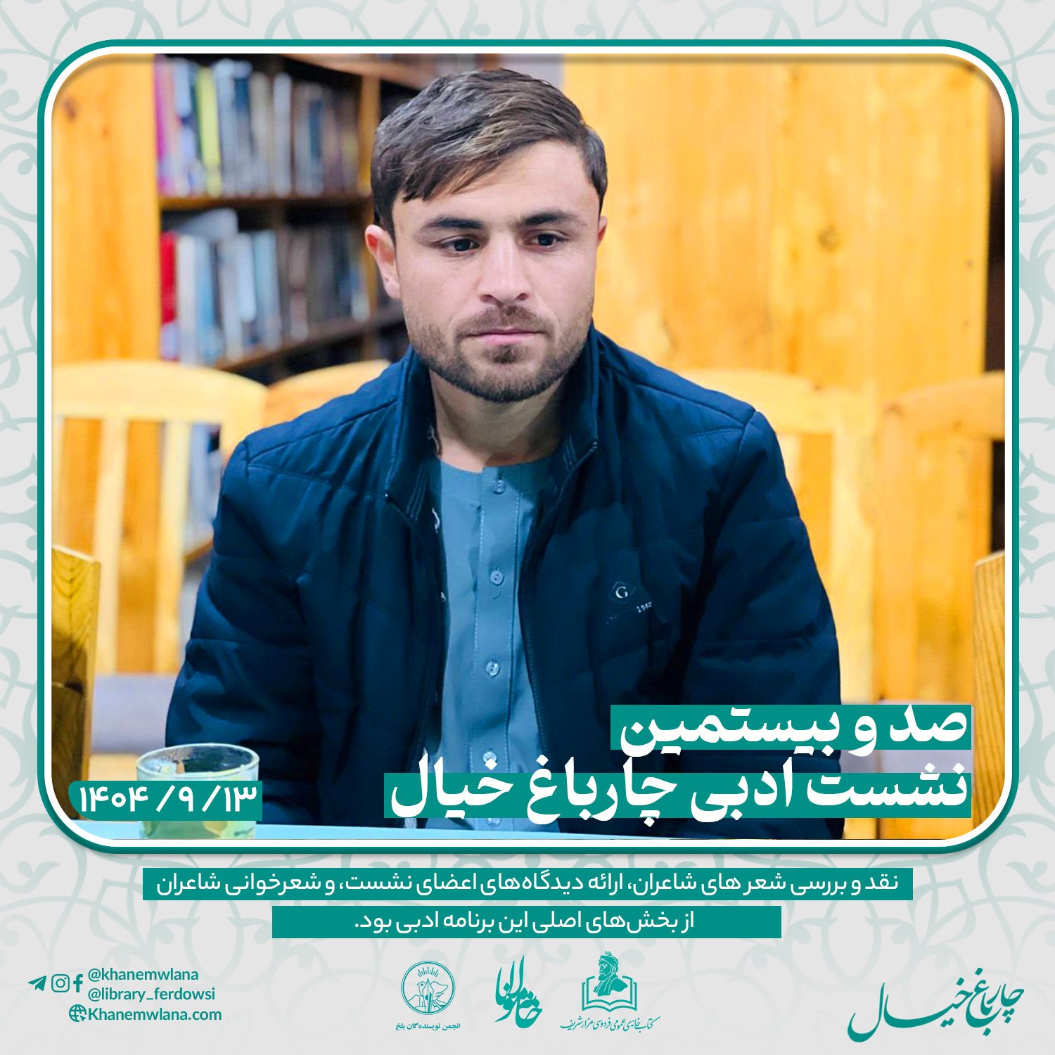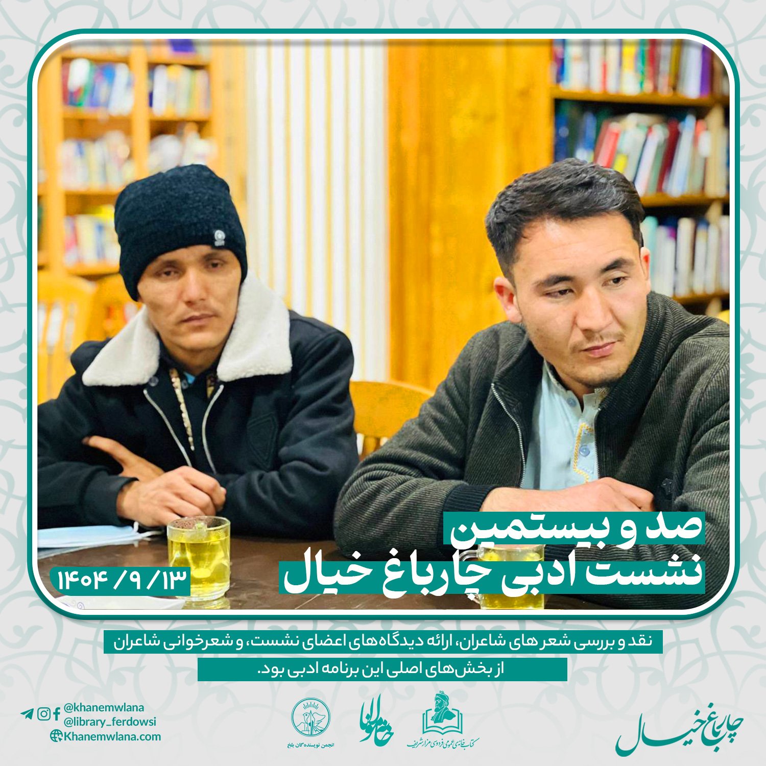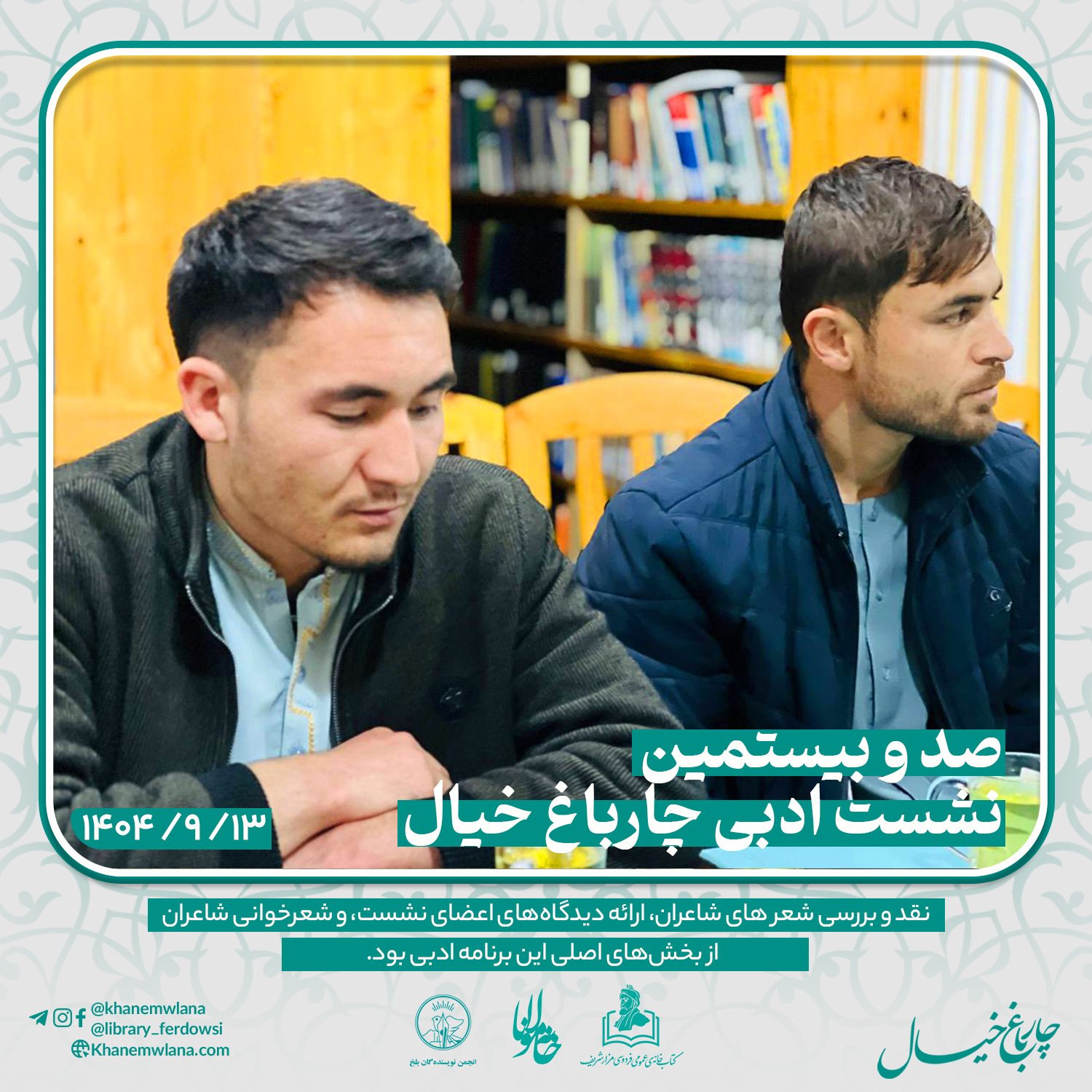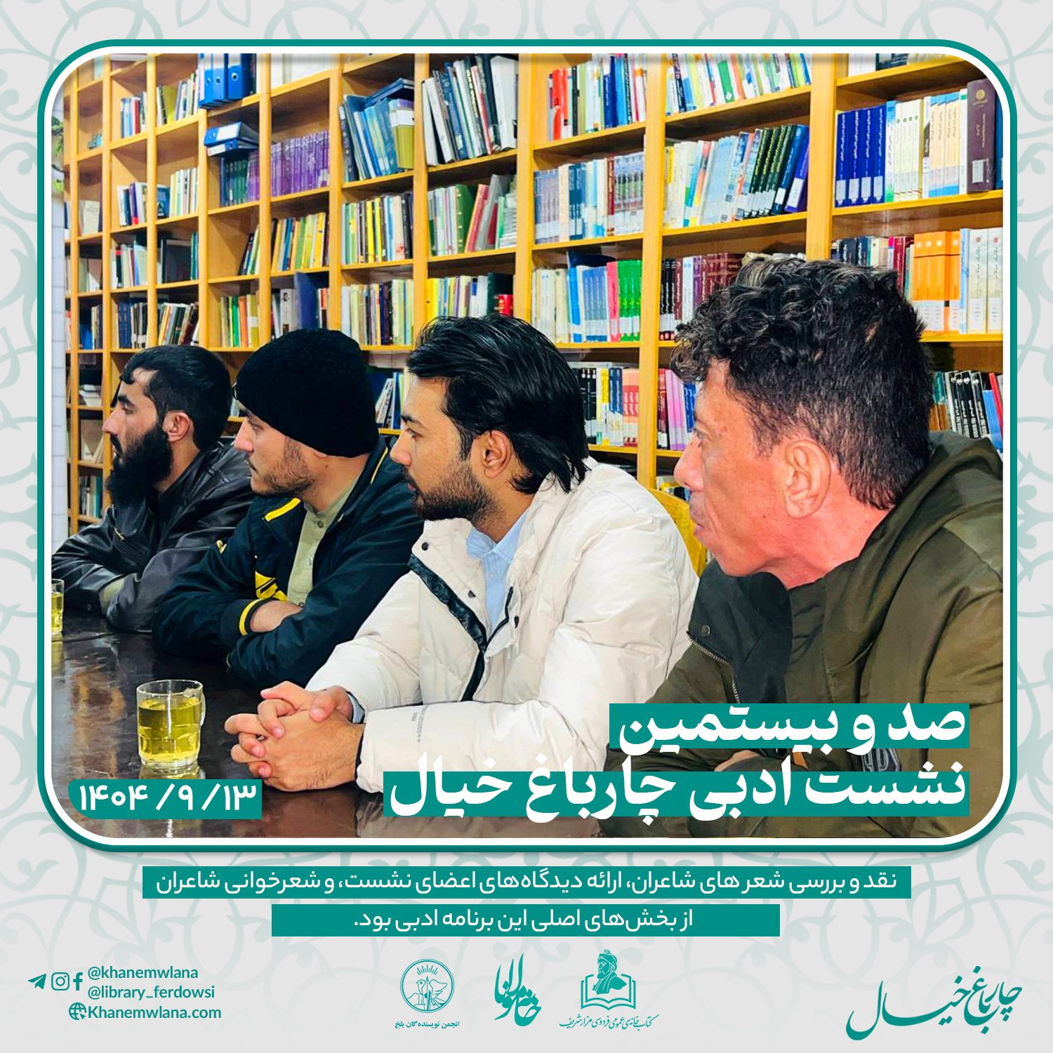بعدازظهر پنجشنبه، ۱۴ قوس ۱۴۰۴ خورشیدی، صدو بیستمین نشست ادبی «چارباغ خیال» با حضور جمعی از شاعران و نویسندگان بلخی، در مخزن کتابخانهٔ عمومی فردوسی برگزار شد. مقدمه و گردانندگی این نشست را آقای موسی مهربان بر عهده داشت و برنامه در سه بخش گفتوگوی ادبی، نقد و بررسی شعر و خوشخوانی شعر اجرا شد.