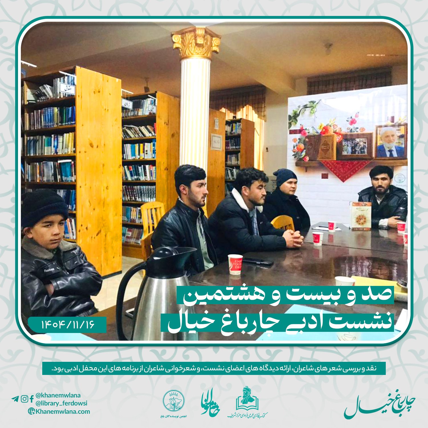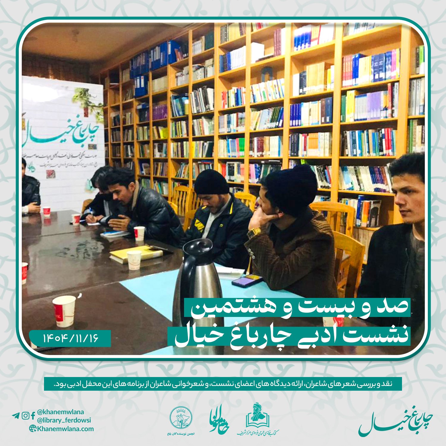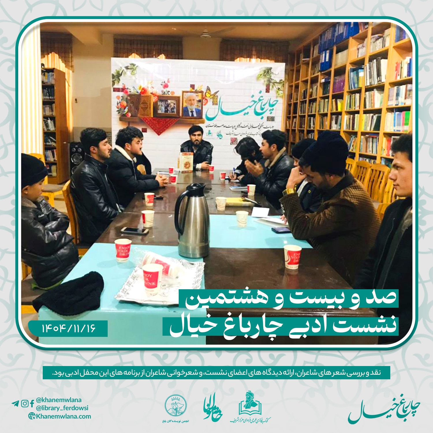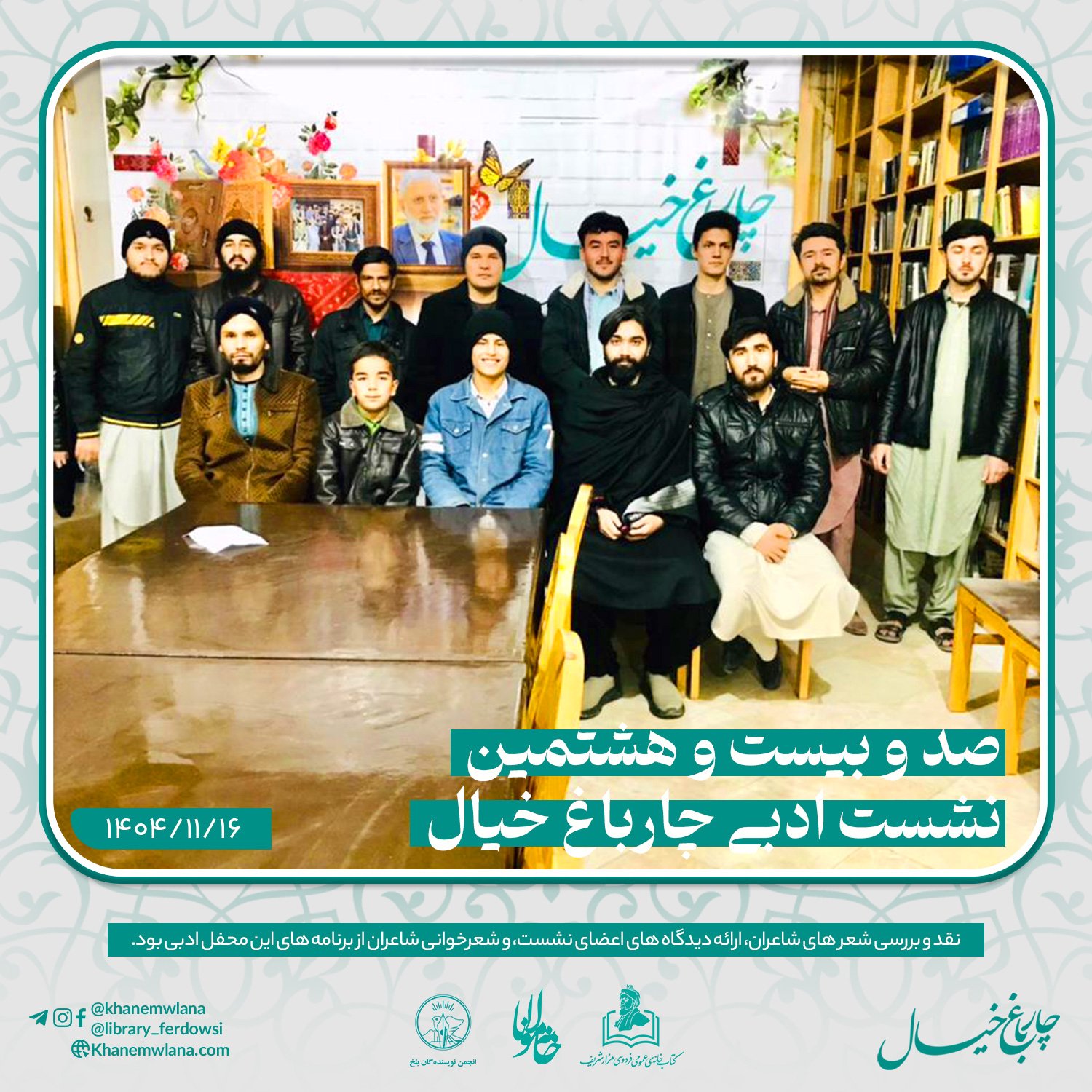صد و بیست و هشتمین نشست ادبی «چارباغ خیال» در بلخ،بعد از ظهر روز پنجشنبه شانزدهم دلو (بهمنماه) ۱۴۰۴ خورشیدی، با مقدمه و گردانندگی حمزهی “عابر” آغاز گردید. این نشست با تلاش انجمن ادبی خانه مولانا، انجمن نویسندگان بلخ و همکاری کتابخانه عمومی فردوسی مزارشریف، برگزار شد.