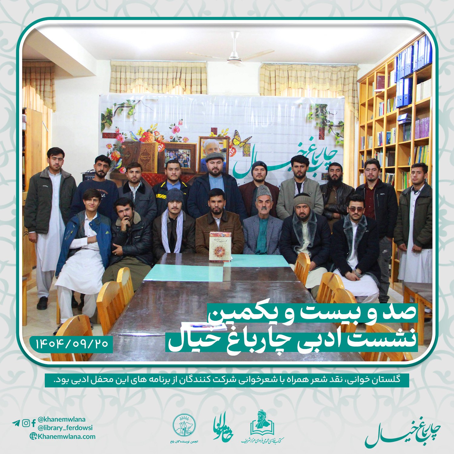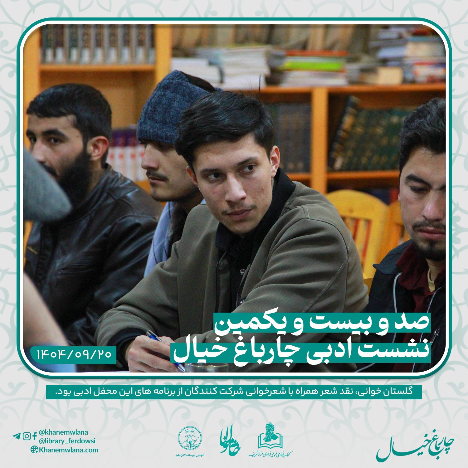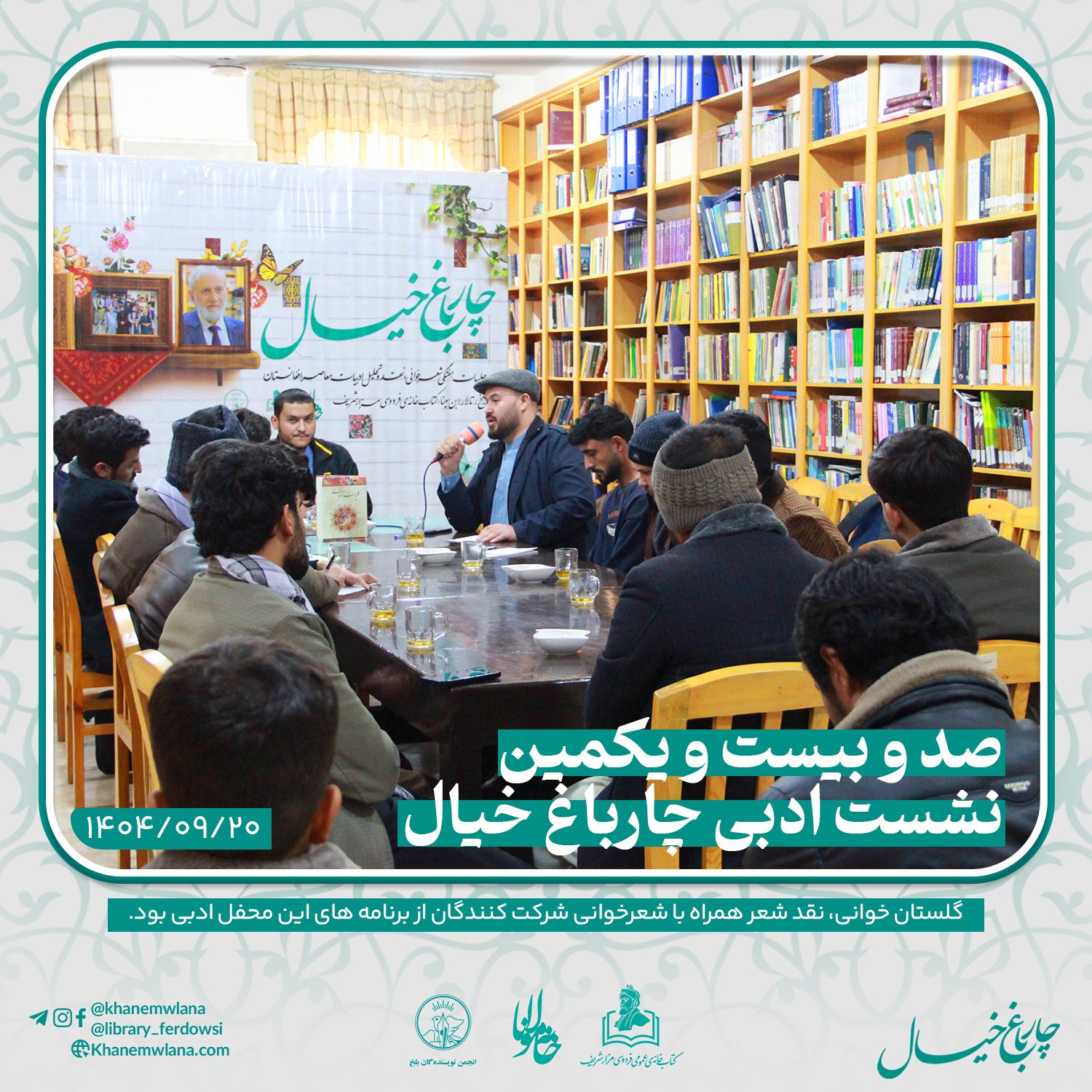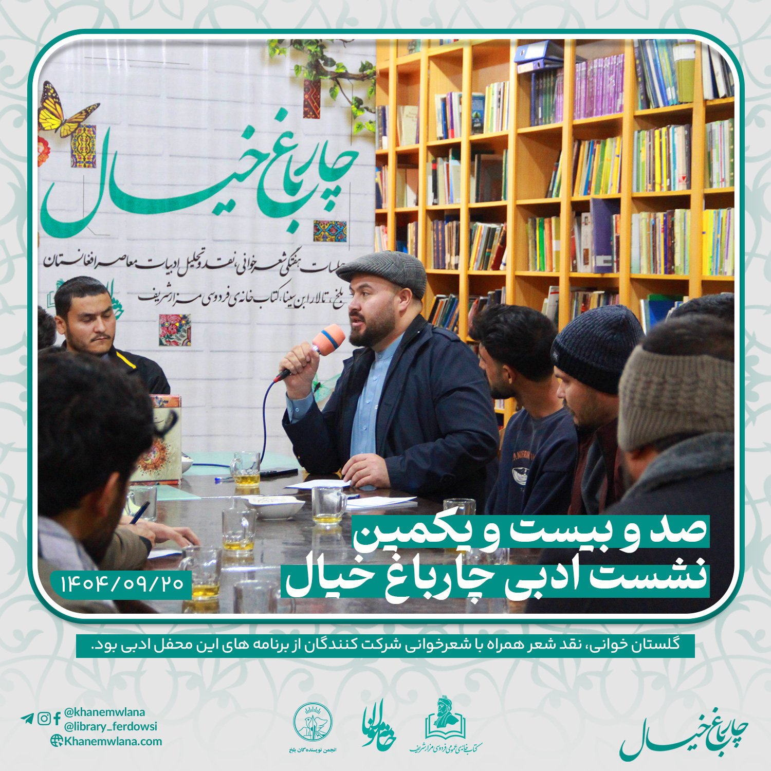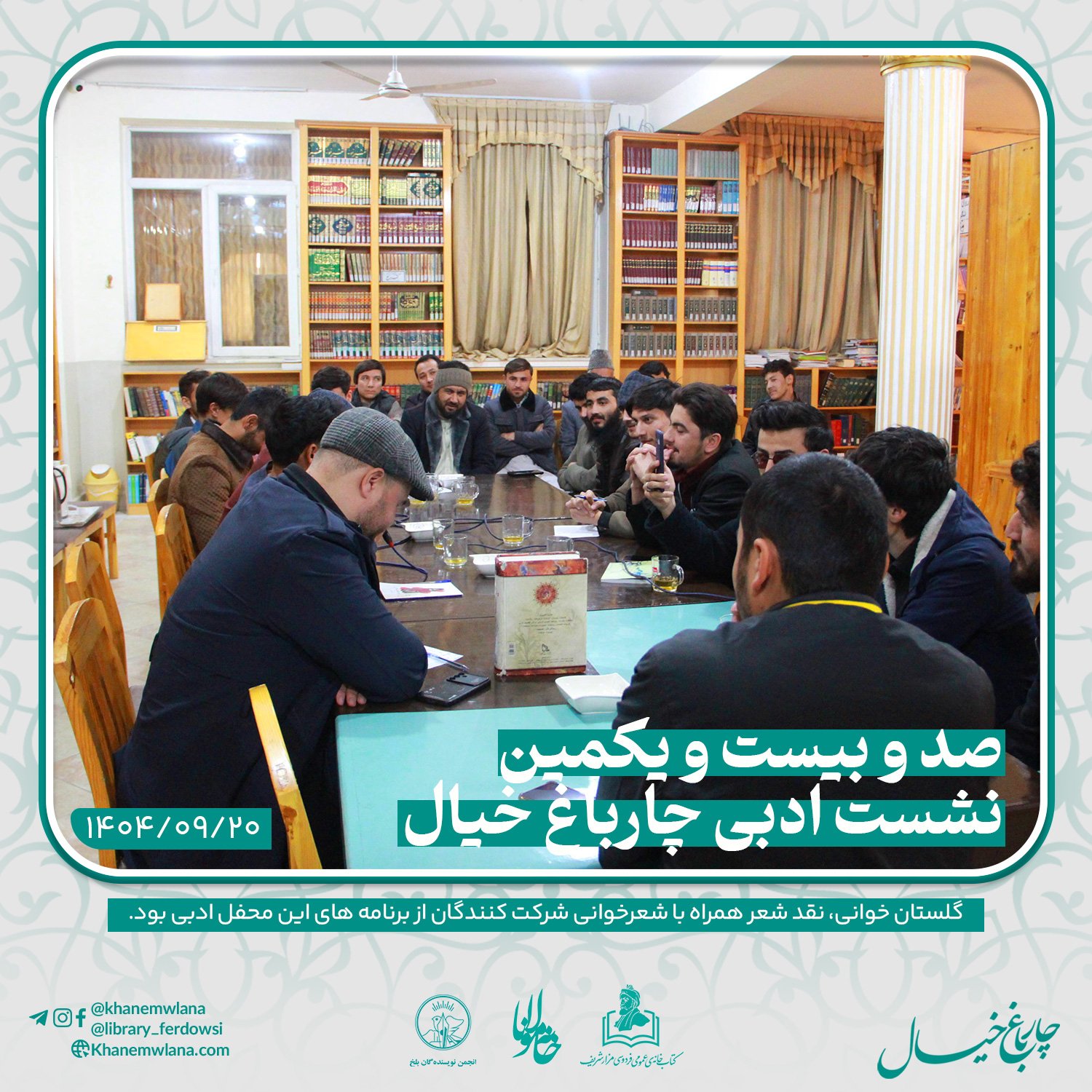 صدو بیست و یکمین نشست ادبی «چارباغ خیال» در بلخ، بعدازظهر روز پنجشنبه ۲۰ قوس (آذرماه) ۱۴۰۴ خورشیدی، با مقدمه و گردانندگی آقای علیرضا خاکی آغاز شد و سپس در سه بخش خوانش متون کلاسیک، نقد و بررسی شعر و خوشخوانی شعر ادامه یافت و به پایان رسید.
