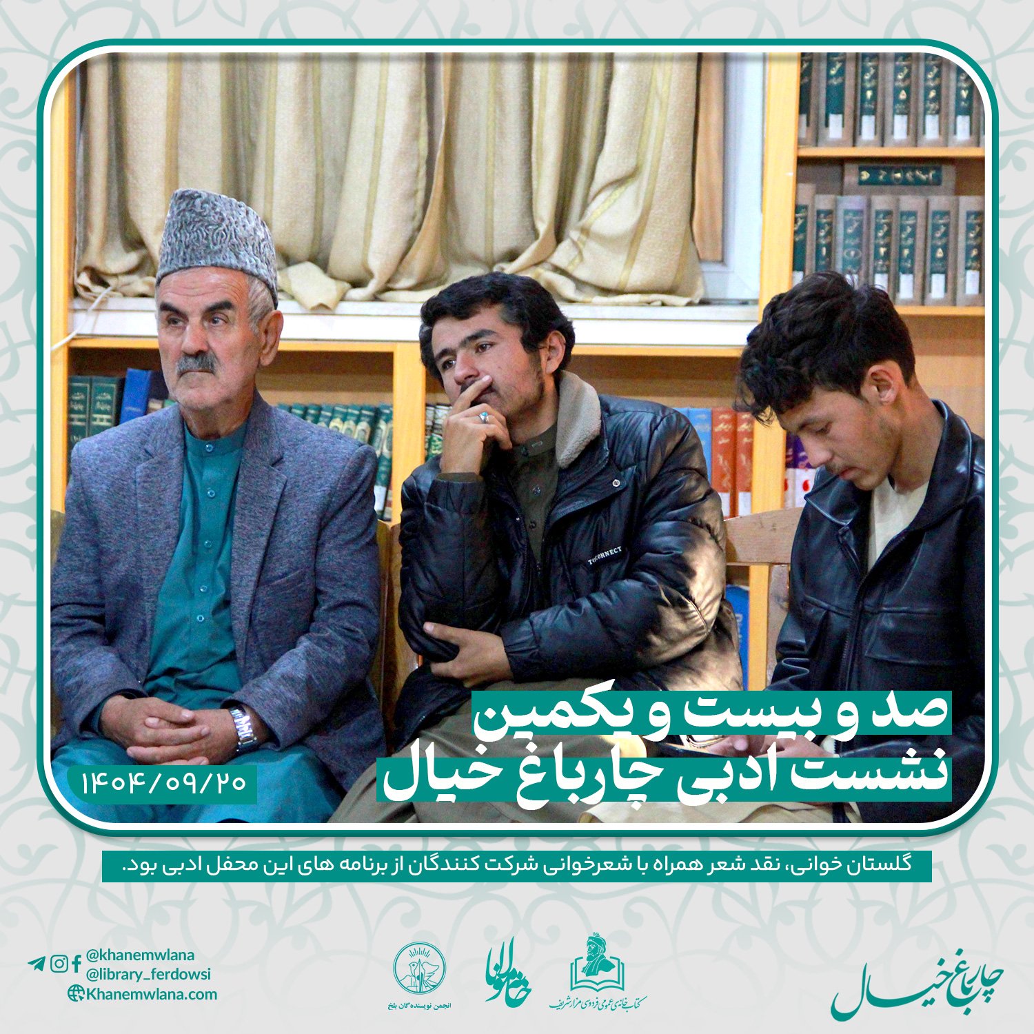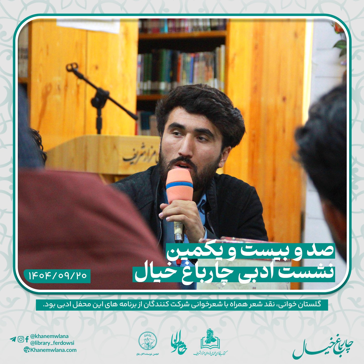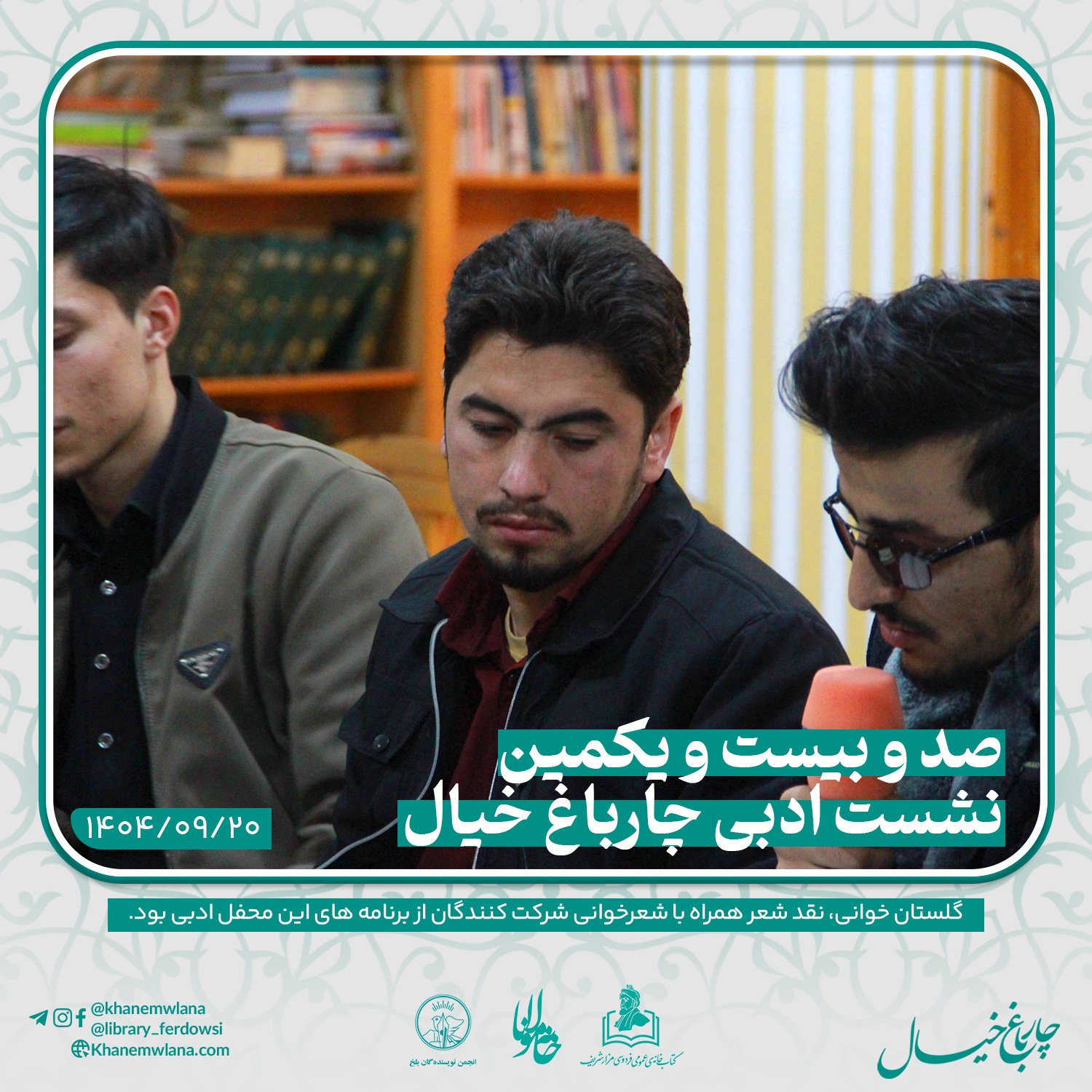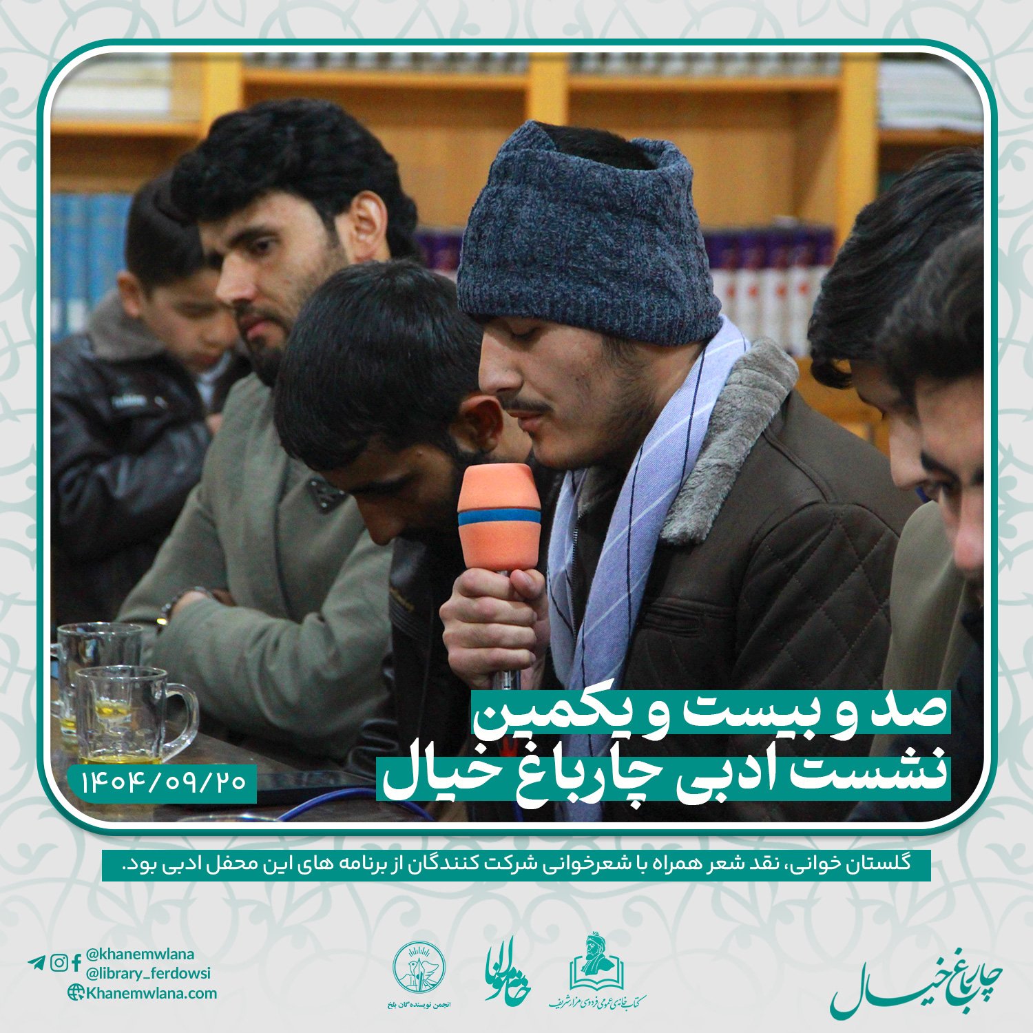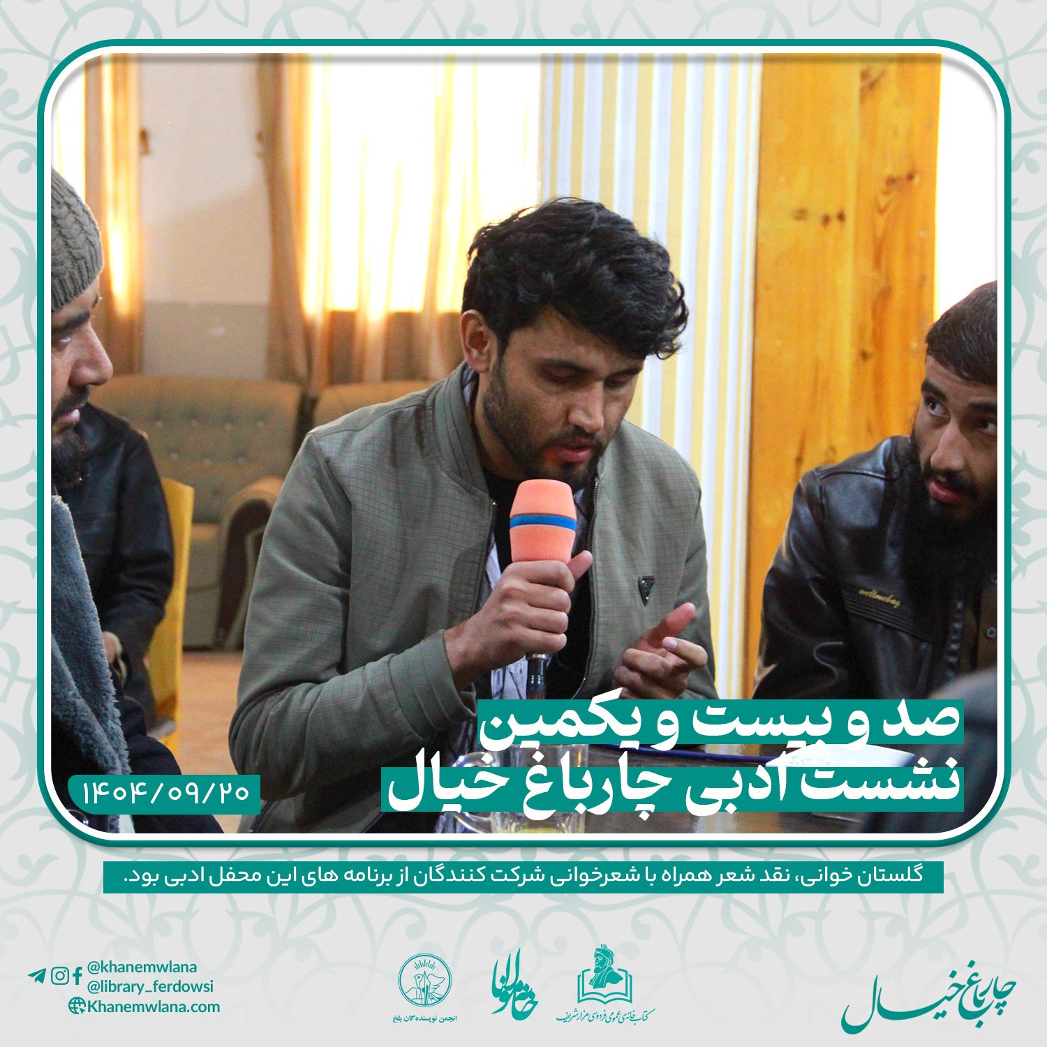 صدو بیست و یکمین نشست ادبی «چارباغ خیال» در بلخ، بعدازظهر روز پنجشنبه ۲۰ قوس (آذرماه) ۱۴۰۴ خورشیدی، با مقدمه و گردانندگی آقای علیرضا خاکی آغاز شد و سپس در سه بخش خوانش متون کلاسیک، نقد و بررسی شعر و خوشخوانی شعر ادامه یافت و به پایان رسید.