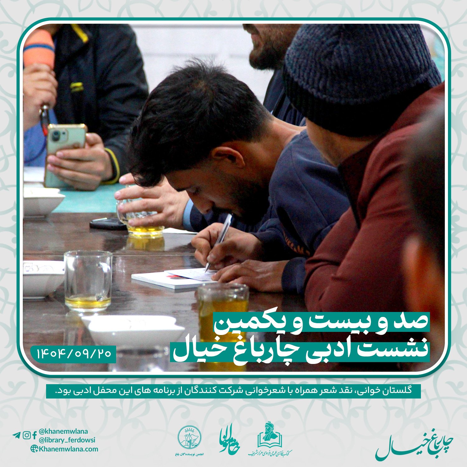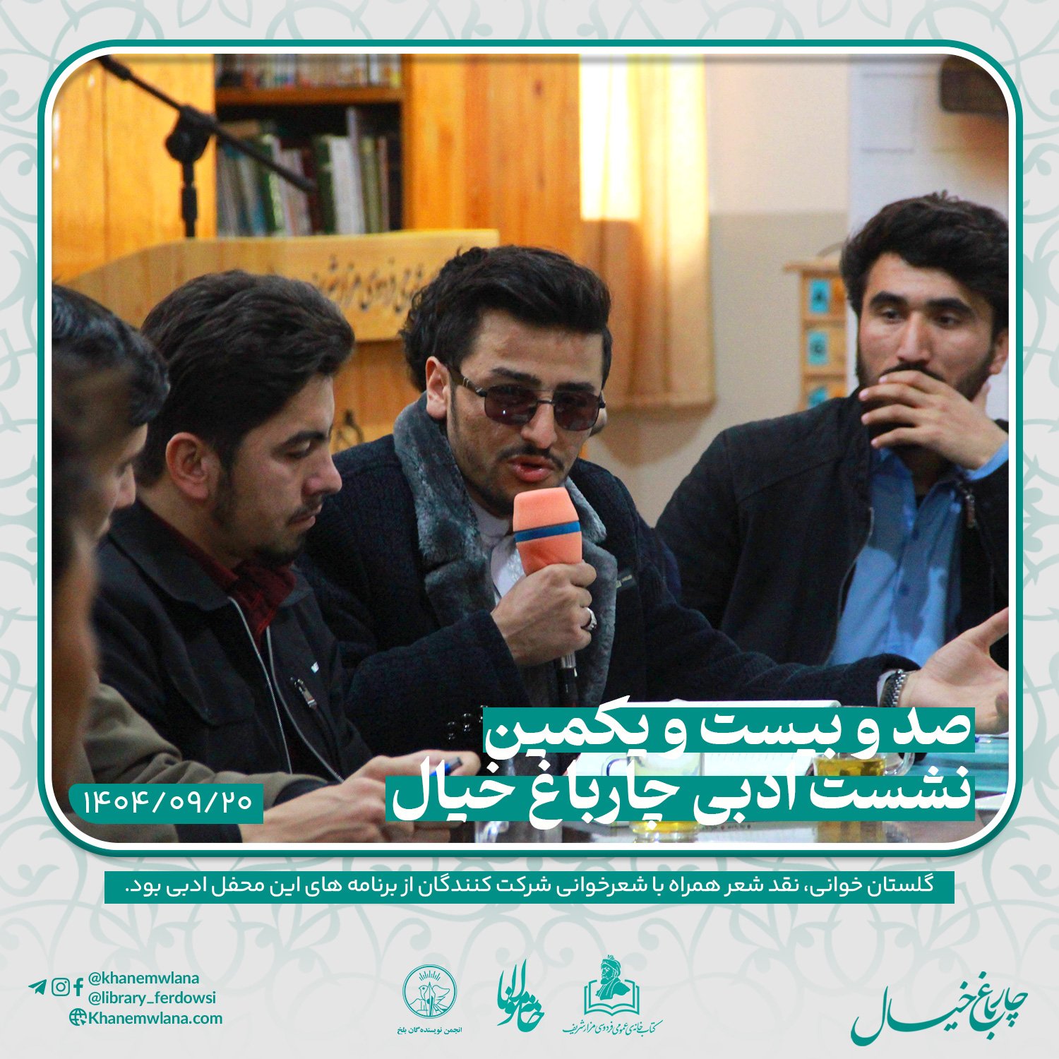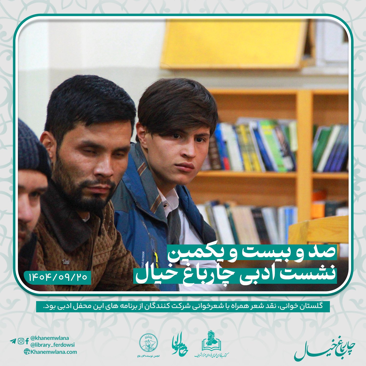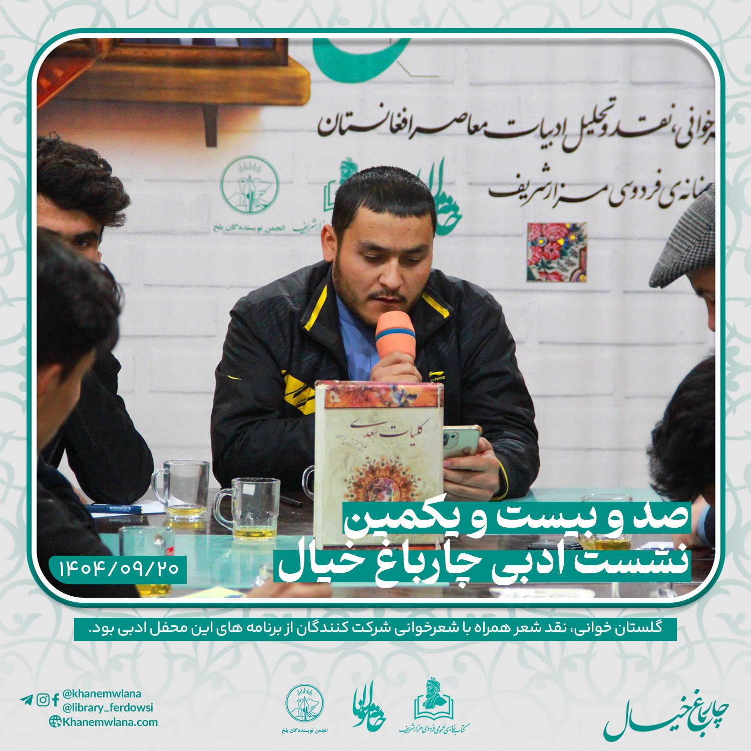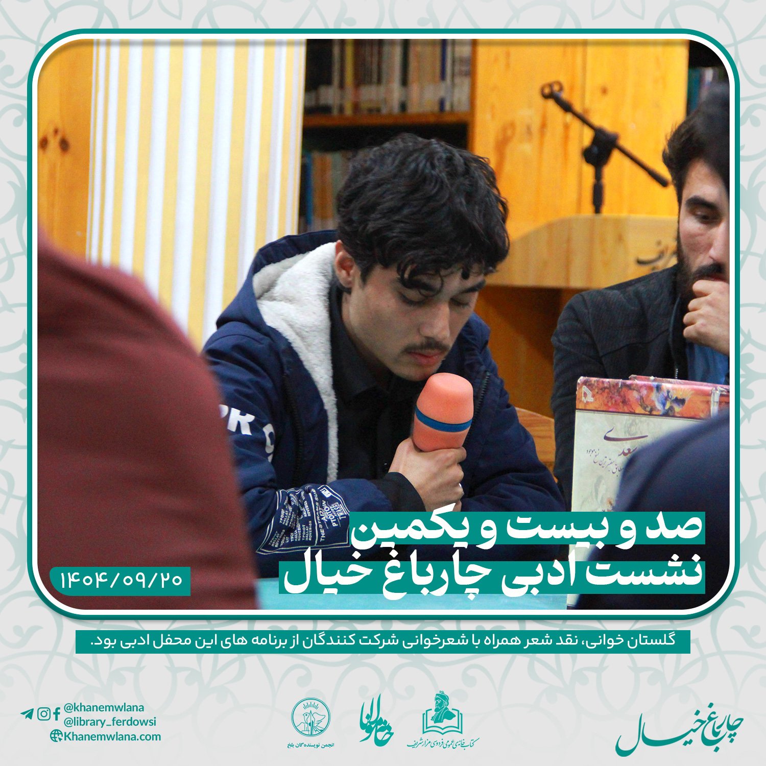 صدو بیست و یکمین نشست ادبی «چارباغ خیال» در بلخ، بعدازظهر روز پنجشنبه ۲۰ قوس (آذرماه) ۱۴۰۴ خورشیدی، با مقدمه و گردانندگی آقای علیرضا خاکی آغاز شد و سپس در سه بخش خوانش متون کلاسیک، نقد و بررسی شعر و خوشخوانی شعر ادامه یافت و به پایان رسید.