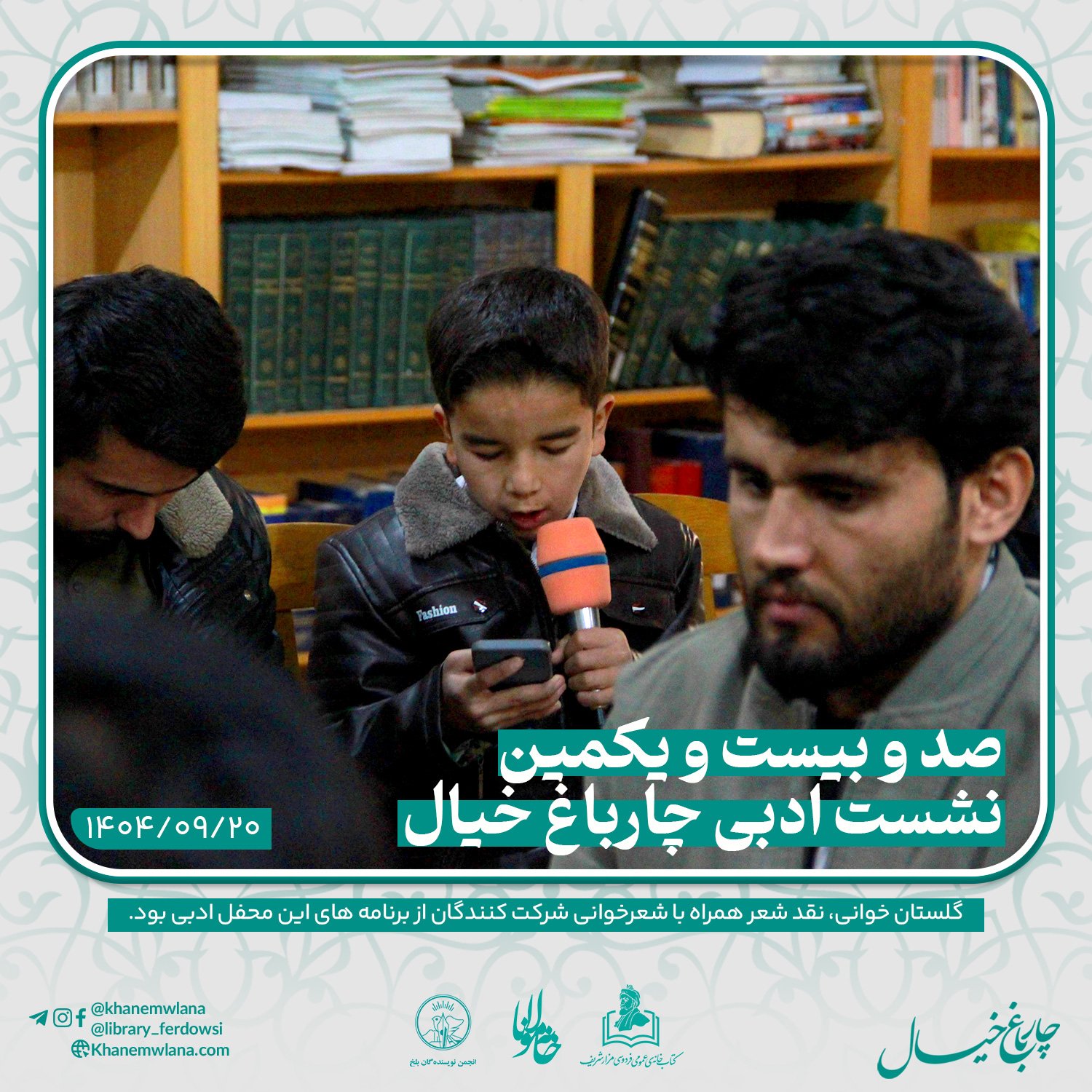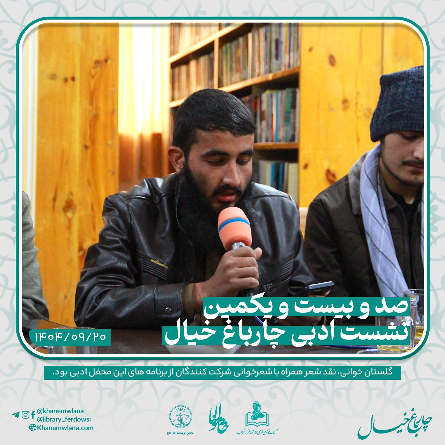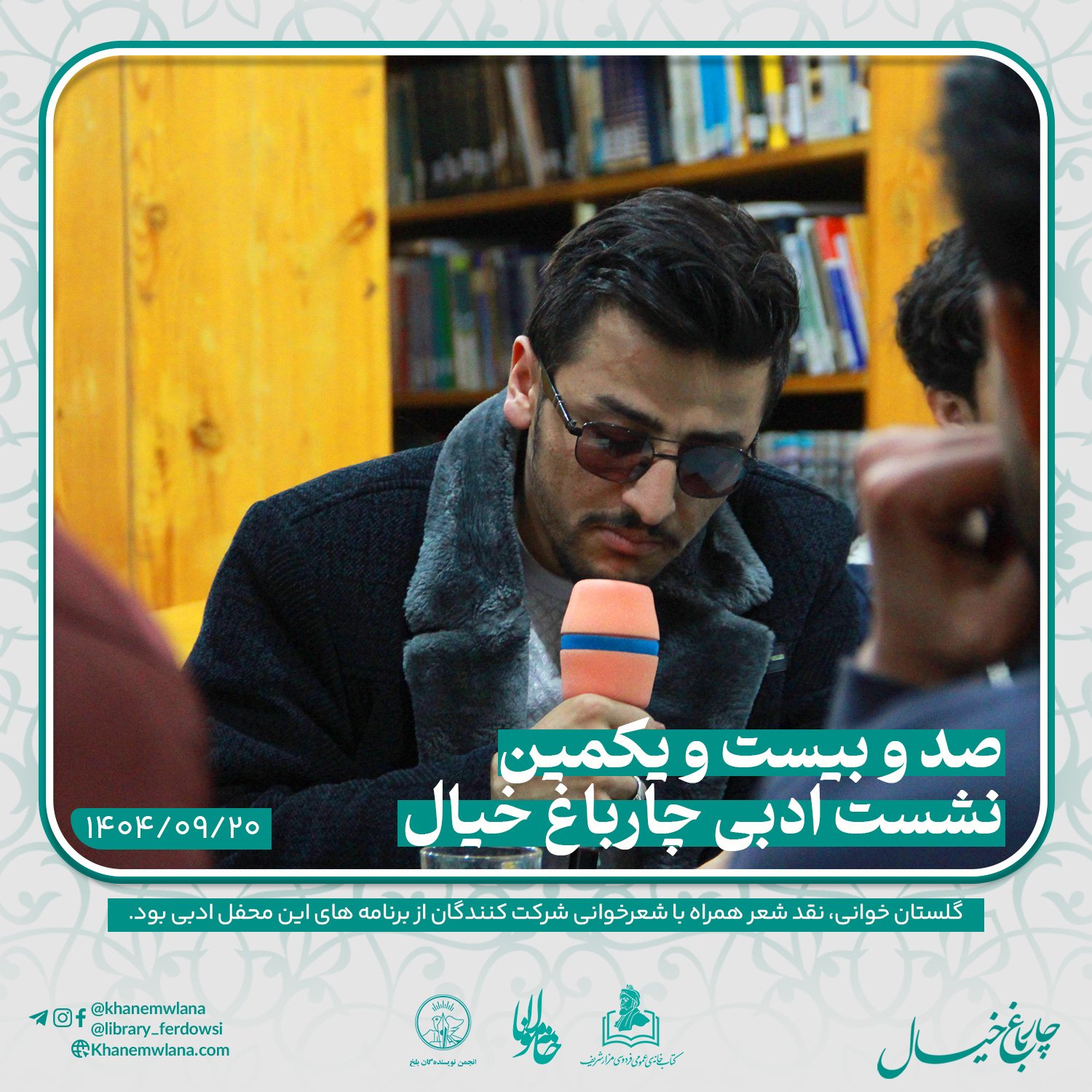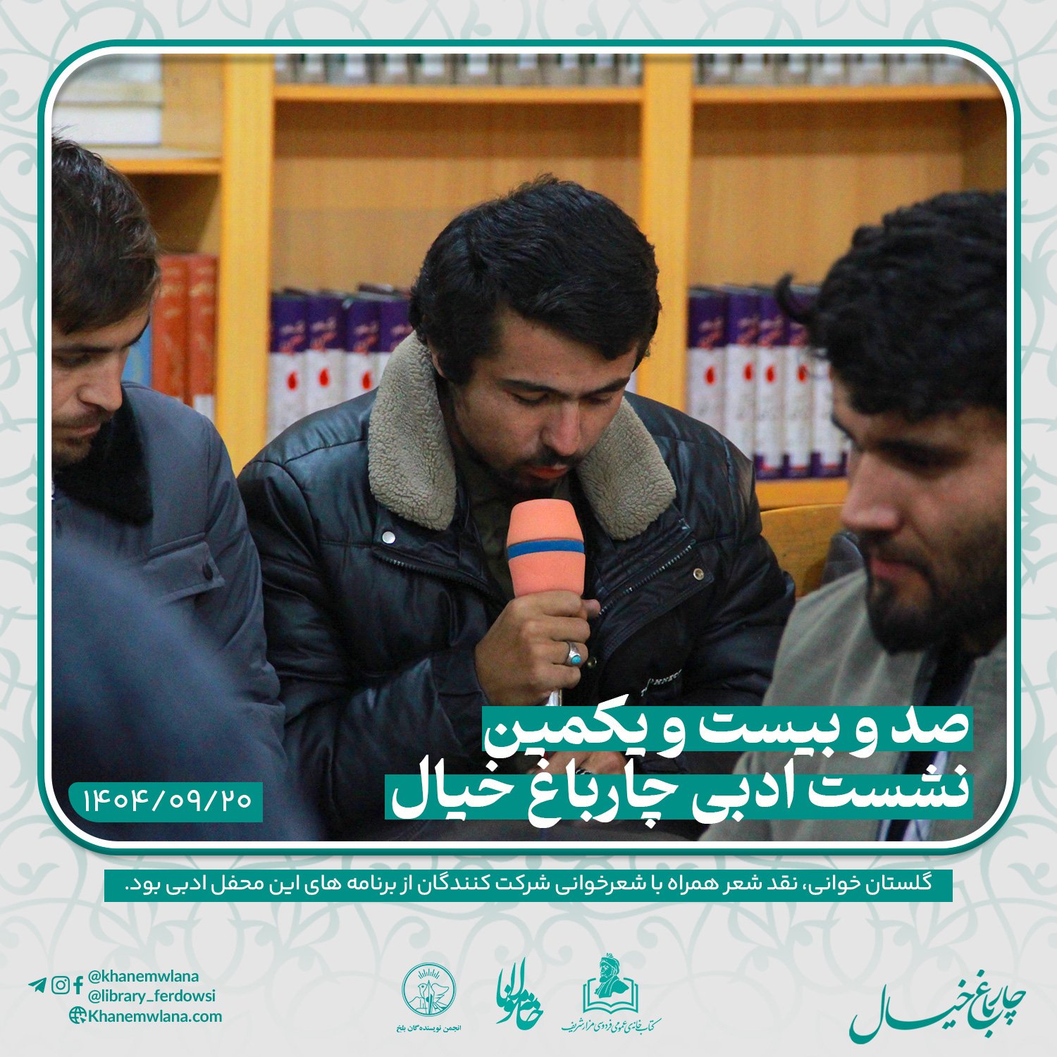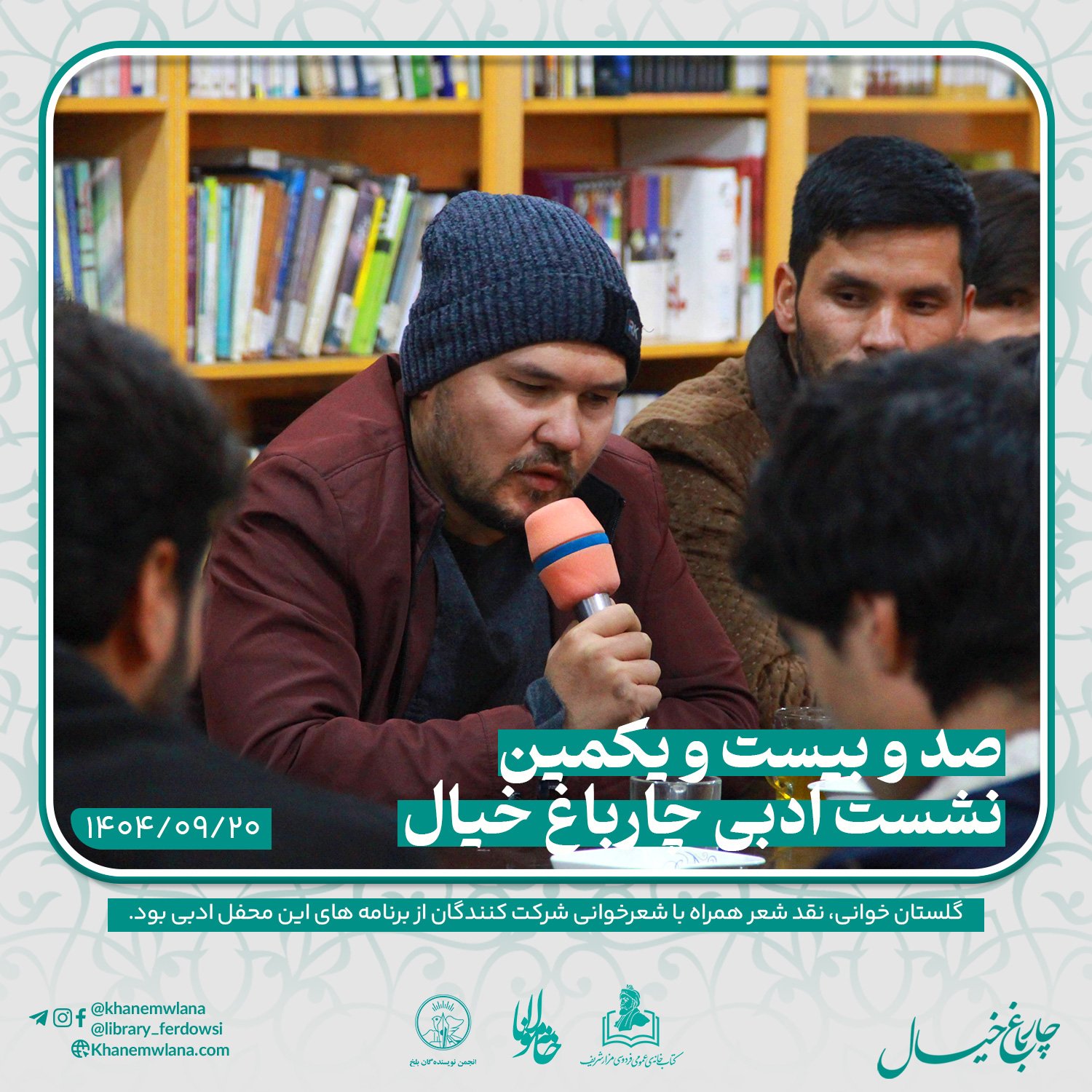 صدو بیست و یکمین نشست ادبی «چارباغ خیال» در بلخ، بعدازظهر روز پنجشنبه ۲۰ قوس (آذرماه) ۱۴۰۴ خورشیدی، با مقدمه و گردانندگی آقای علیرضا خاکی آغاز شد و سپس در سه بخش خوانش متون کلاسیک، نقد و بررسی شعر و خوشخوانی شعر ادامه یافت و به پایان رسید.