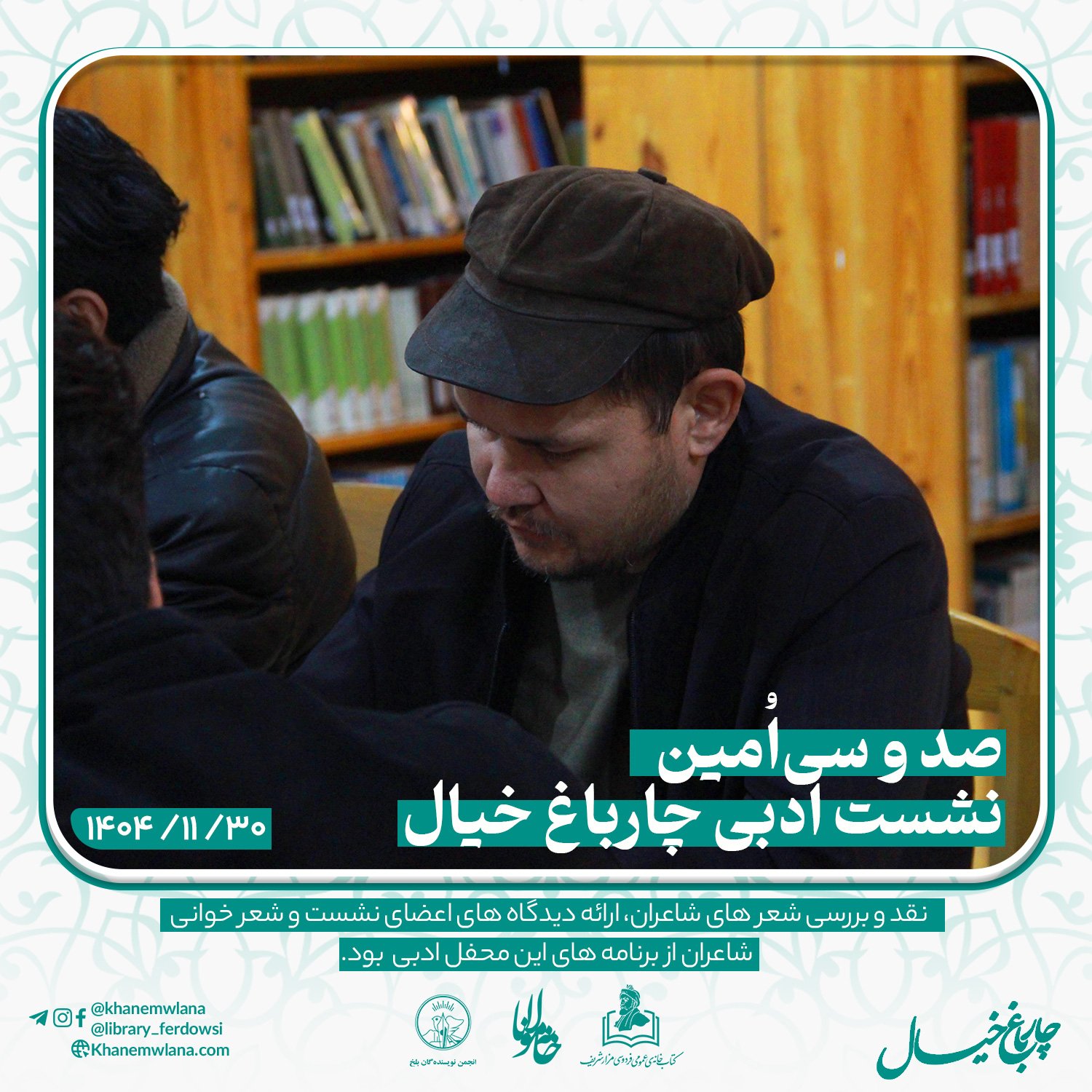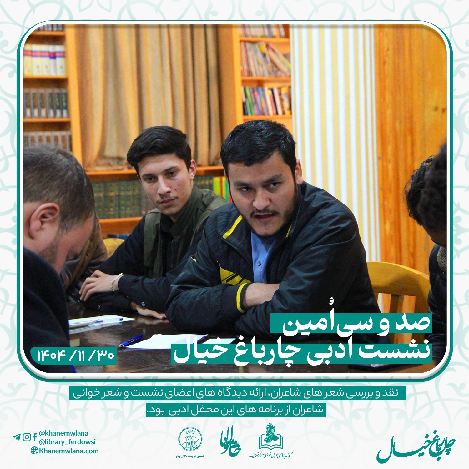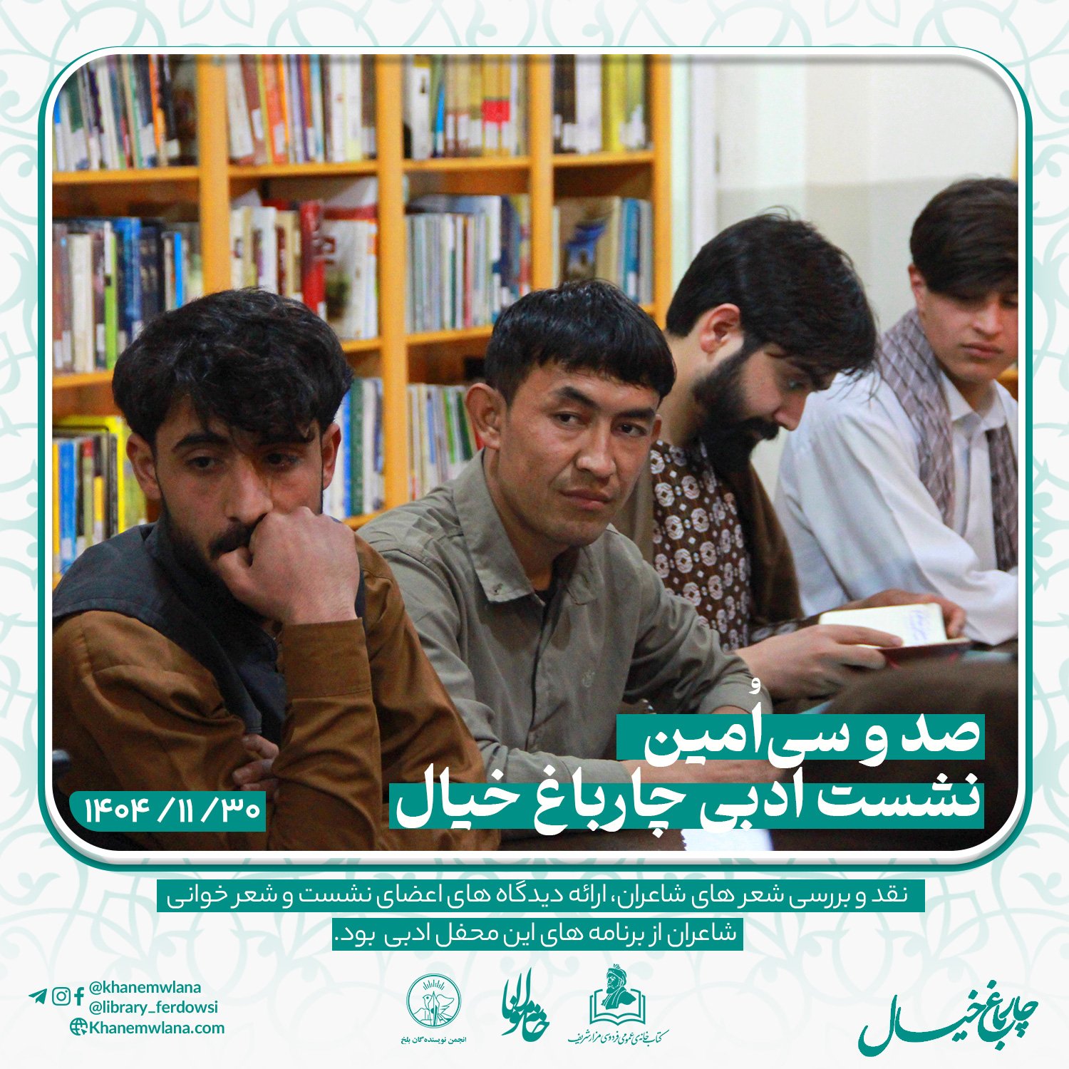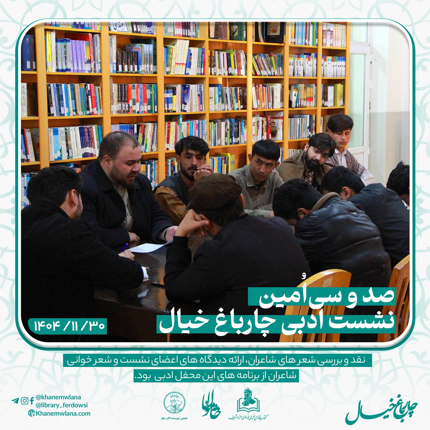 صد و سیامین نشست ادبی «چارباغ خیال» در بلخ، بعد از ظهر روز پنجشنبه ۳۰ دلو (بهمنماه) ۱۴۰۴ خورشیدی، با هماهنگی انجمن ادبی خانهی مولانا و انجمن نویسندگان بلخ، با همکاری کتابخانهی عمومی فردوسی، در مخزن همان کتابخانه برگزار شد. این نشست با حضور شاعران، نویسندگان و علاقهمندان ادبیات فارسی در سه بخش برگزار گردید.