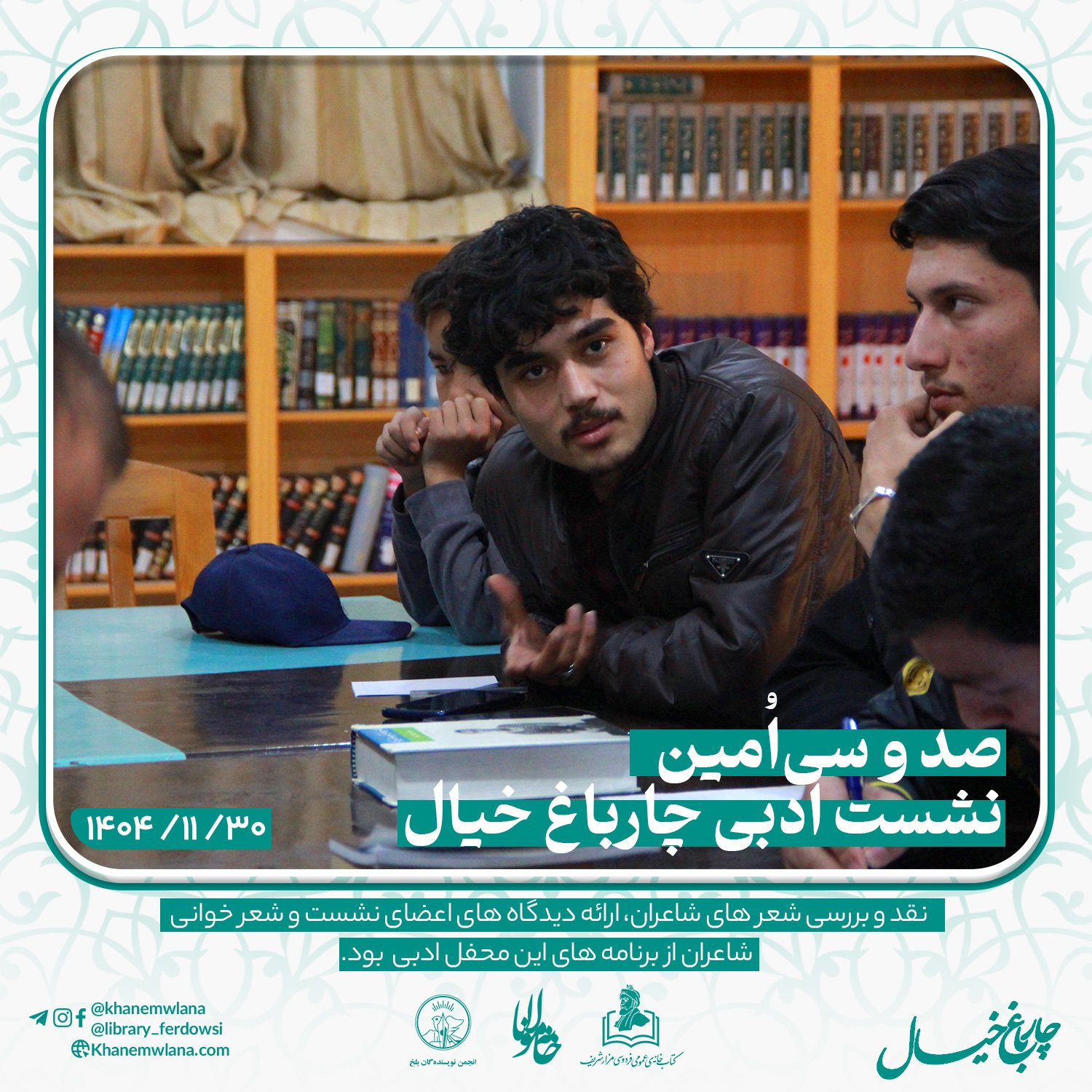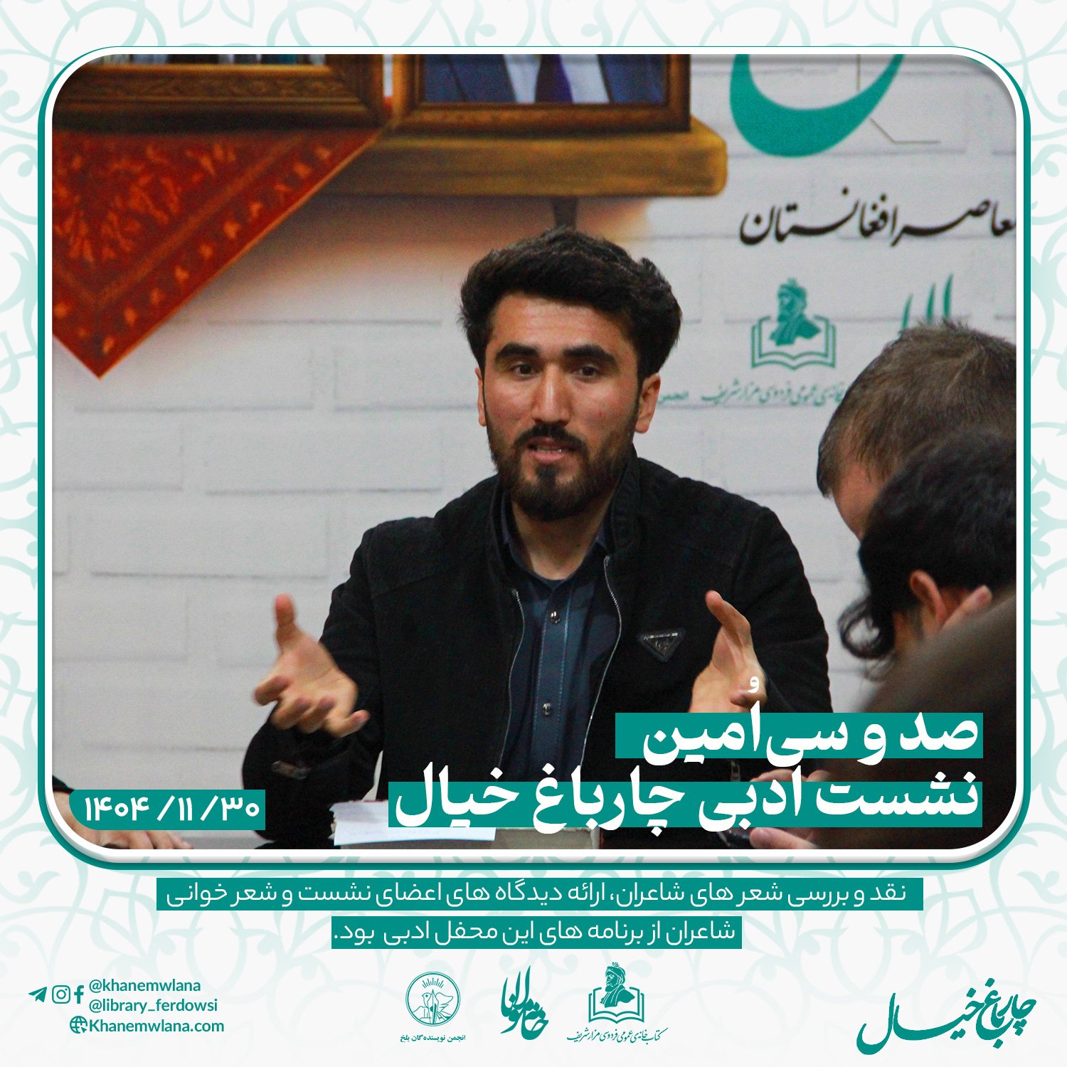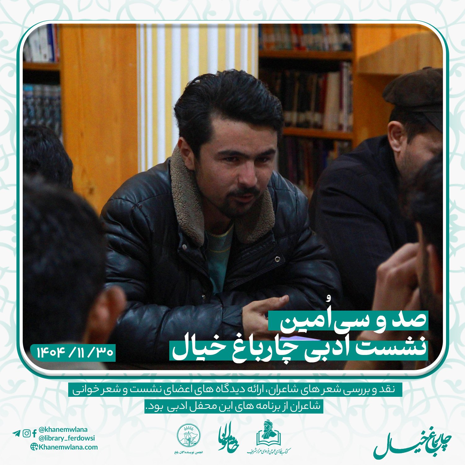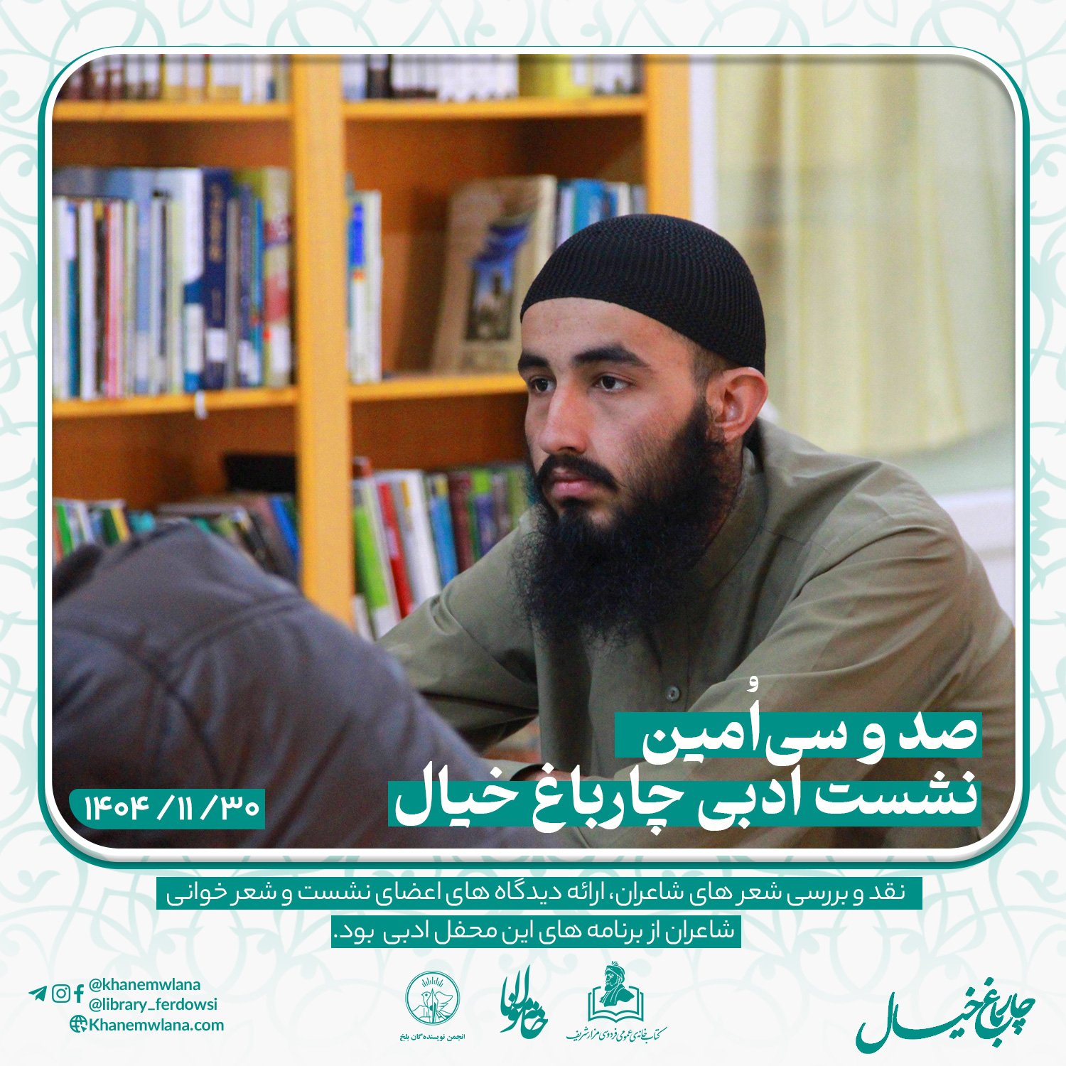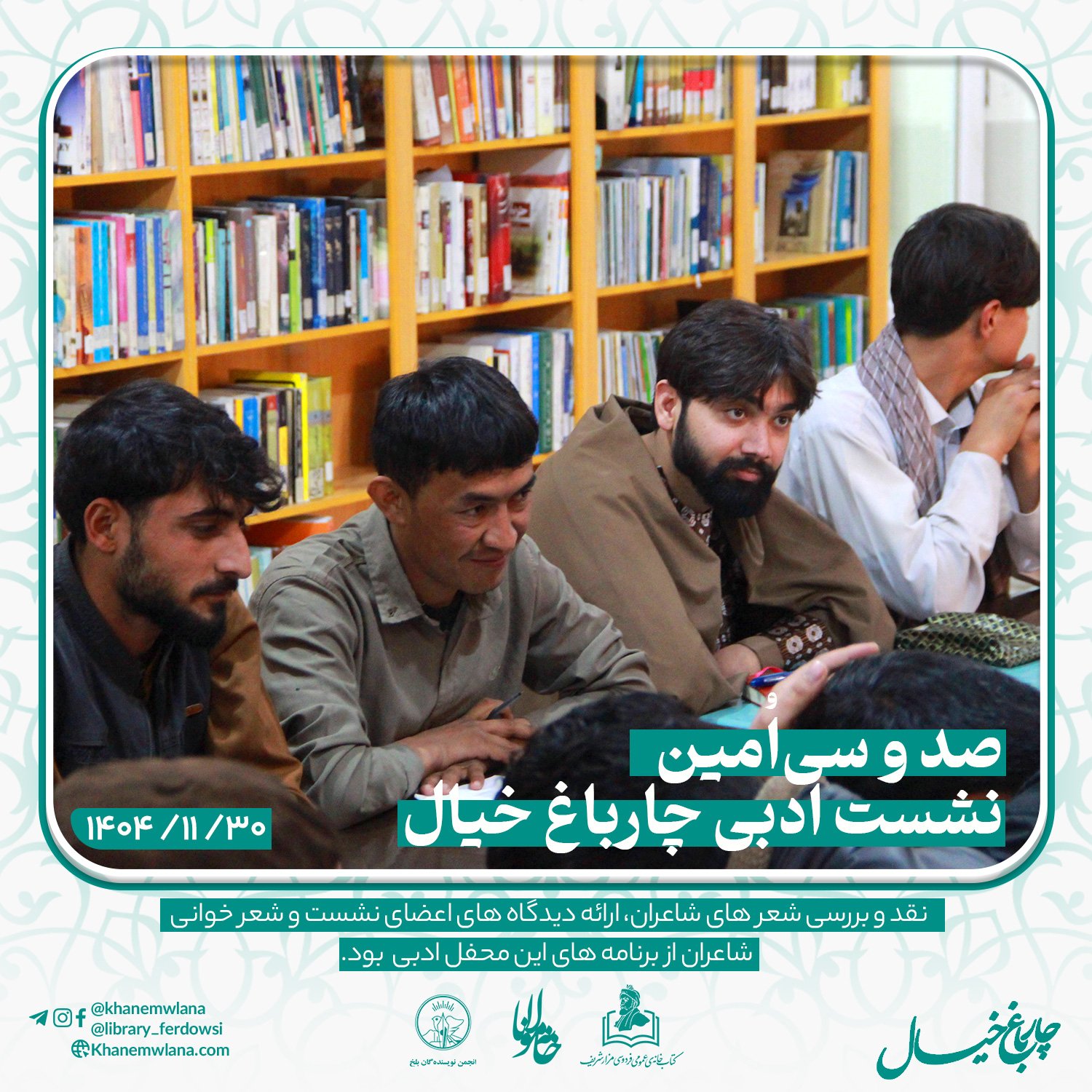 صد و سیامین نشست ادبی «چارباغ خیال» در بلخ، بعد از ظهر روز پنجشنبه ۳۰ دلو (بهمنماه) ۱۴۰۴ خورشیدی، با هماهنگی انجمن ادبی خانهی مولانا و انجمن نویسندگان بلخ، با همکاری کتابخانهی عمومی فردوسی، در مخزن همان کتابخانه برگزار شد. این نشست با حضور شاعران، نویسندگان و علاقهمندان ادبیات فارسی در سه بخش برگزار گردید.