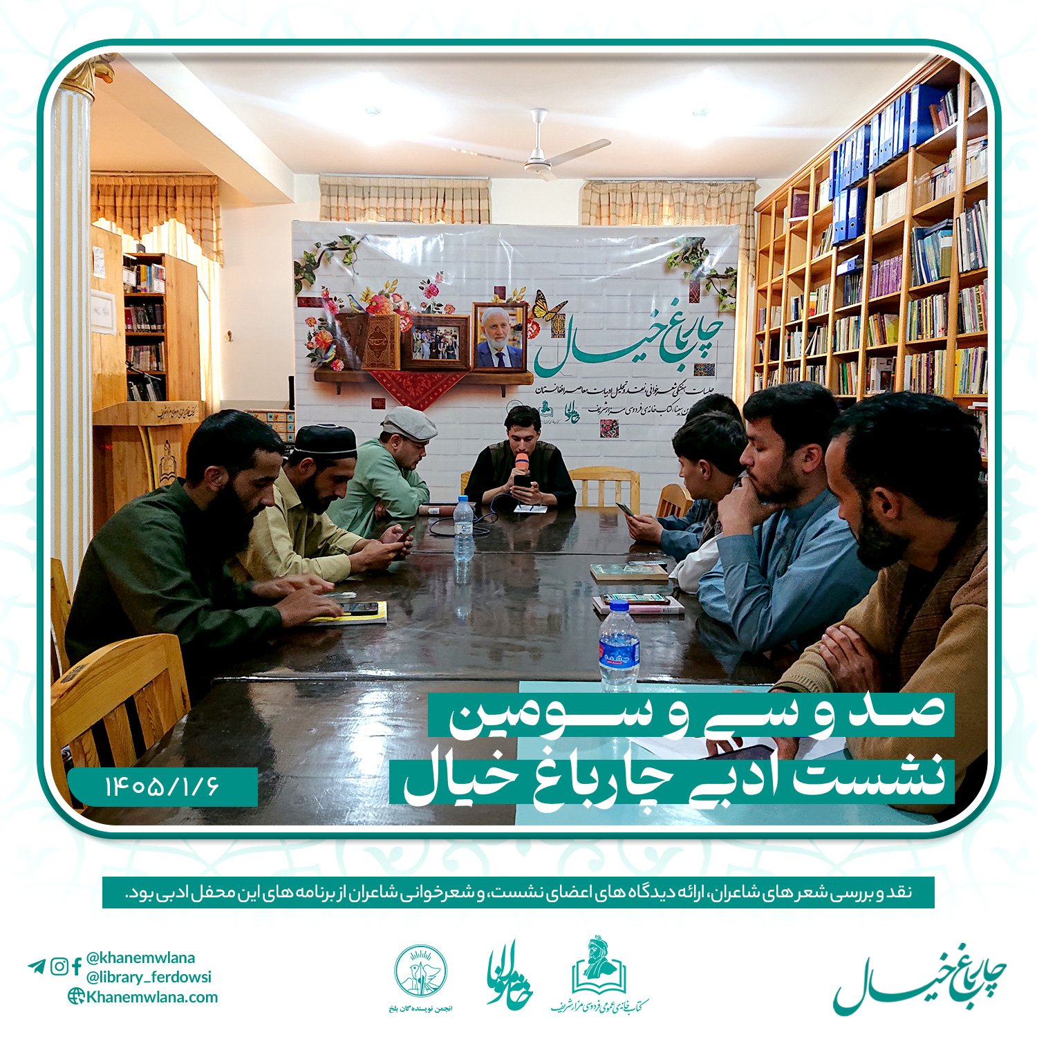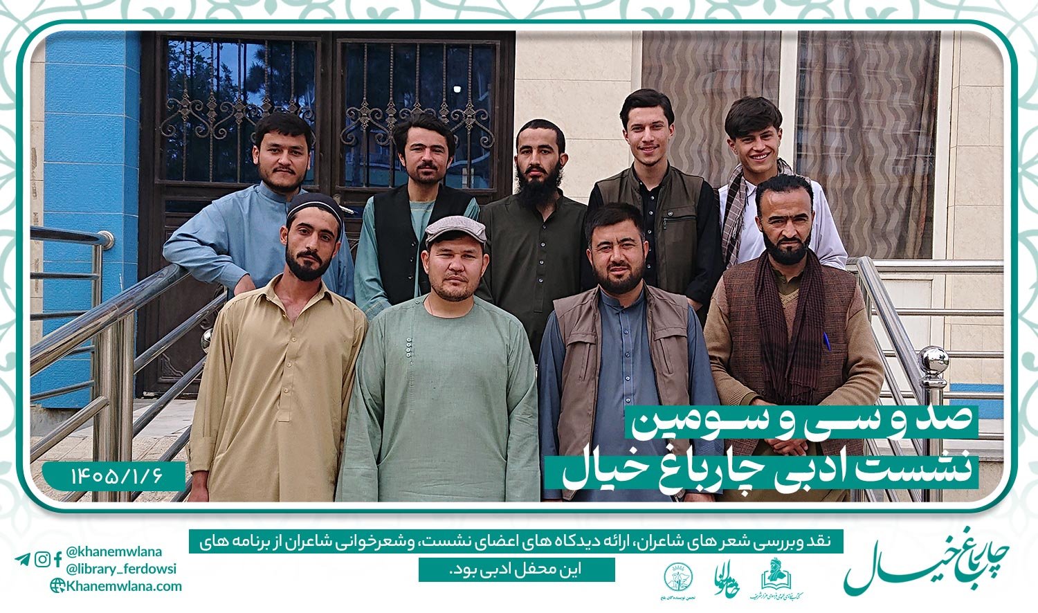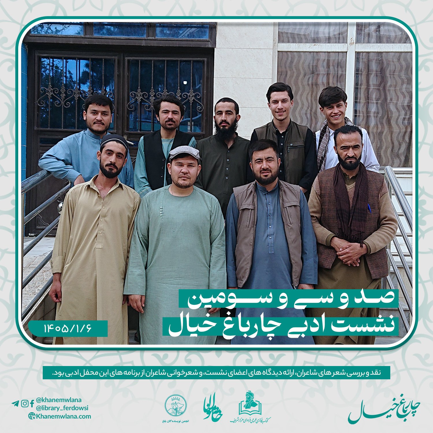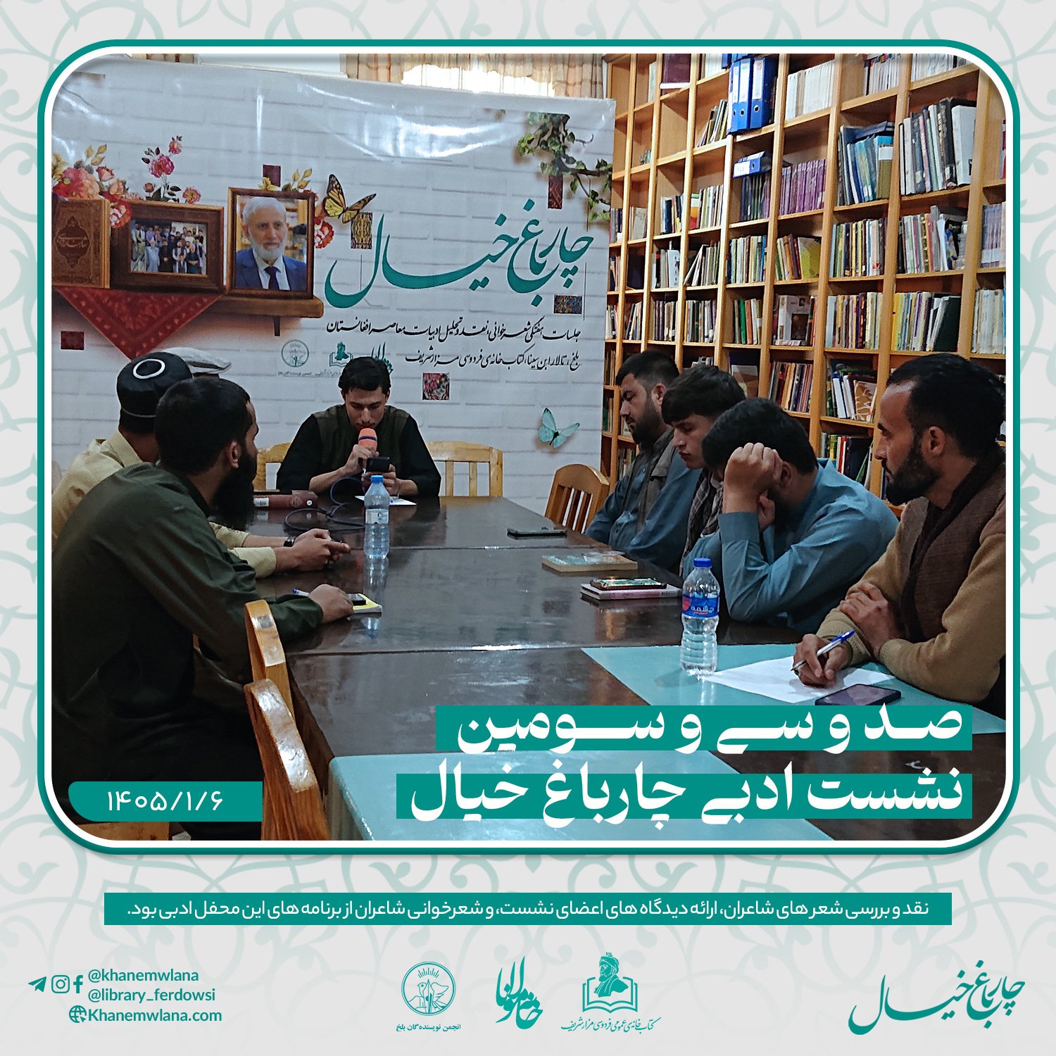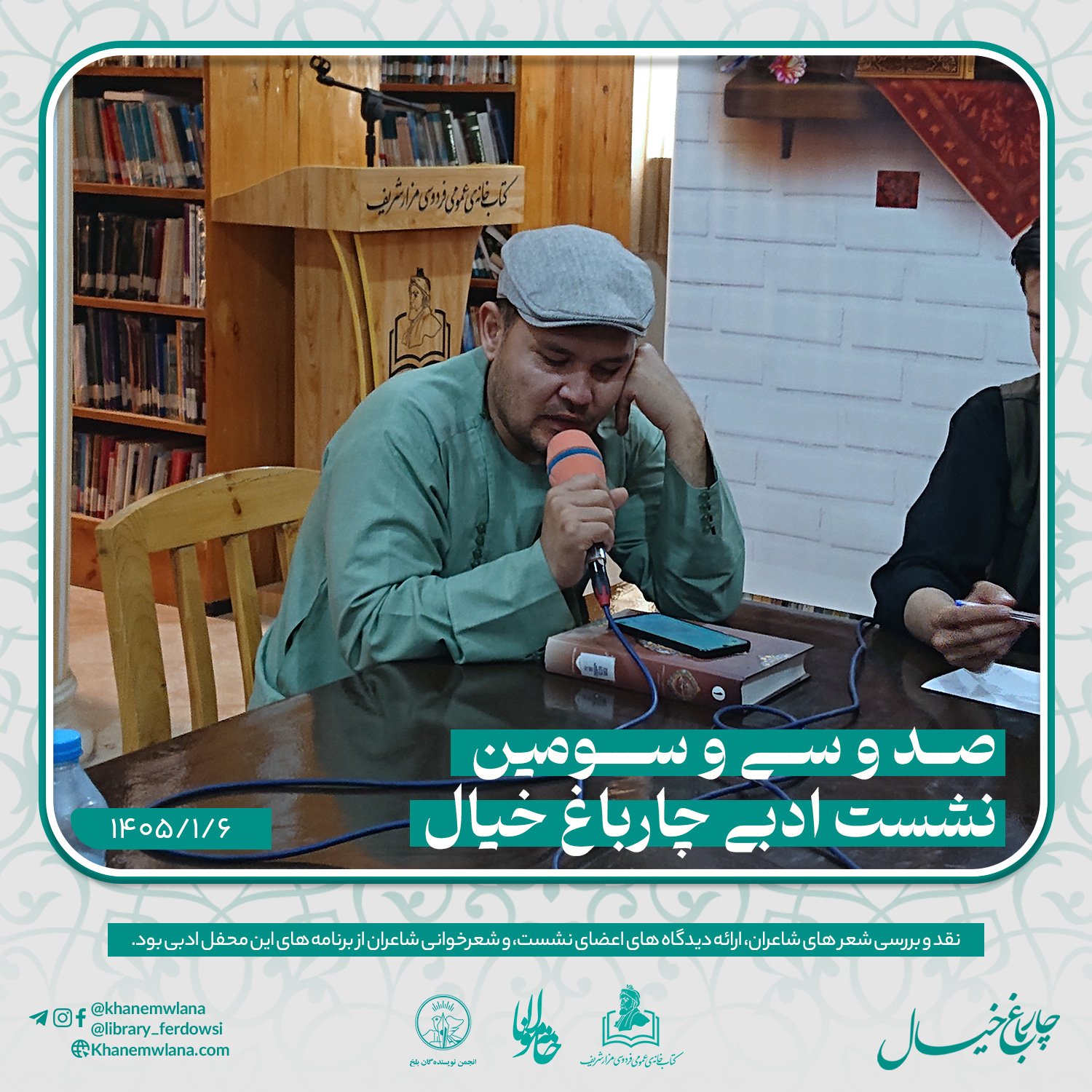 صد و سی و سومین نشستِ ادبی «چارباغ خیال» در بلخ، بعد از ظهر روز پنجشنبه ۶ حمل (فروردین ماه) ۱۴۰۵ هجری خورشیدی، با مقدمه و گردانندگی «سهراب سوشیان» آغاز یافت.