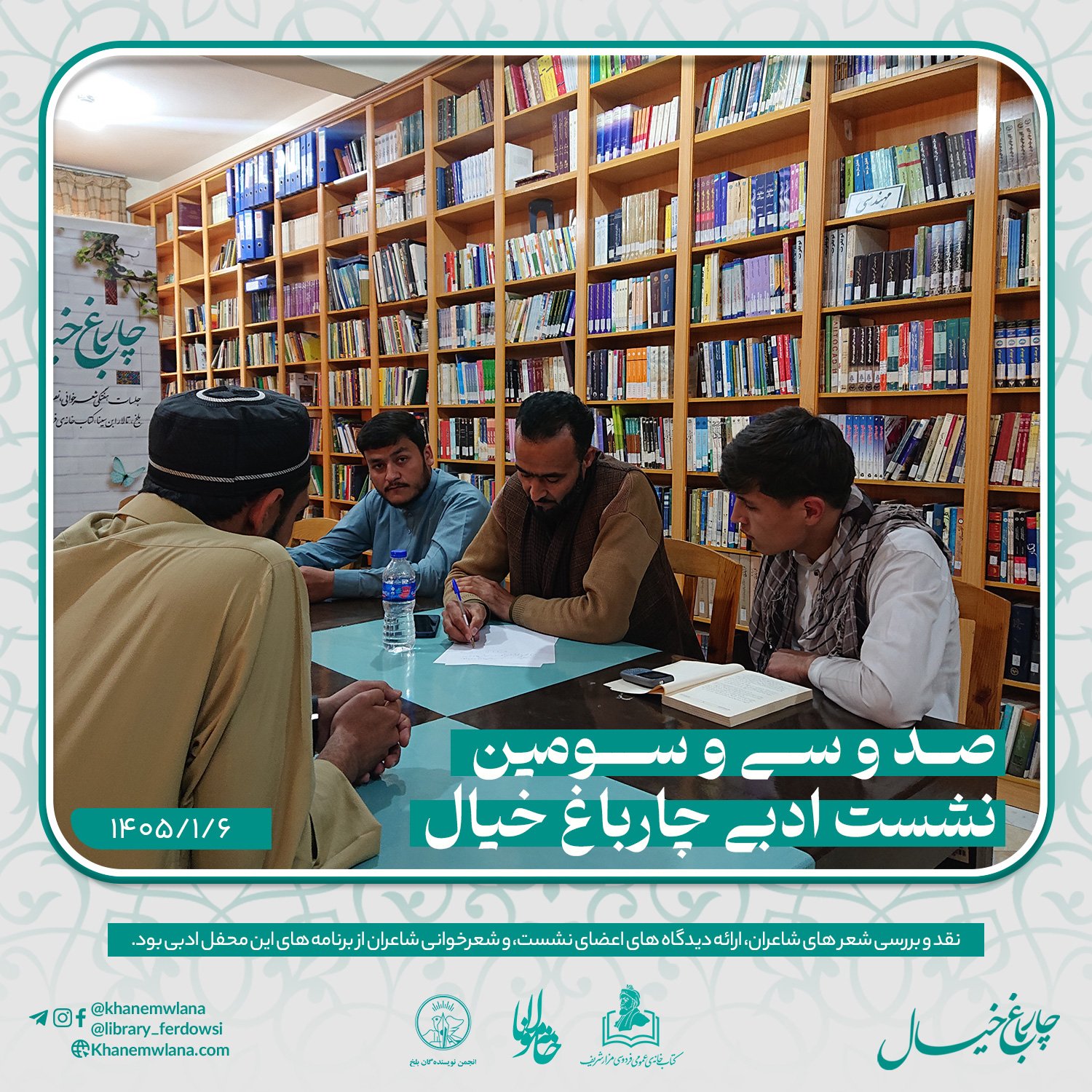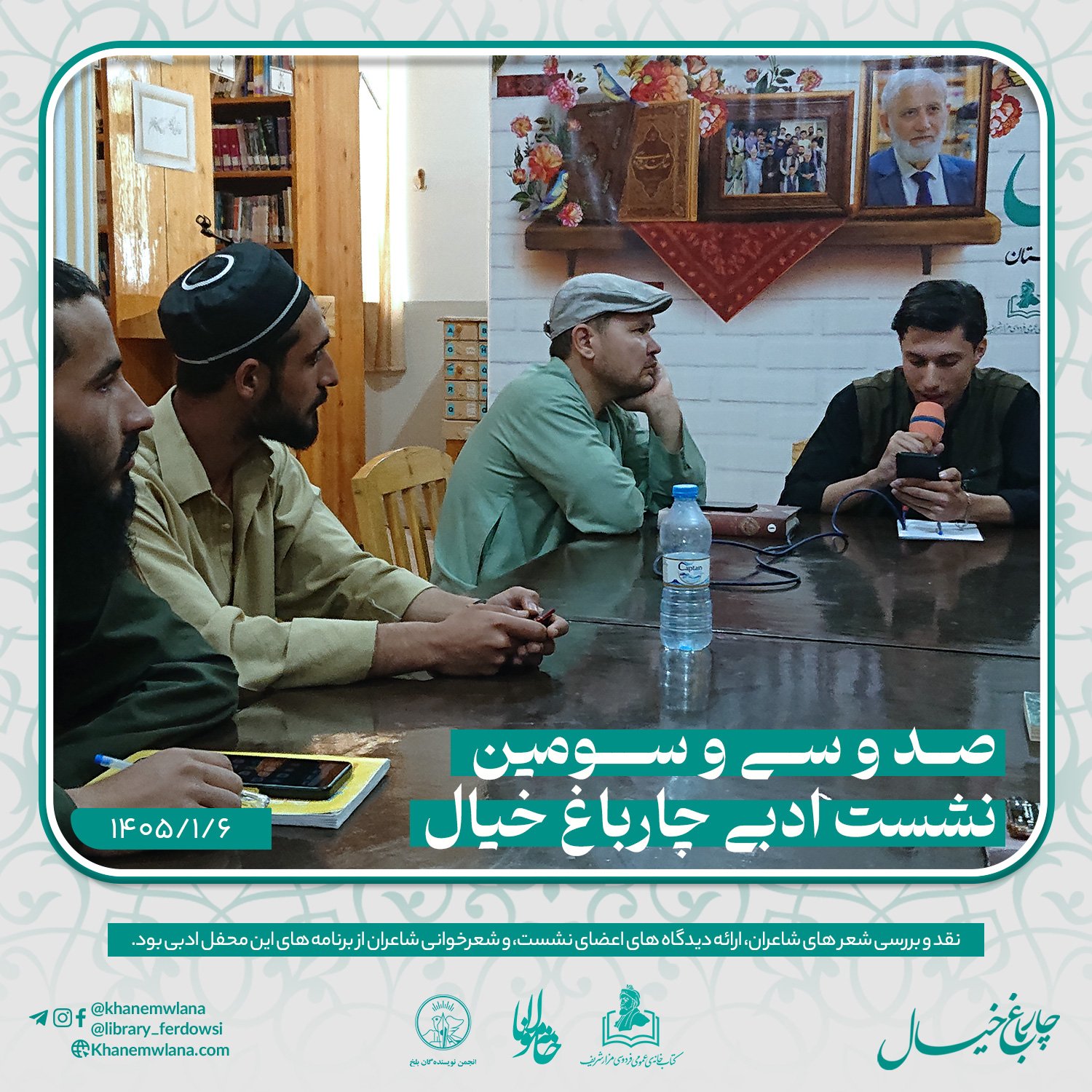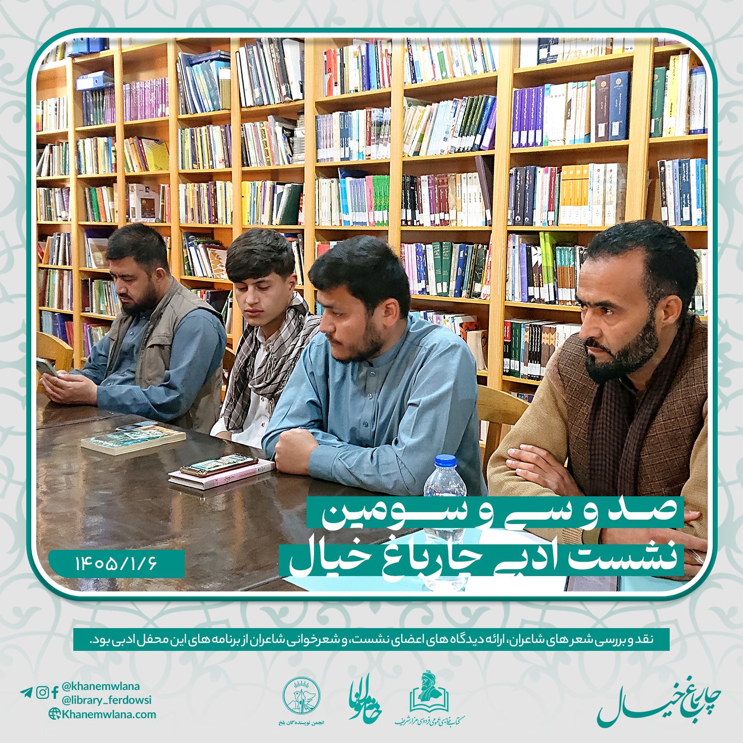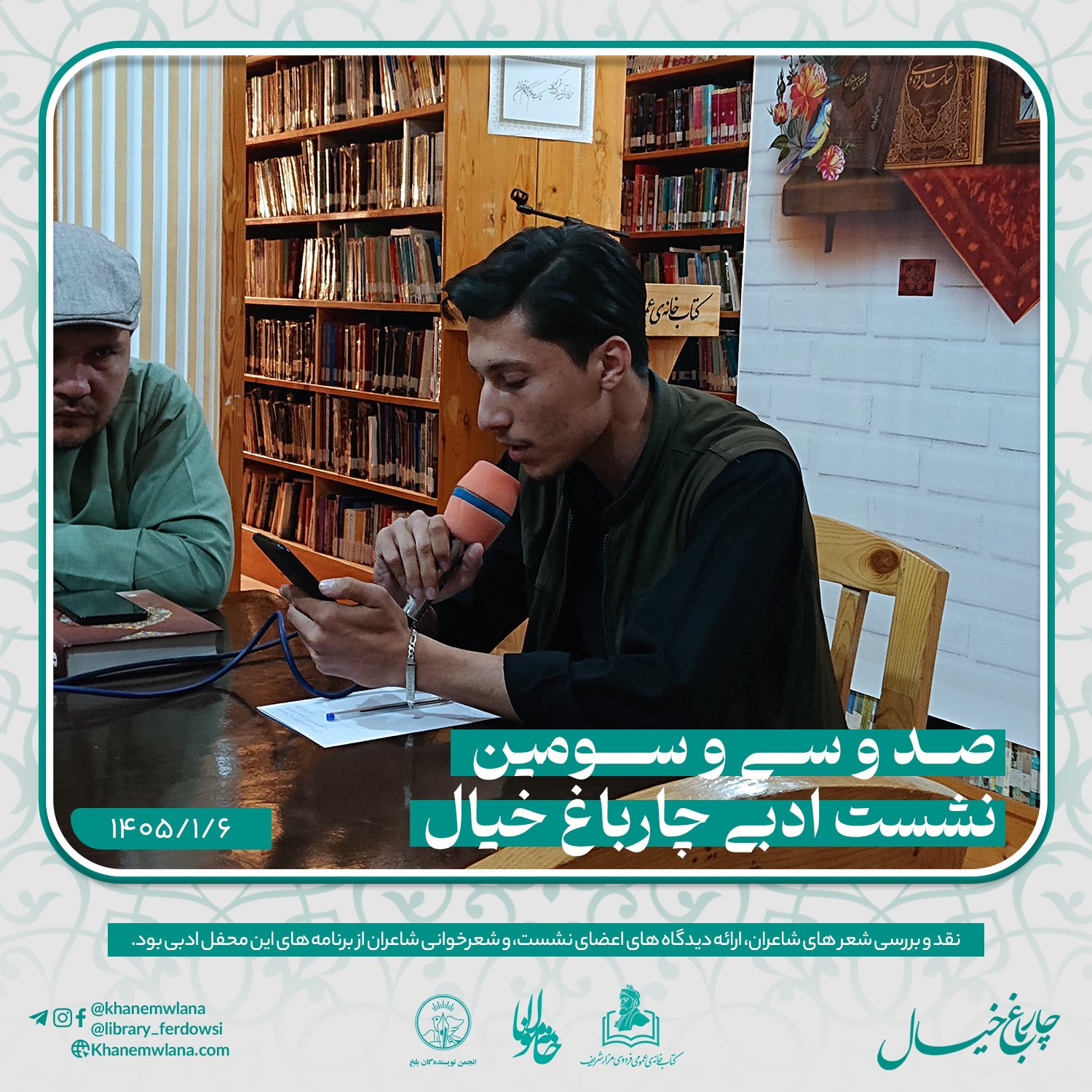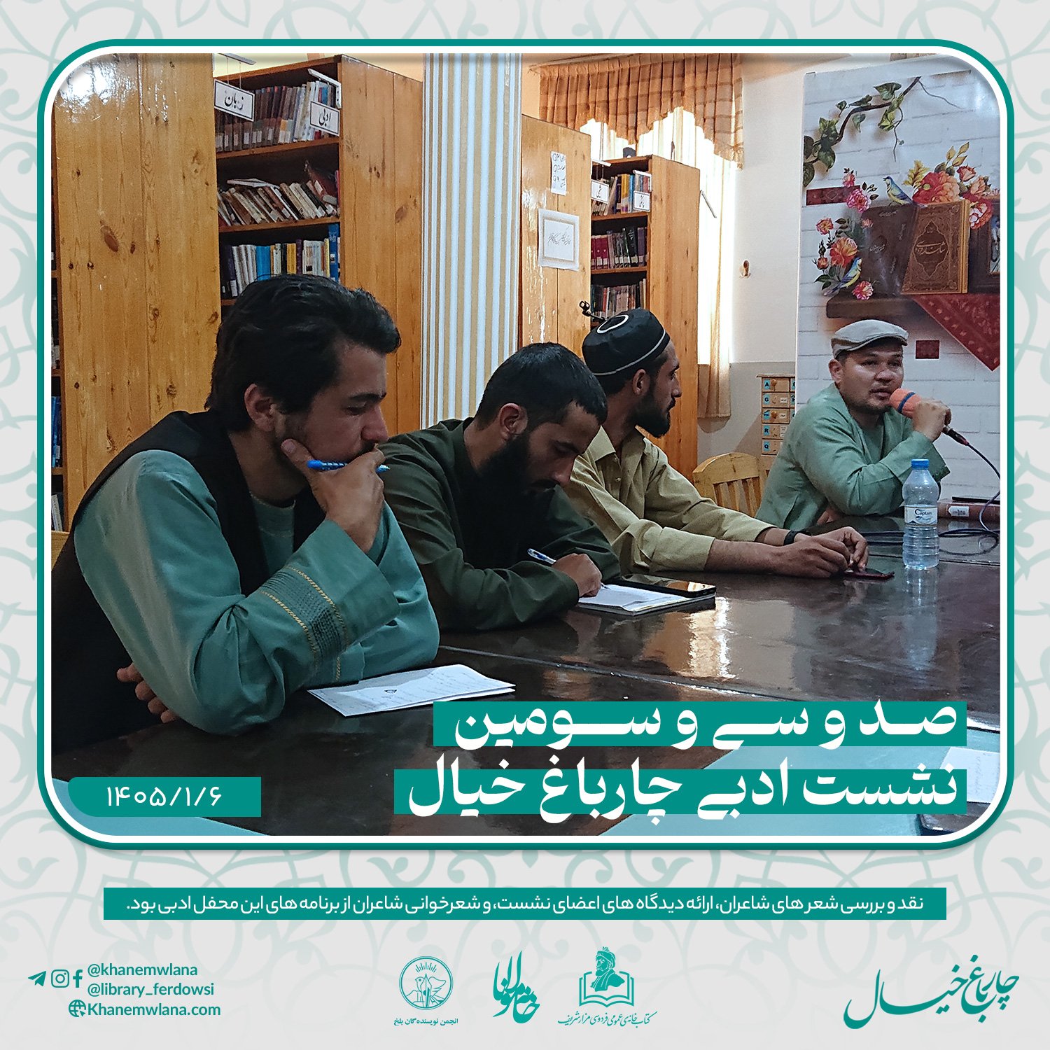 صد و سی و سومین نشستِ ادبی «چارباغ خیال» در بلخ، بعد از ظهر روز پنجشنبه ۶ حمل (فروردین ماه) ۱۴۰۵ هجری خورشیدی، با مقدمه و گردانندگی «سهراب سوشیان» آغاز یافت.