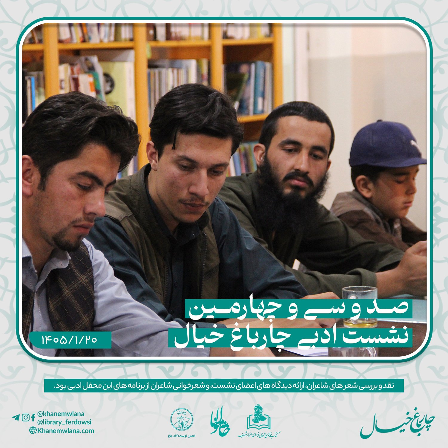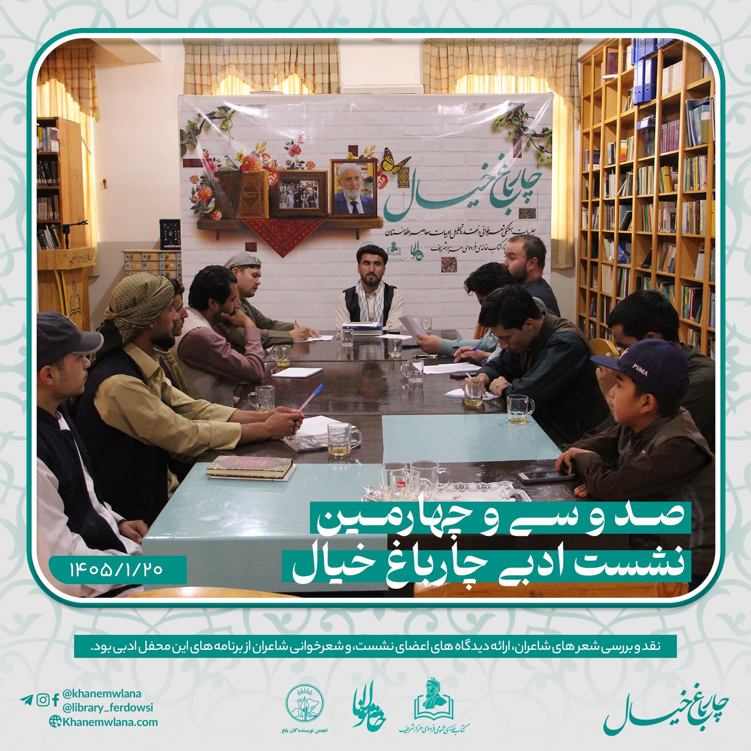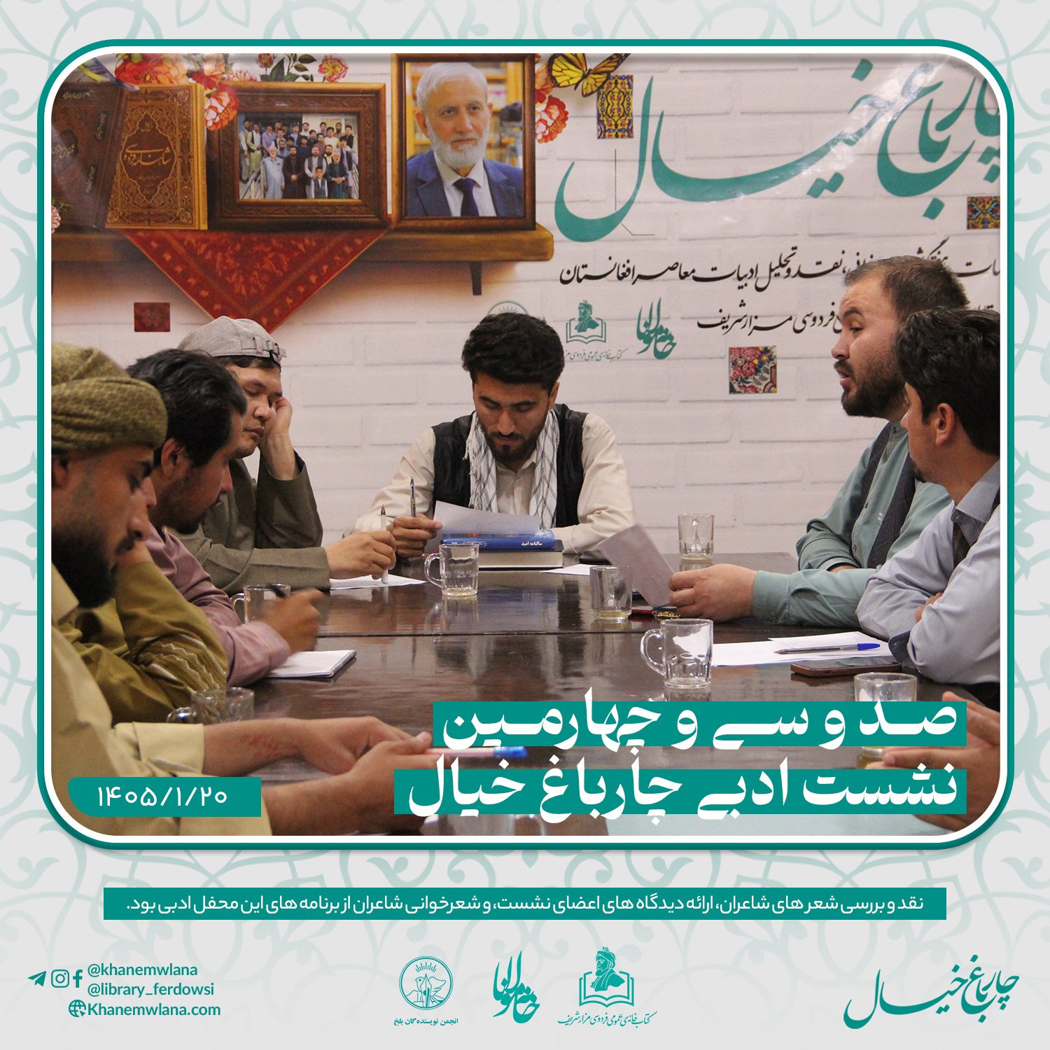 صد و سی و چهارمین نشستِ ادبی «چارباغ خیال» در بلخ، بعد از ظهر روز پنجشنبه ۲۰ حوت ۱۴۰۵ هجری خورشیدی، با مقدمه و گردانندگی حمزهی عابر آغاز شد.