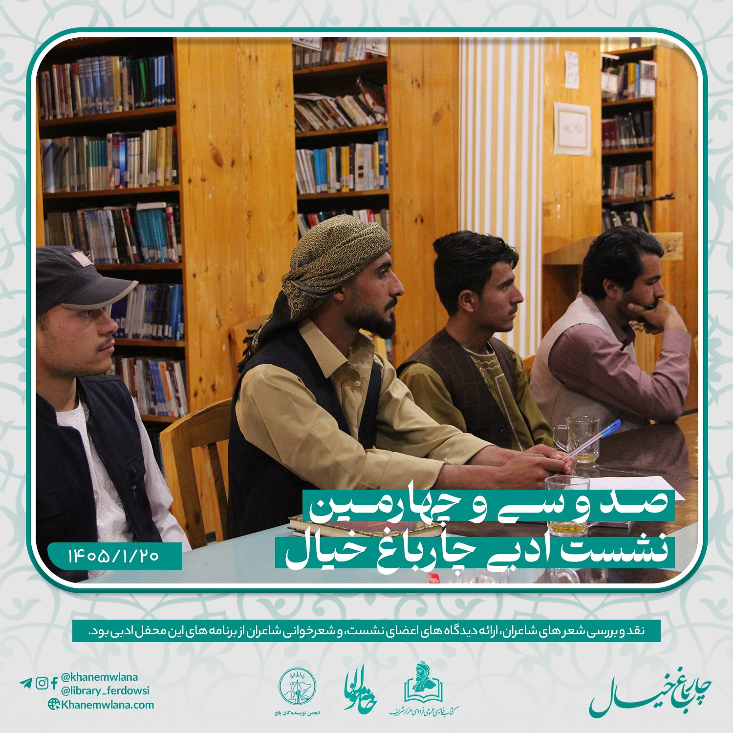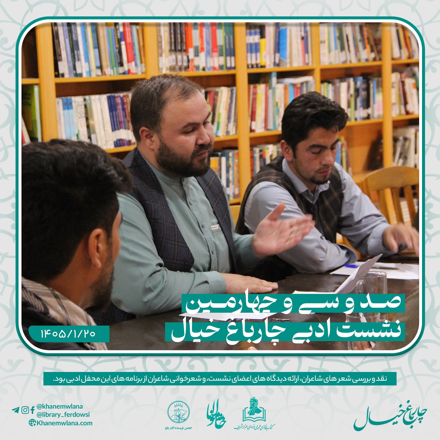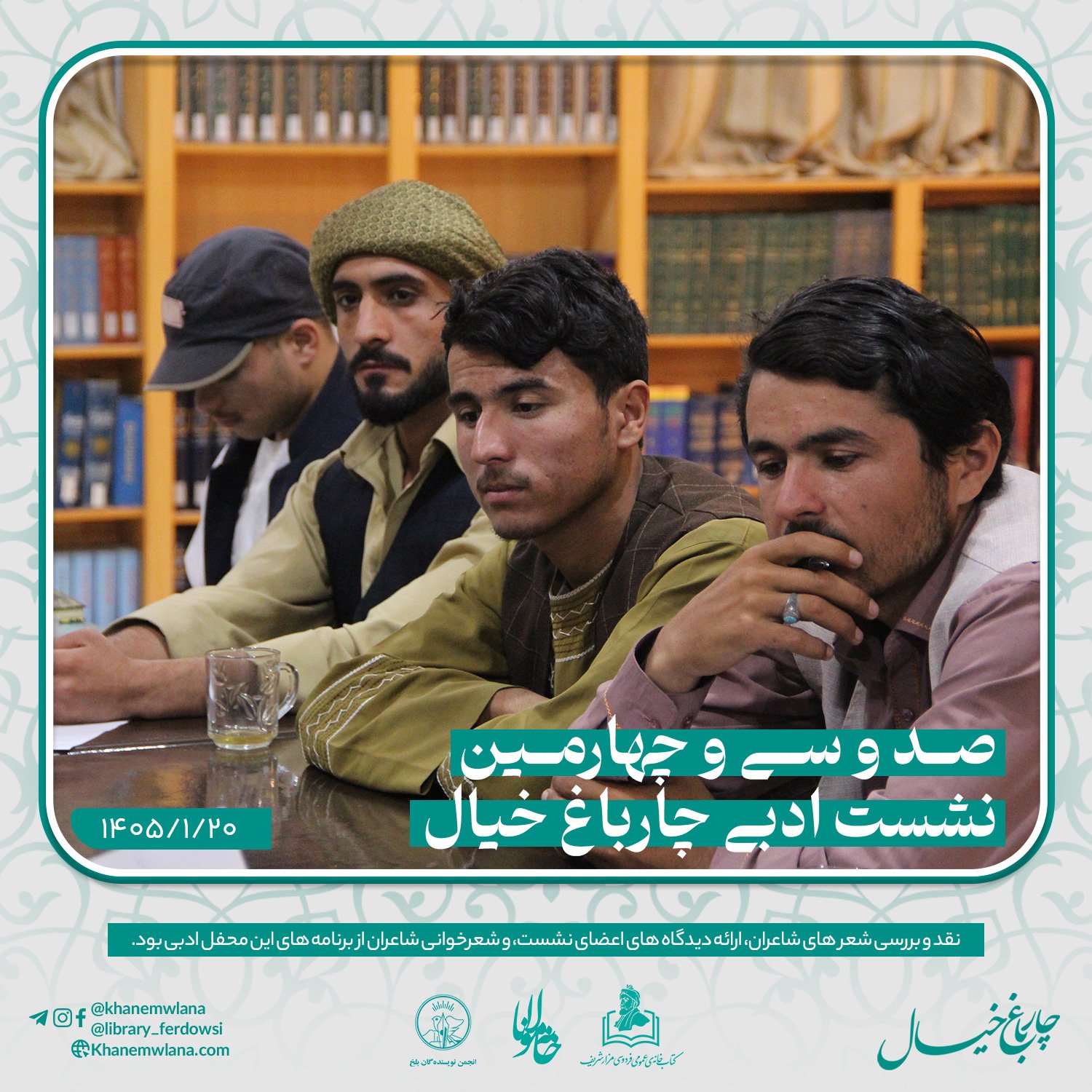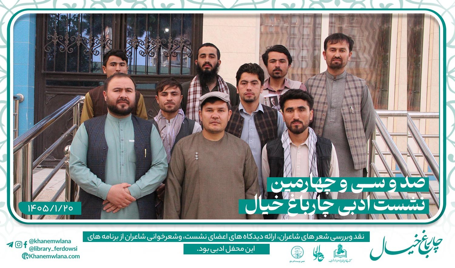 صد و سی و چهارمین نشستِ ادبی «چارباغ خیال» در بلخ، بعد از ظهر روز پنجشنبه ۲۰ حوت ۱۴۰۵ هجری خورشیدی، با مقدمه و گردانندگی حمزهی عابر آغاز شد.