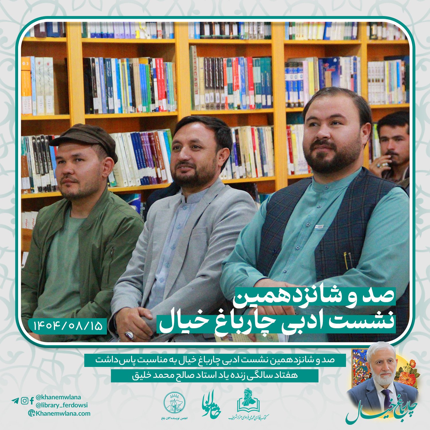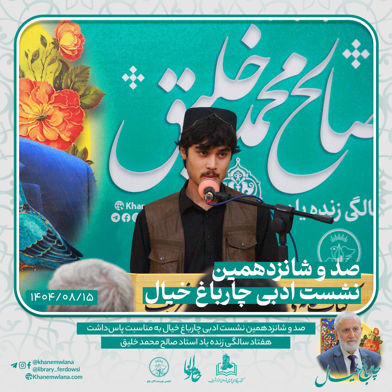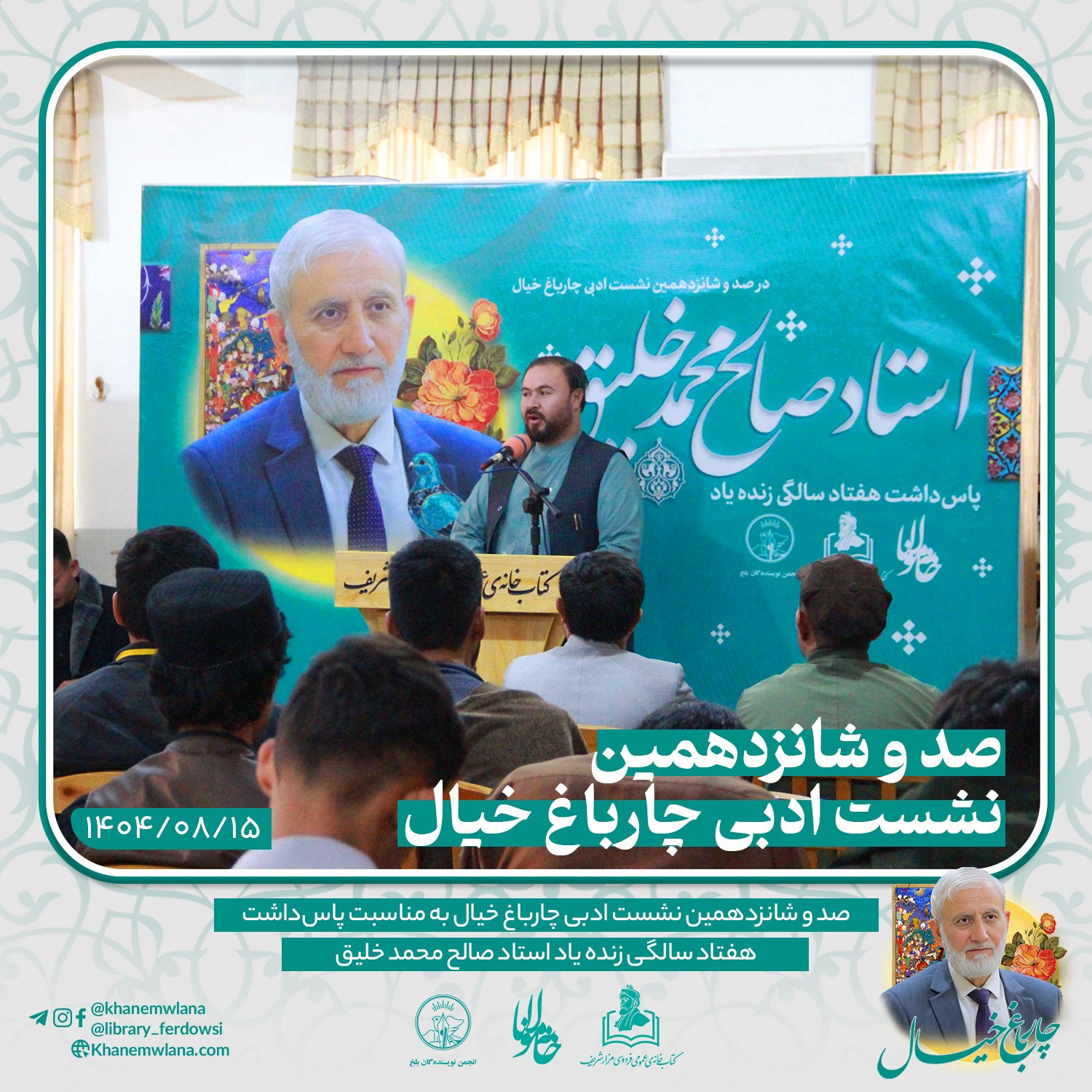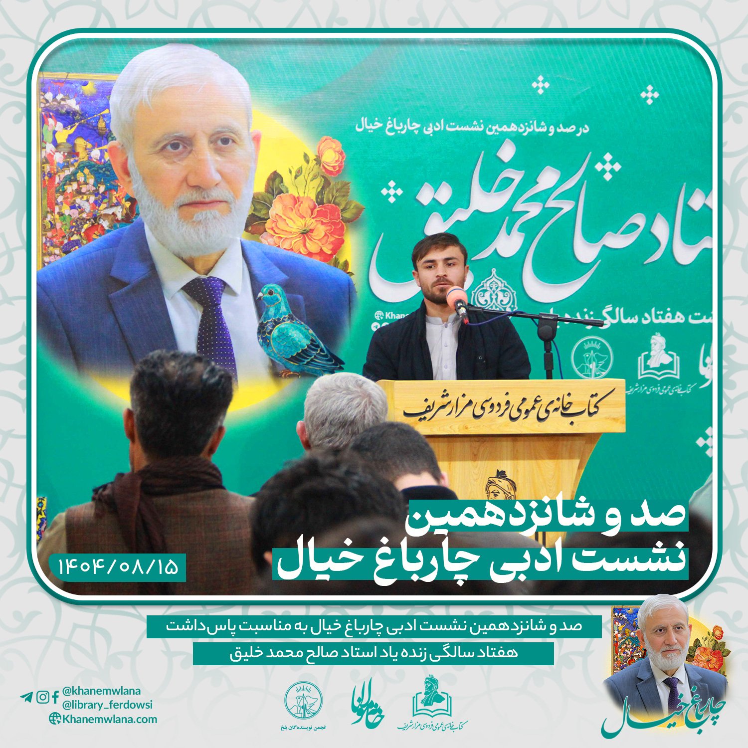 عصر روز پنجشنبه، ۱۵ عقرب (آبانماه) ۱۴۰۴ خورشیدی، صد و شانزدهمین نشست هفتگی انجمن ادبی چارباغ با پاسداشت از هفتادسالگی زندهیاد استاد صالحمحمد خلیق، شاعر، پژوهشگر و چهرهی برجستهی فرهنگی بلخ، برگزار شد.