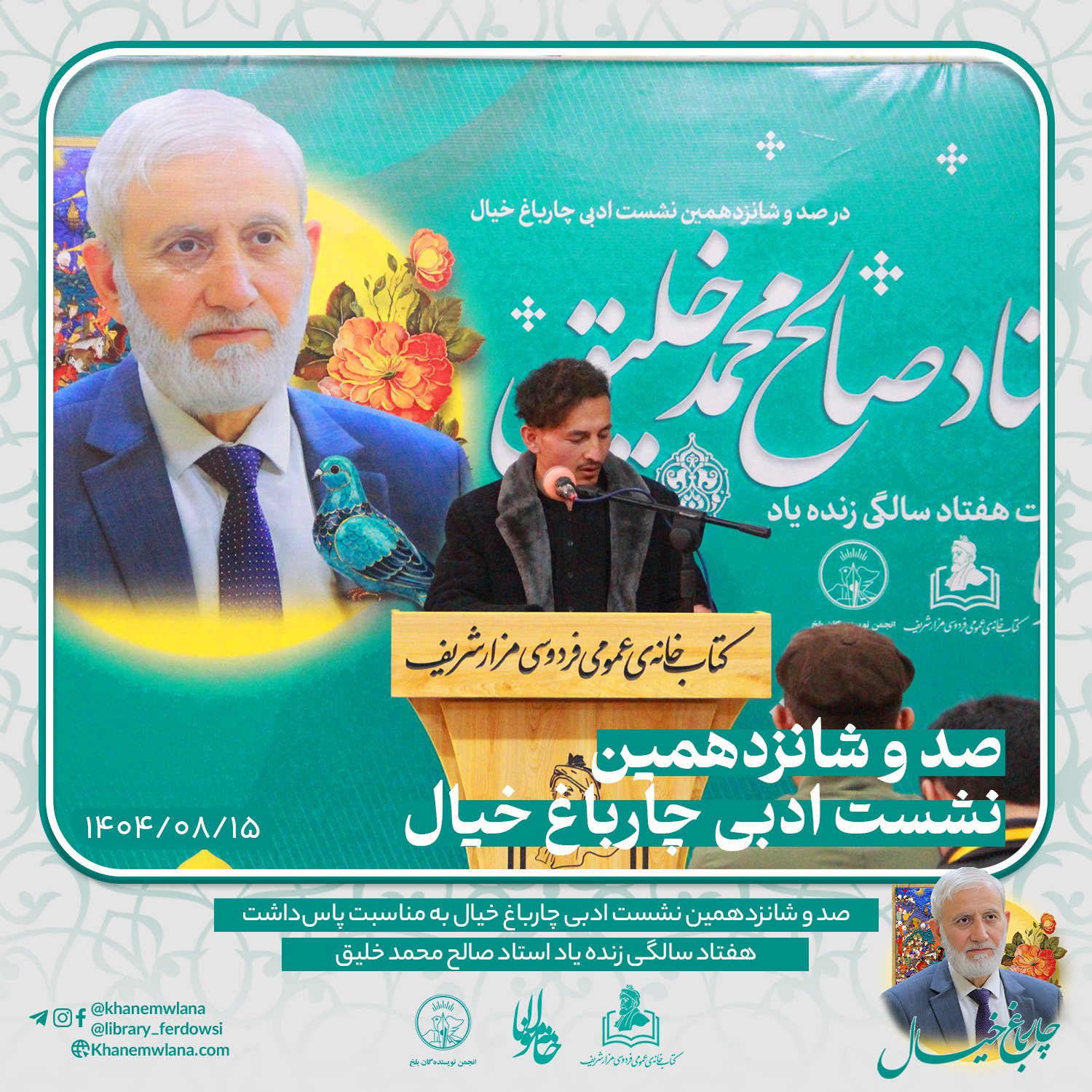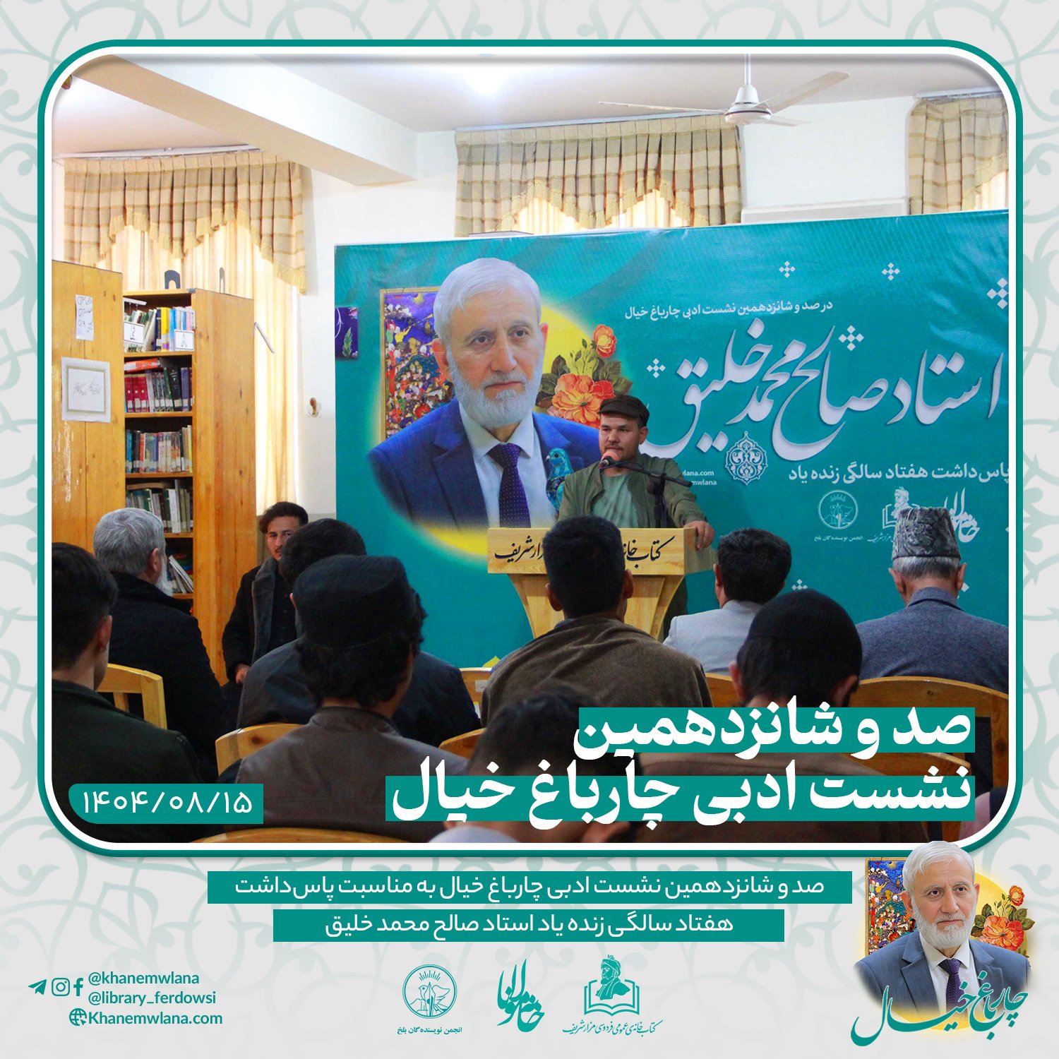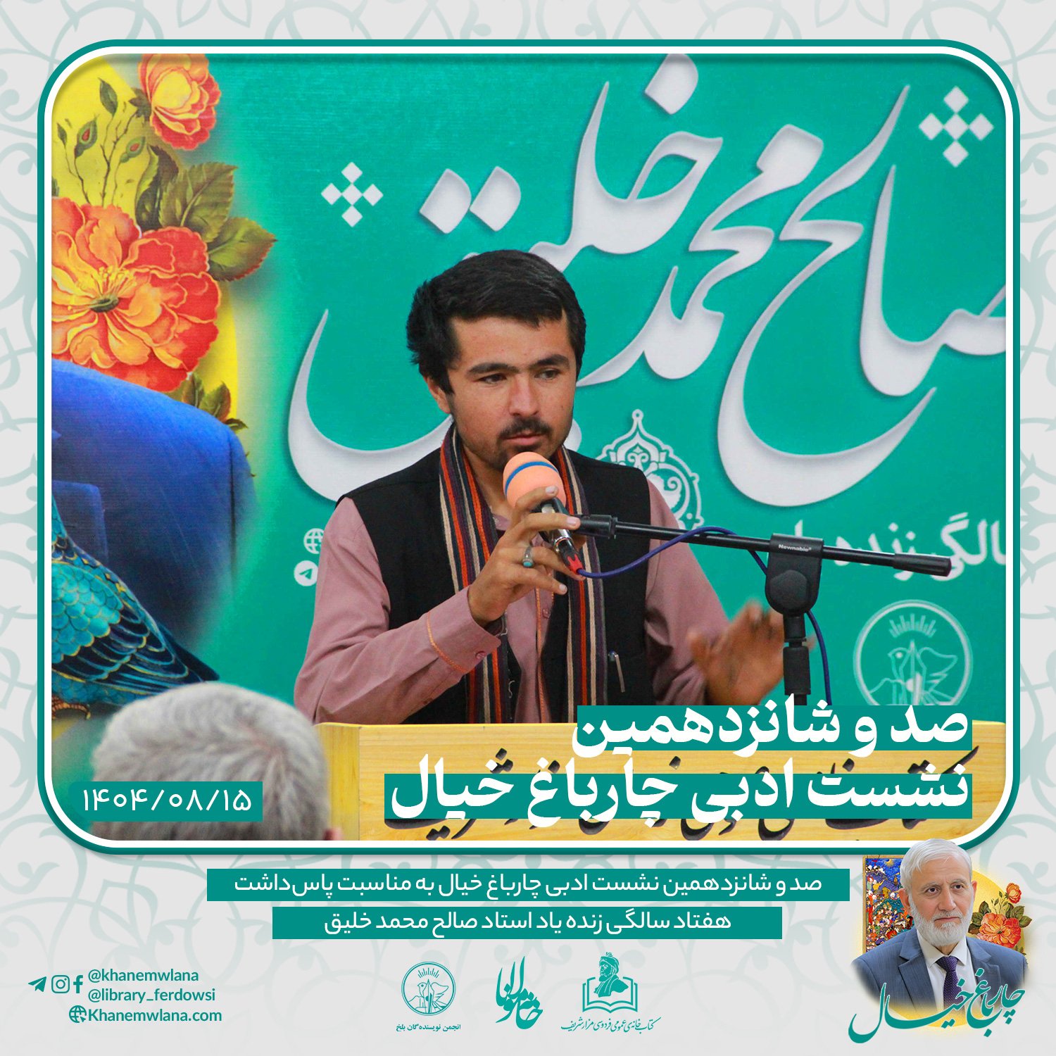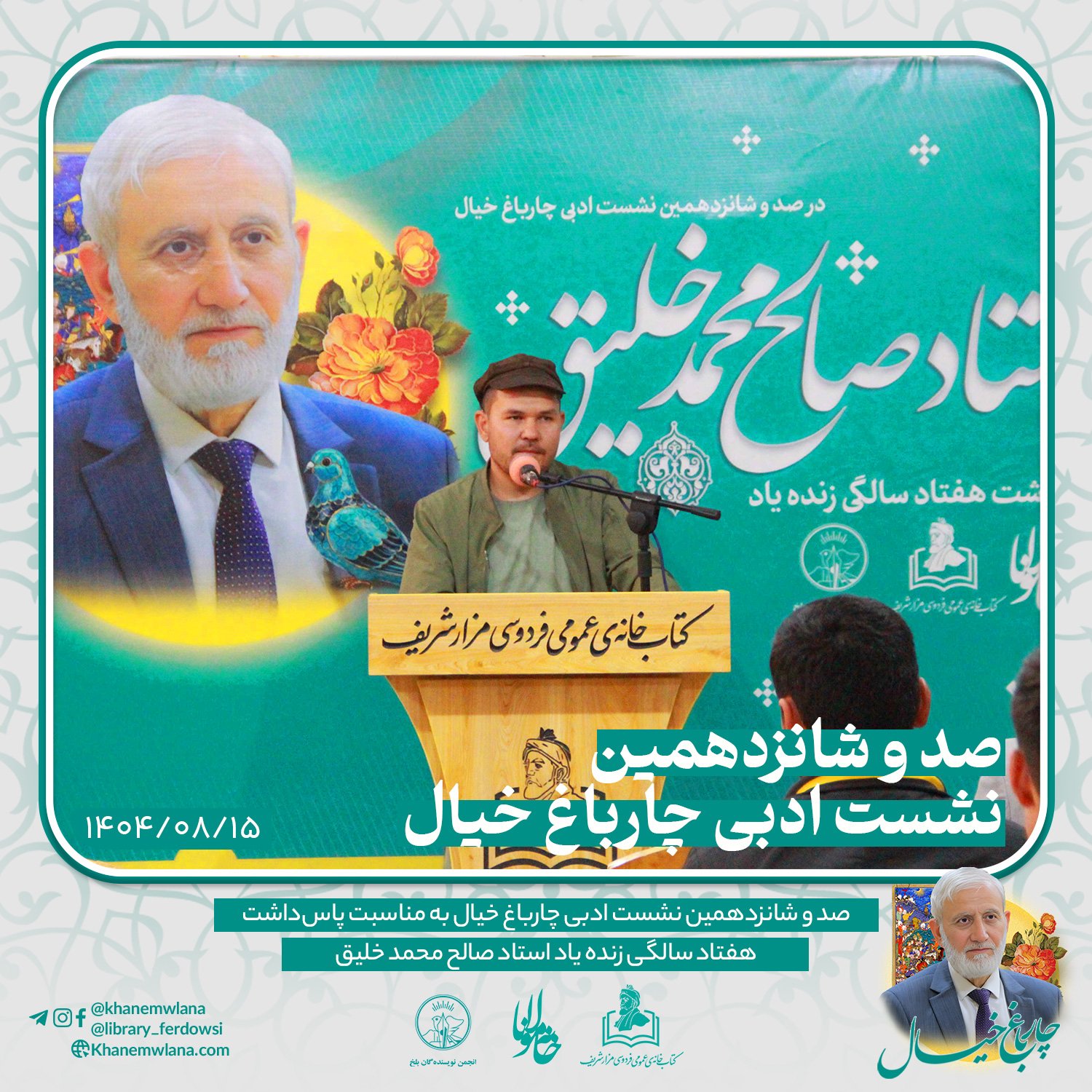عصر روز پنجشنبه، ۱۵ عقرب (آبانماه) ۱۴۰۴ خورشیدی، صد و شانزدهمین نشست هفتگی انجمن ادبی چارباغ با پاسداشت از هفتادسالگی زندهیاد استاد صالحمحمد خلیق، شاعر، پژوهشگر و چهرهی برجستهی فرهنگی بلخ، برگزار شد.