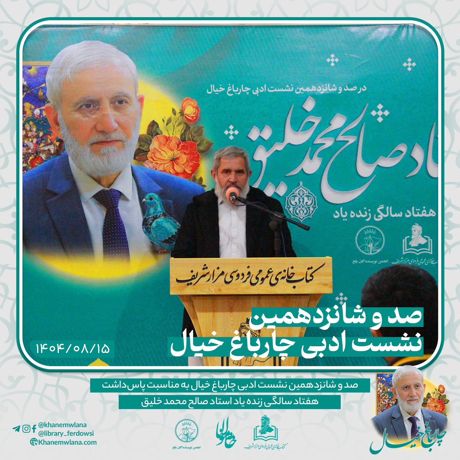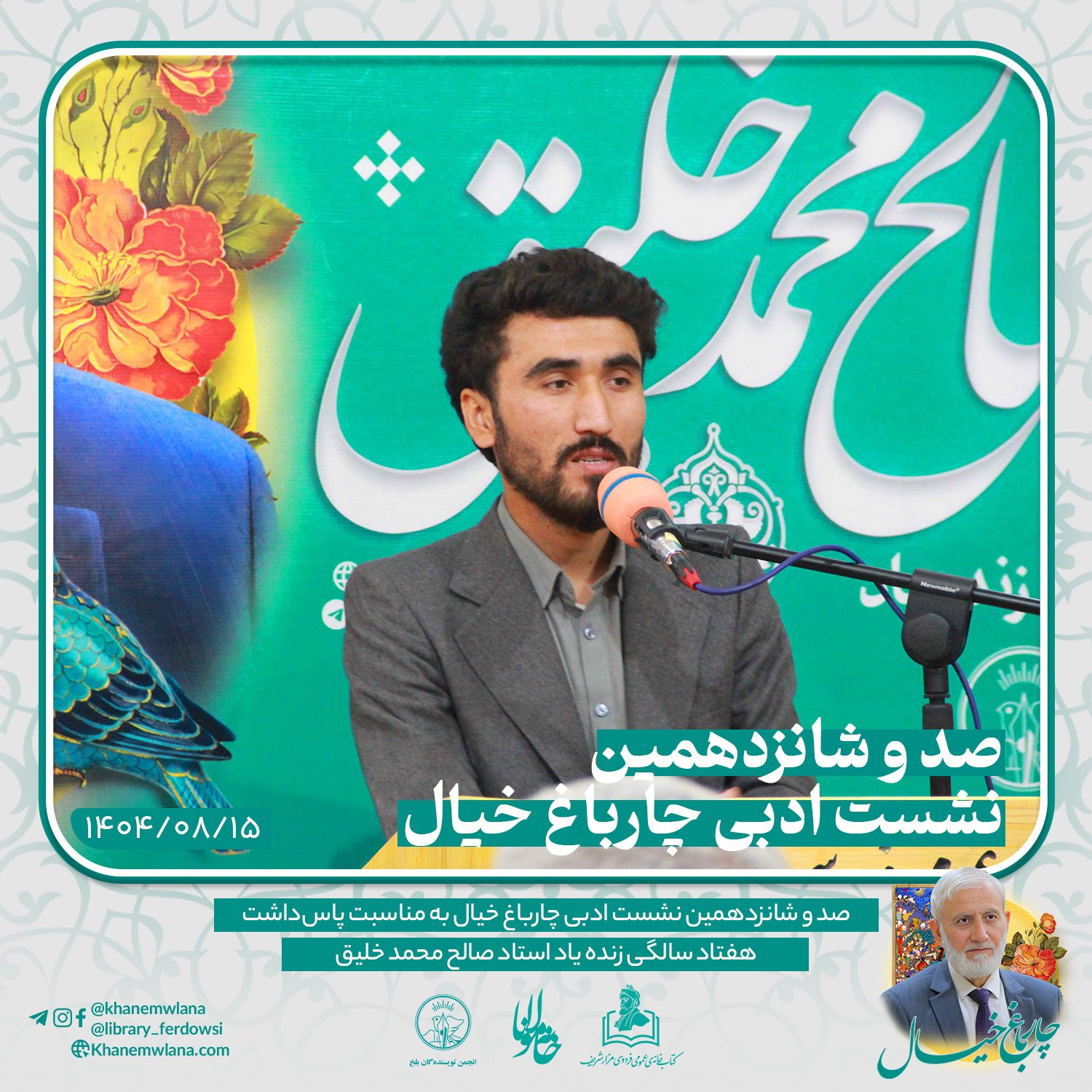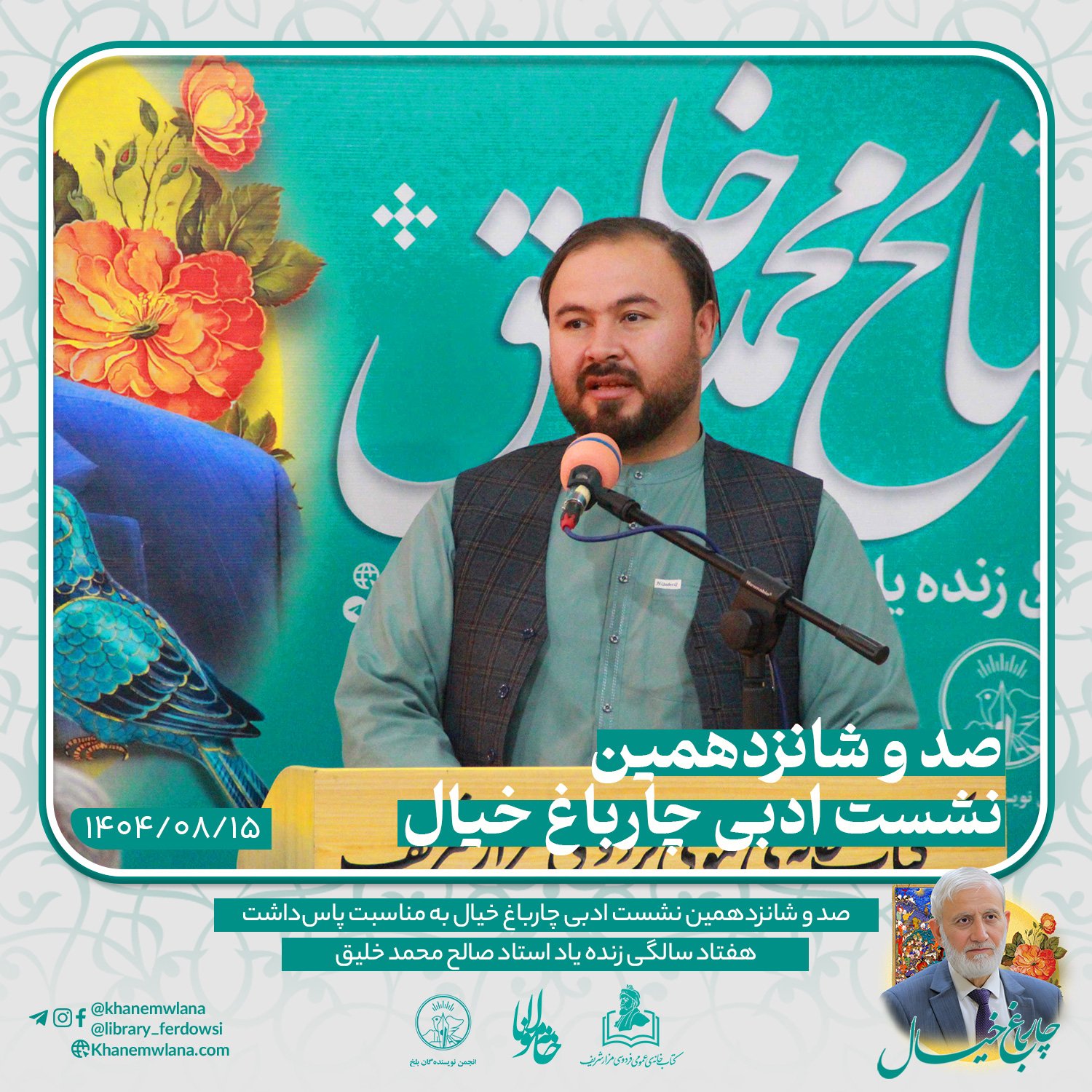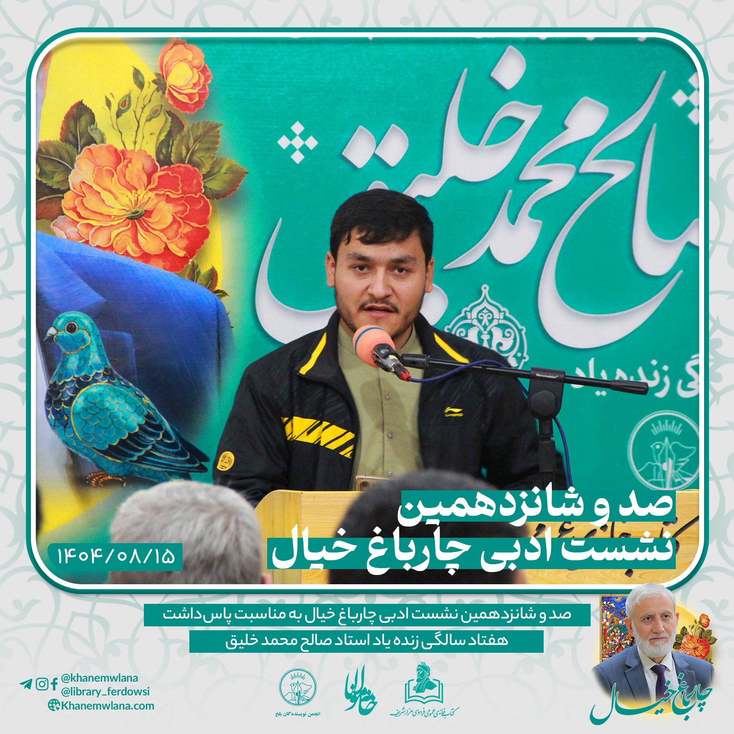 عصر روز پنجشنبه، ۱۵ عقرب (آبانماه) ۱۴۰۴ خورشیدی، صد و شانزدهمین نشست هفتگی انجمن ادبی چارباغ با پاسداشت از هفتادسالگی زندهیاد استاد صالحمحمد خلیق، شاعر، پژوهشگر و چهرهی برجستهی فرهنگی بلخ، برگزار شد.