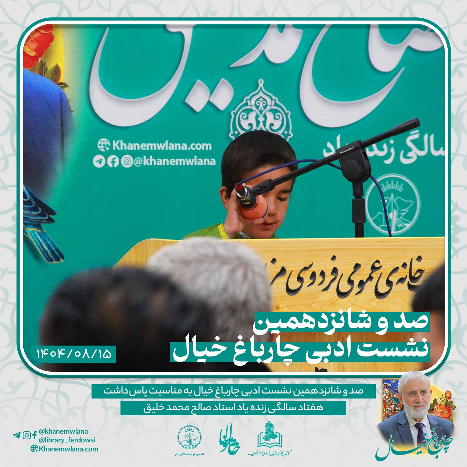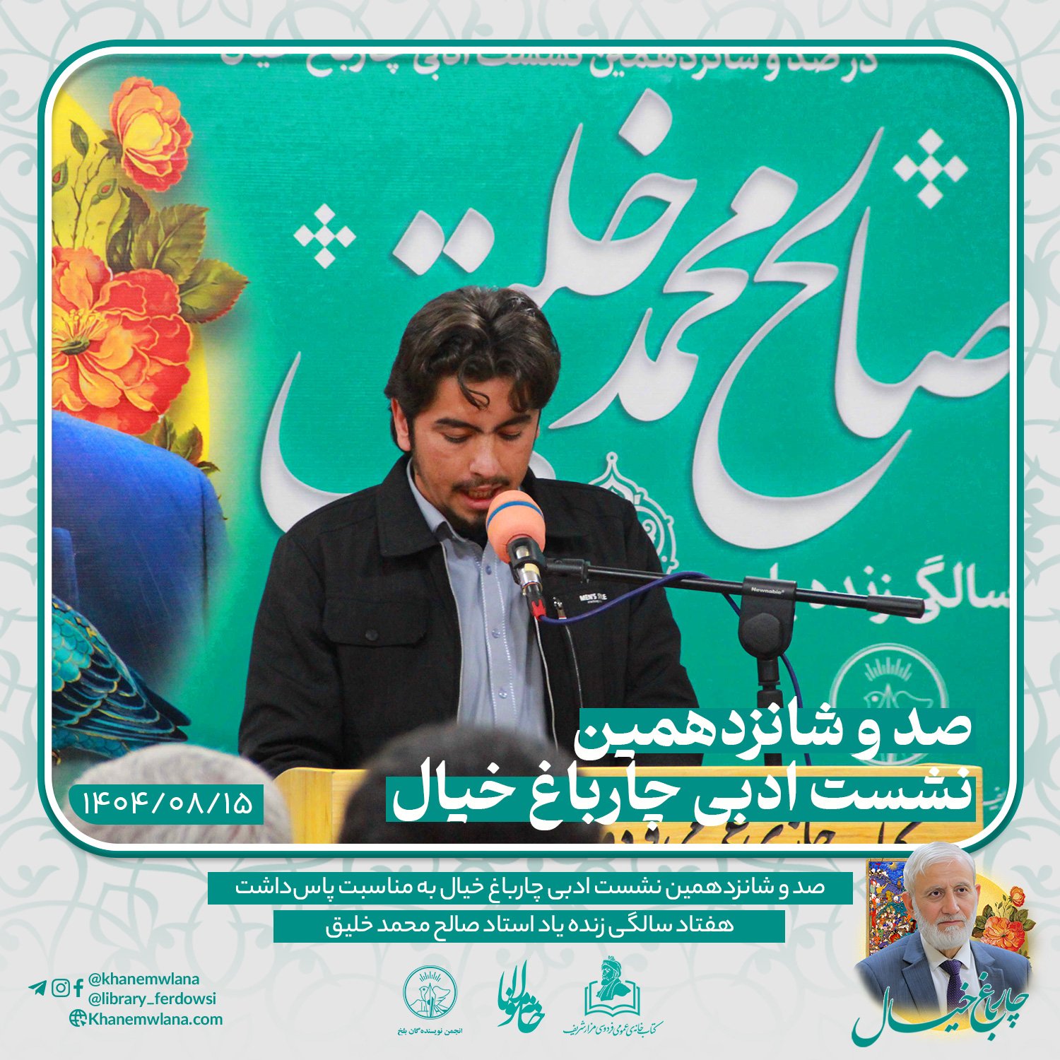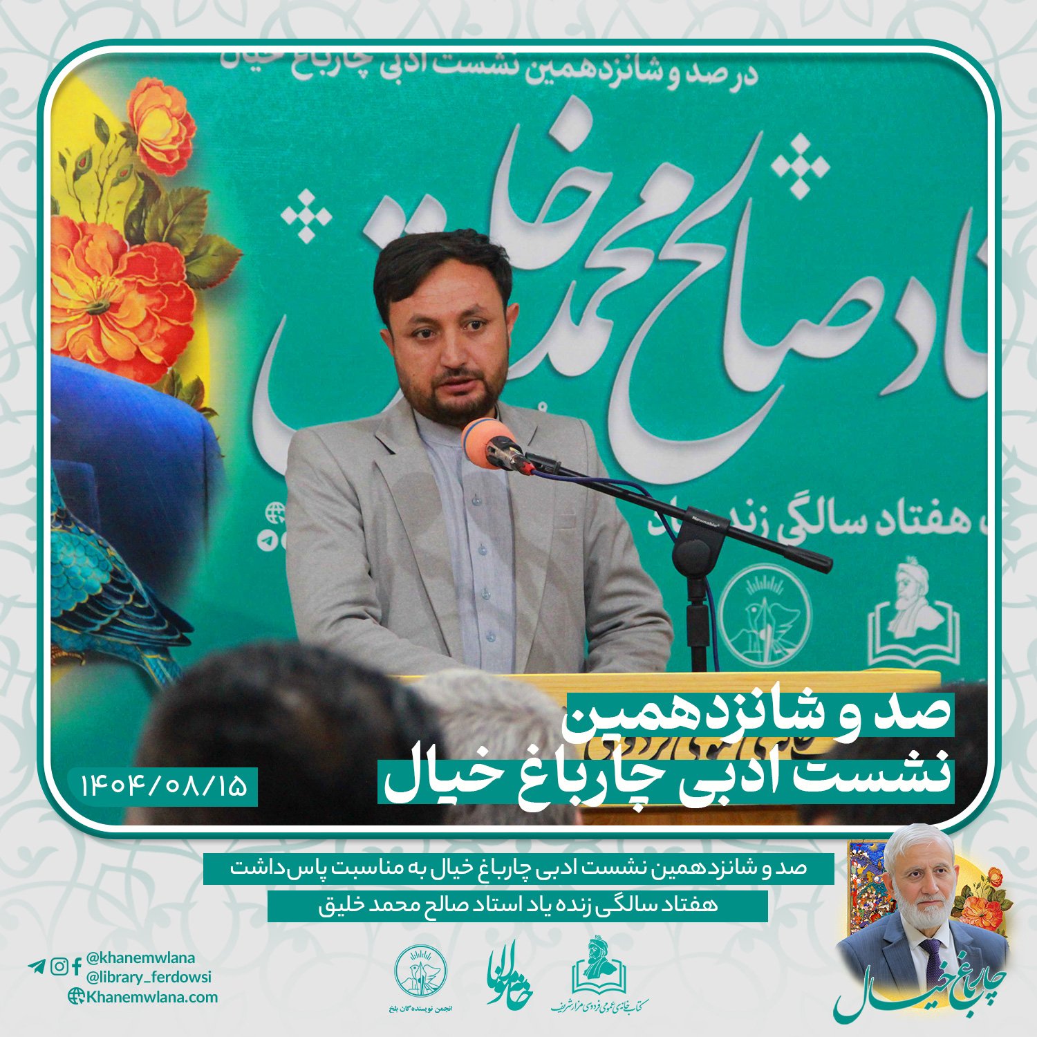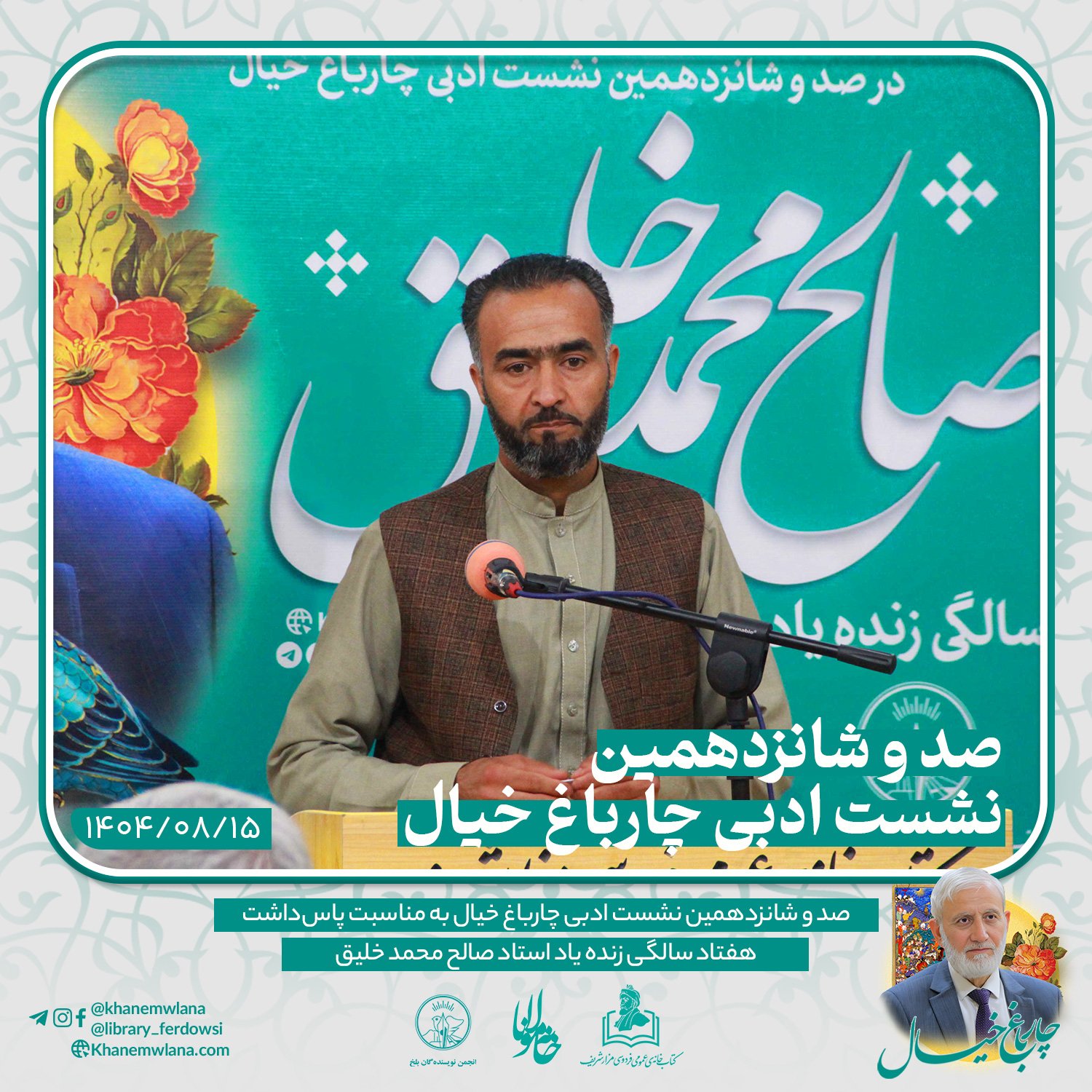 عصر روز پنجشنبه، ۱۵ عقرب (آبانماه) ۱۴۰۴ خورشیدی، صد و شانزدهمین نشست هفتگی انجمن ادبی چارباغ با پاسداشت از هفتادسالگی زندهیاد استاد صالحمحمد خلیق، شاعر، پژوهشگر و چهرهی برجستهی فرهنگی بلخ، برگزار شد.