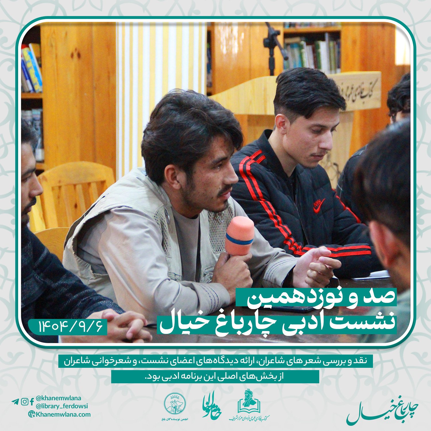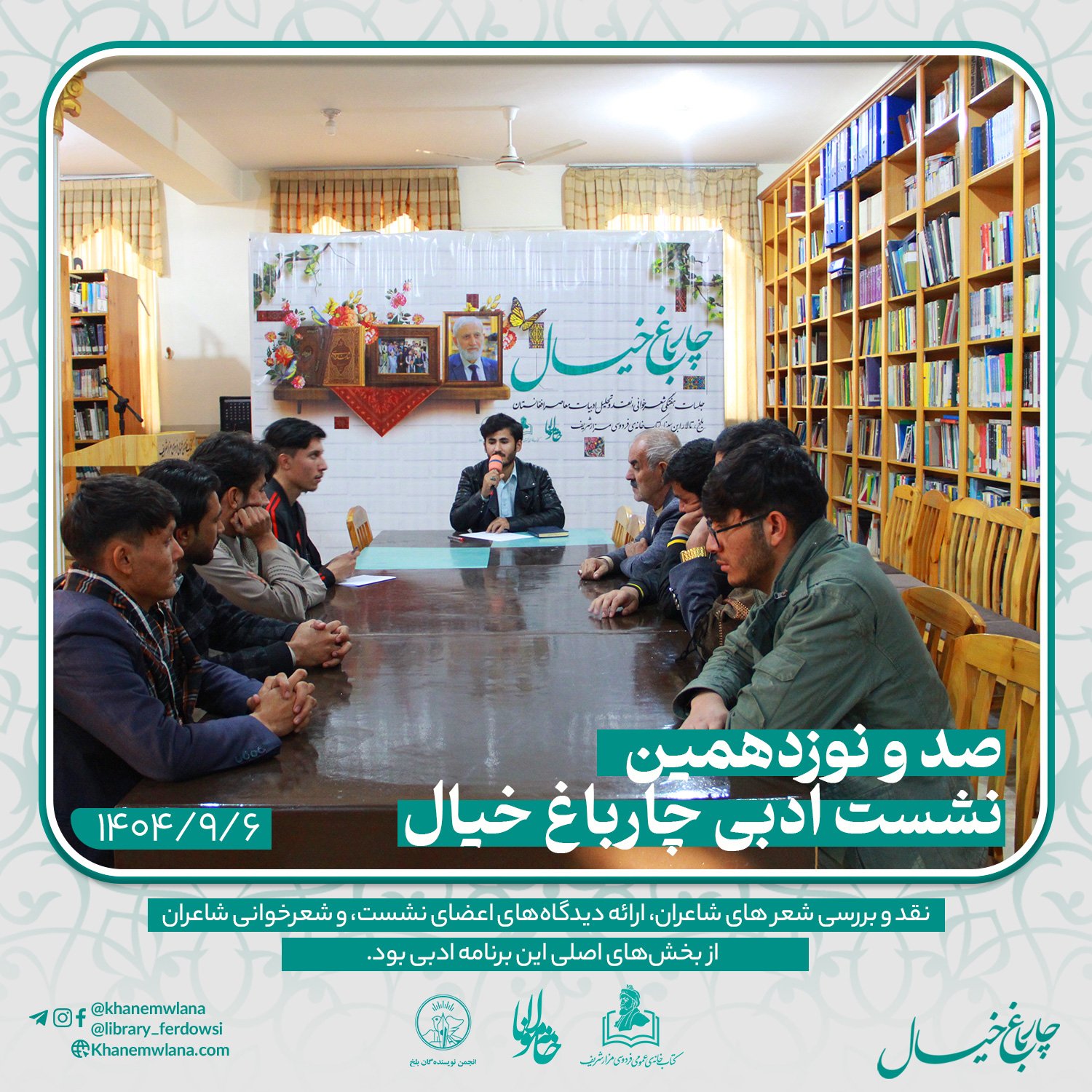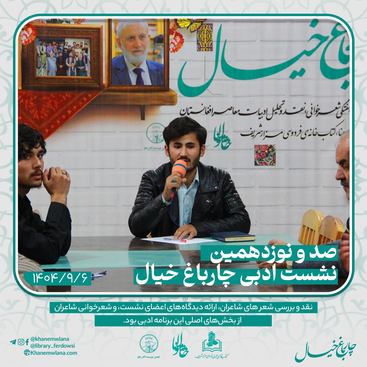 بعدازظهر پنجشنبه، ۸ قوس ۱۴۰۴ خورشیدی، صدونوزدهمین نشست ادبی «چارباغ خیال» با حضور جمعی از شاعران و نویسندگان گرامی در بلخ برگزار شد. مقدمه و گردانندگی این نشست را آقای ویس شیرزاد بر عهده داشت. این برنامه همچون همیشه بههمت انجمن ادبی خانهٔ مولانا، انجمن نویسندگان بلخ و با همکاری کتابخانهٔ فردوسی مزارشریف برگزار گردید.