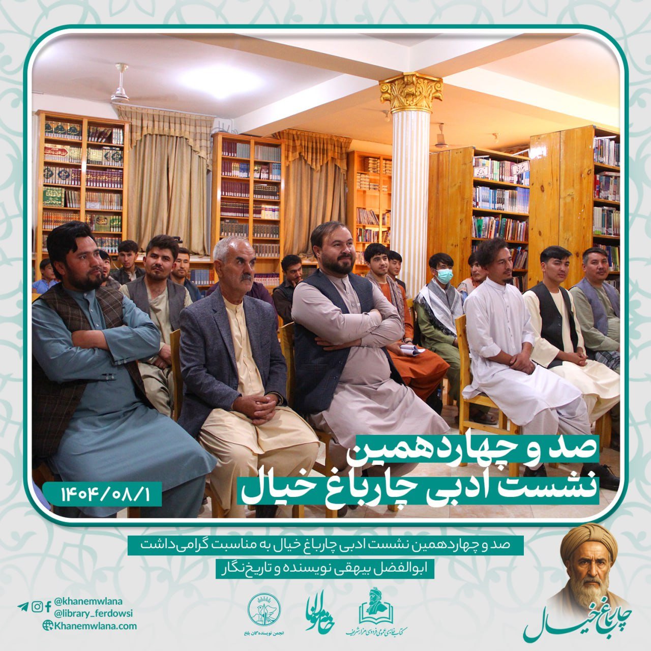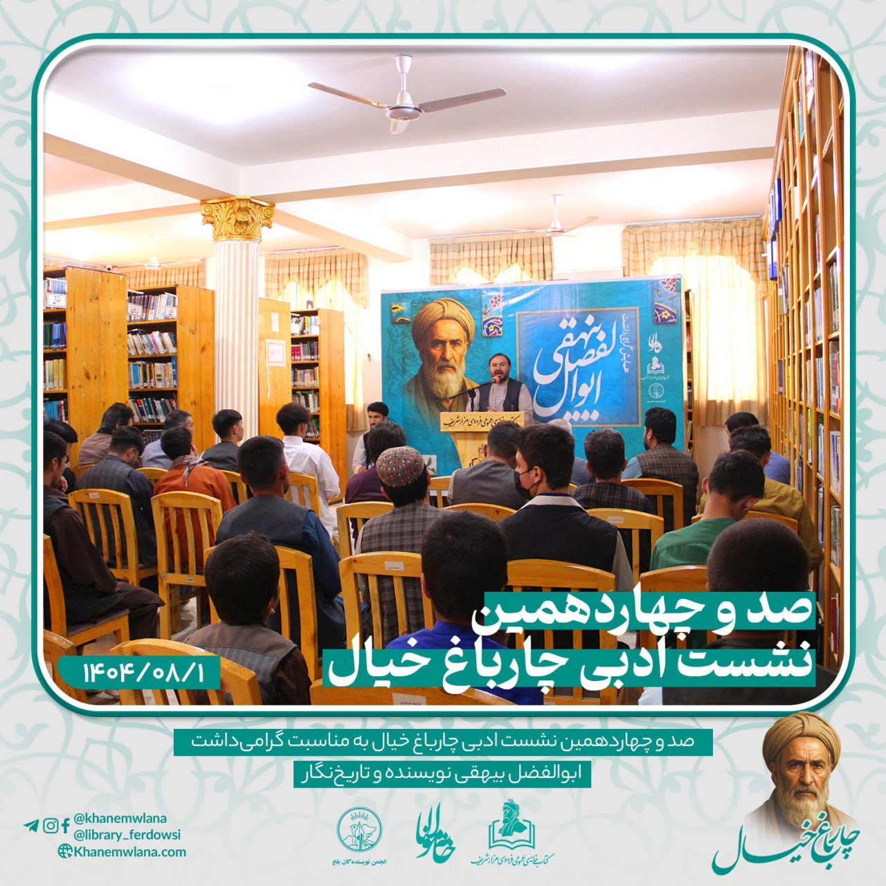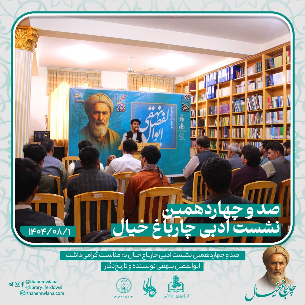 صد و چهاردهمین نشستِ ادبی «چارباغِ خیال» در شهر کهن بلخ، پیوند خورده بود با همایش گرامیداشت از شخصیت برجستهی ادبی و تاریخی، نویسنده و تاریخنگار نامدار، ابوالفضل بیهقی. این برنامهی فرهنگی و ادبی با تلاش «انجمن ادبی خانه مولانا»، «انجمن نویسندگان ولایت بلخ» و همکاری «کتابخانه عمومی فردوسی – مزارشریف» برگزار گردید.