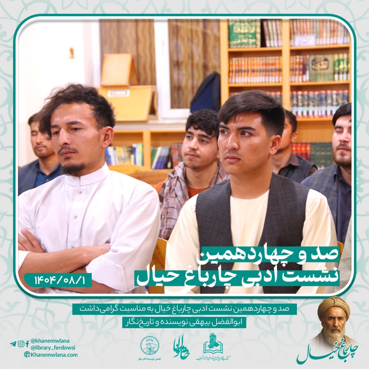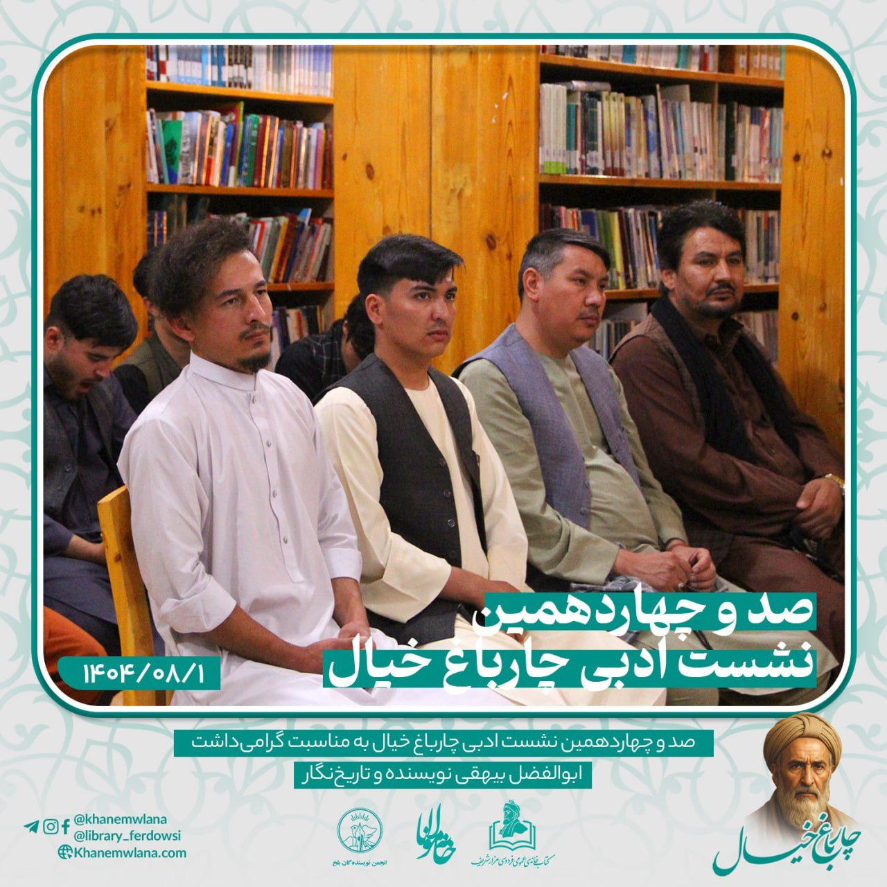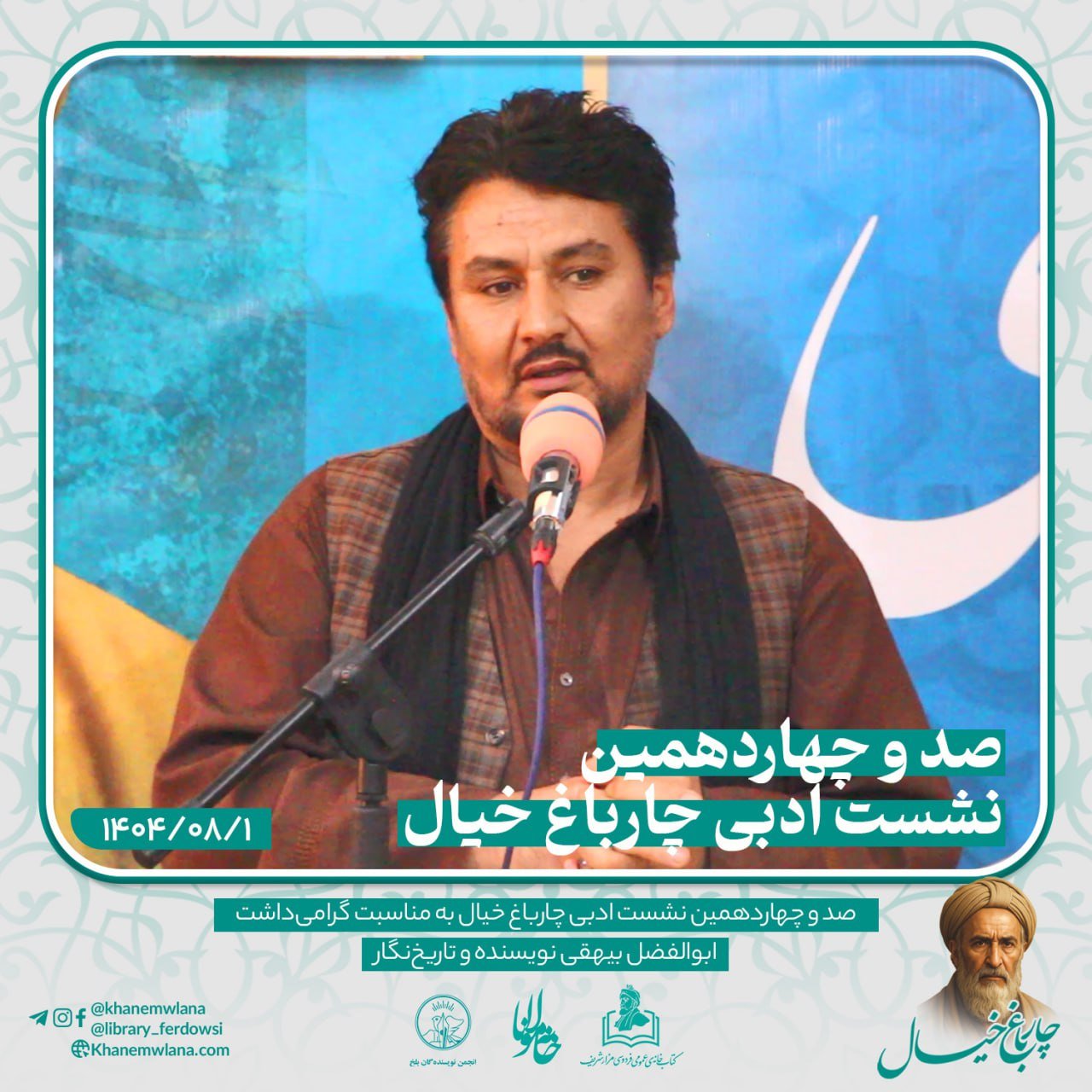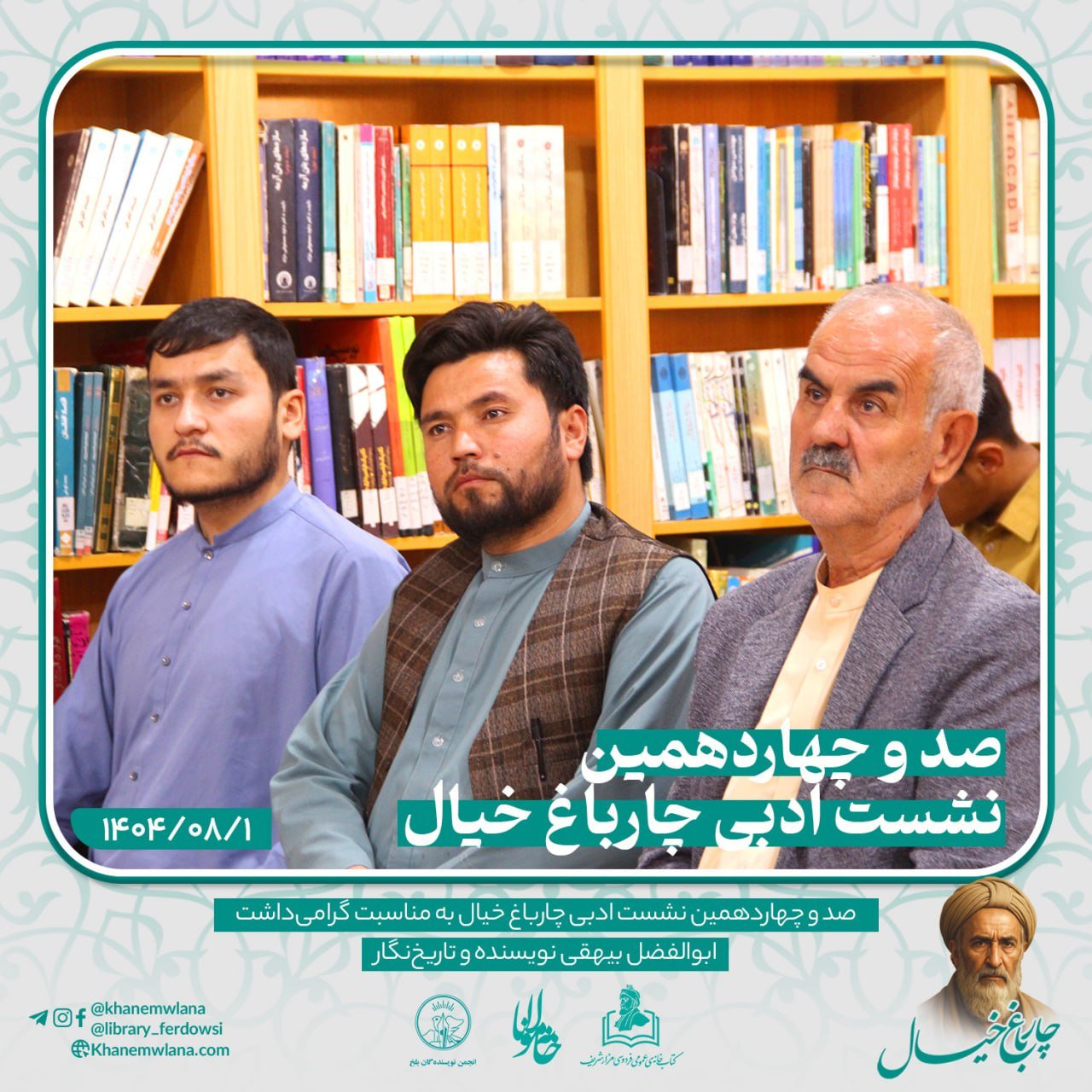 صد و چهاردهمین نشستِ ادبی «چارباغِ خیال» در شهر کهن بلخ، پیوند خورده بود با همایش گرامیداشت از شخصیت برجستهی ادبی و تاریخی، نویسنده و تاریخنگار نامدار، ابوالفضل بیهقی. این برنامهی فرهنگی و ادبی با تلاش «انجمن ادبی خانه مولانا»، «انجمن نویسندگان ولایت بلخ» و همکاری «کتابخانه عمومی فردوسی – مزارشریف» برگزار گردید.
