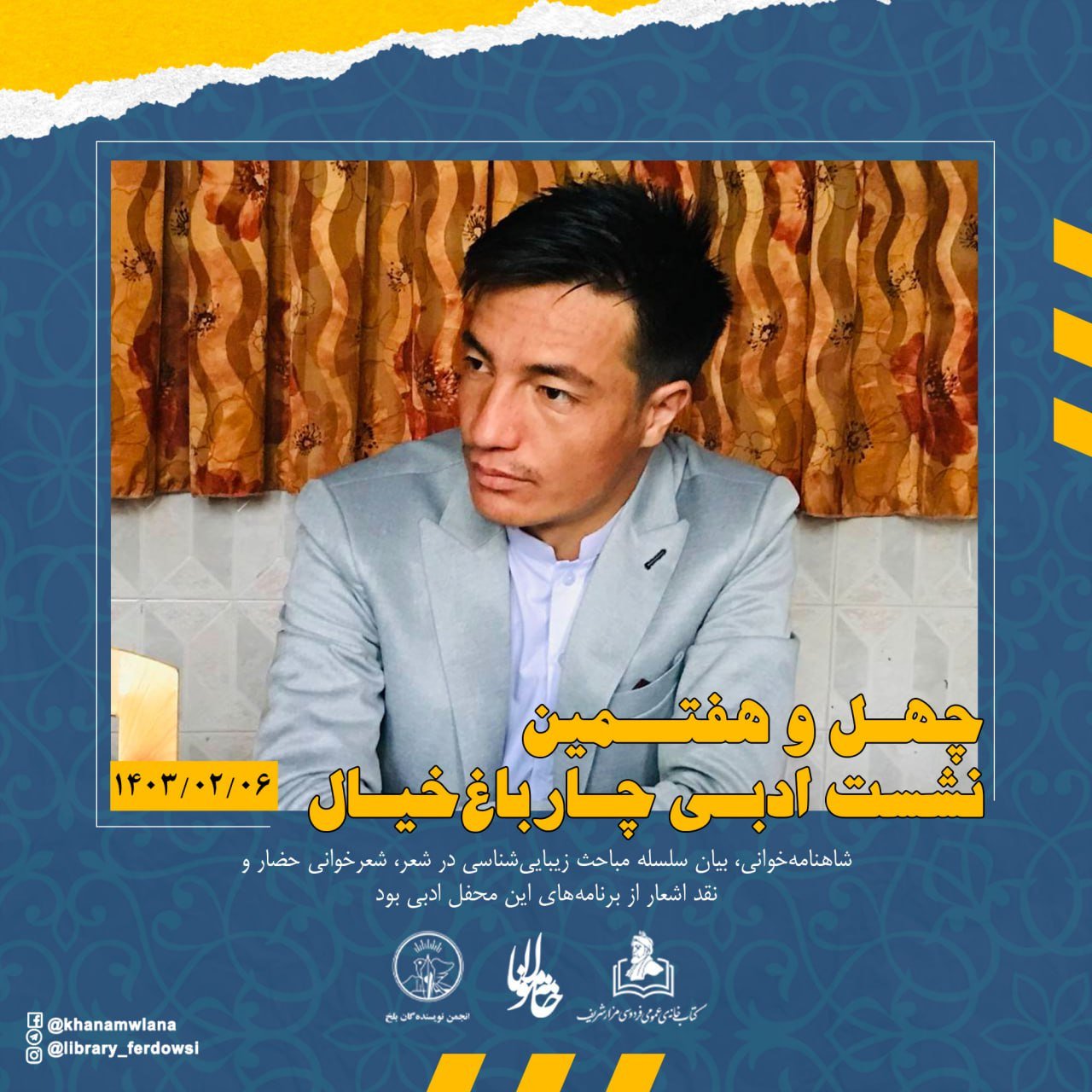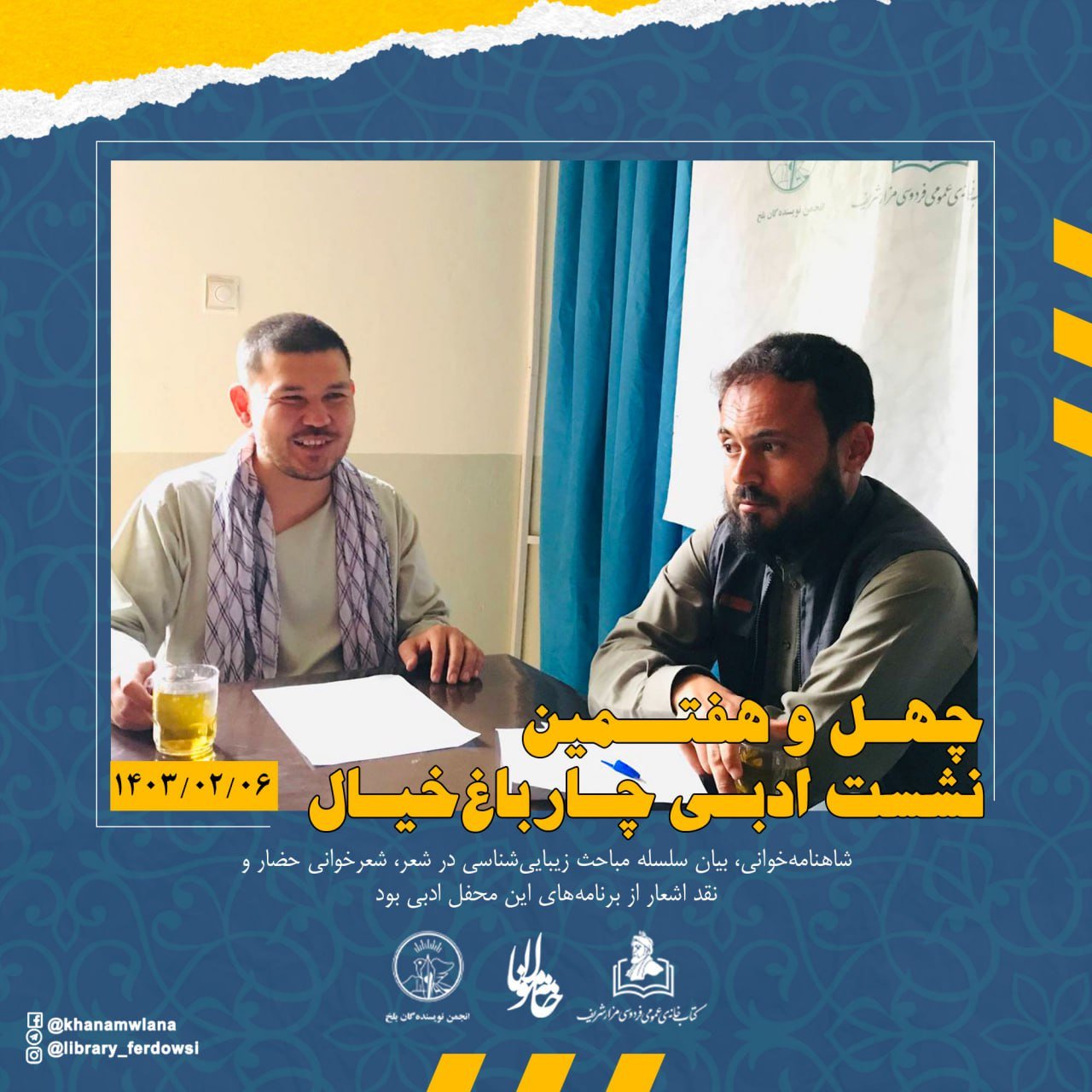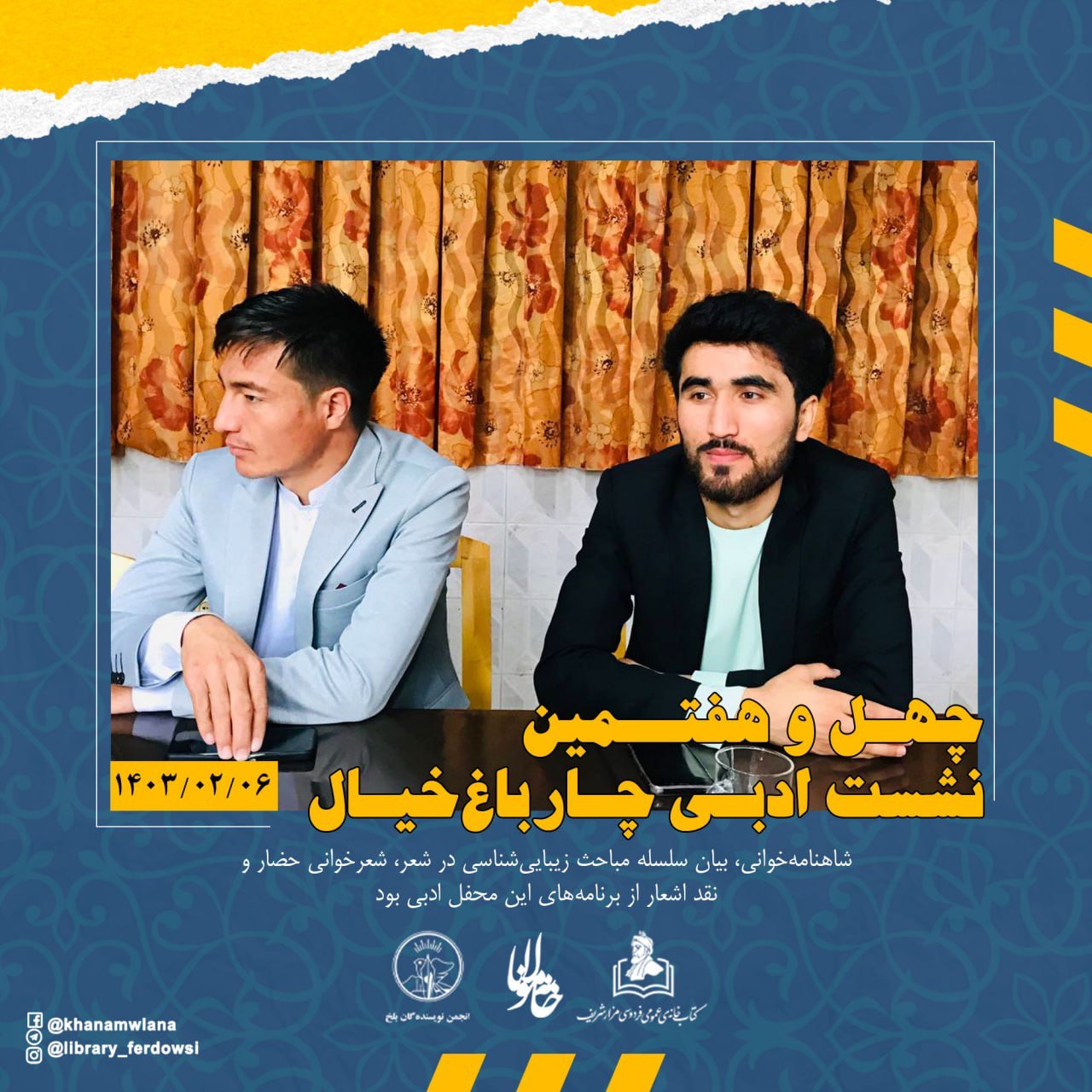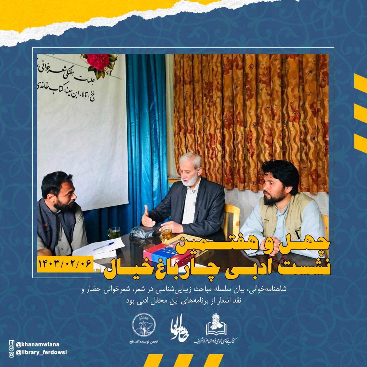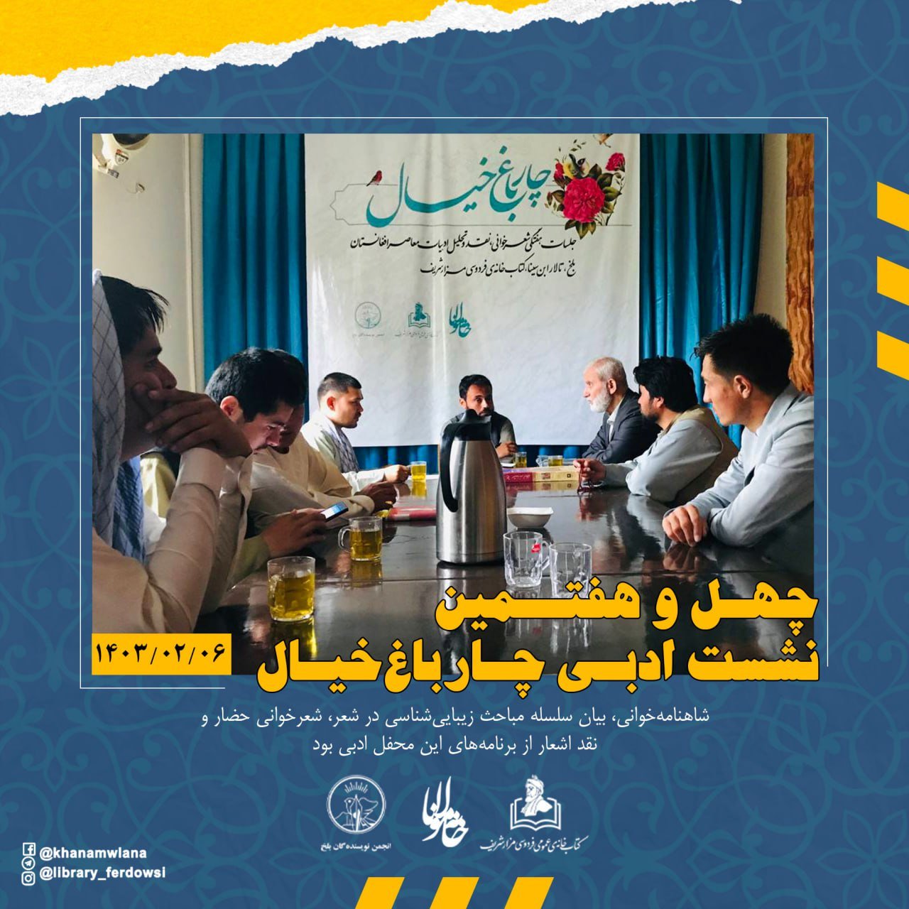پنجشنبه ۶ ثور( اردیبهشت)۱۴٠۳ خ. چهل و هفتمین نشست ادبی «چارباغ خیال» با حضور استاد صالح محمد خلیق(شاعر، پژوهشگر و منتقد ادبی)، عاطف کابلیان(شاعر و منتقد ادبی) و جمعی از شاعران جوان، توسط «انجمن ادبی خانه مولانا» و «انجمن نویسندگان بلخ» و کتابخانهی عمومی فردوسی شهر مزارشریف در سالن ابن سینای این کتابخانه برگزار شد.