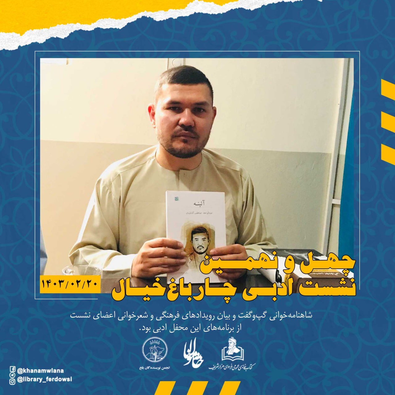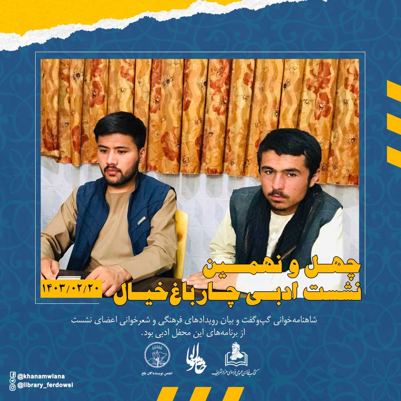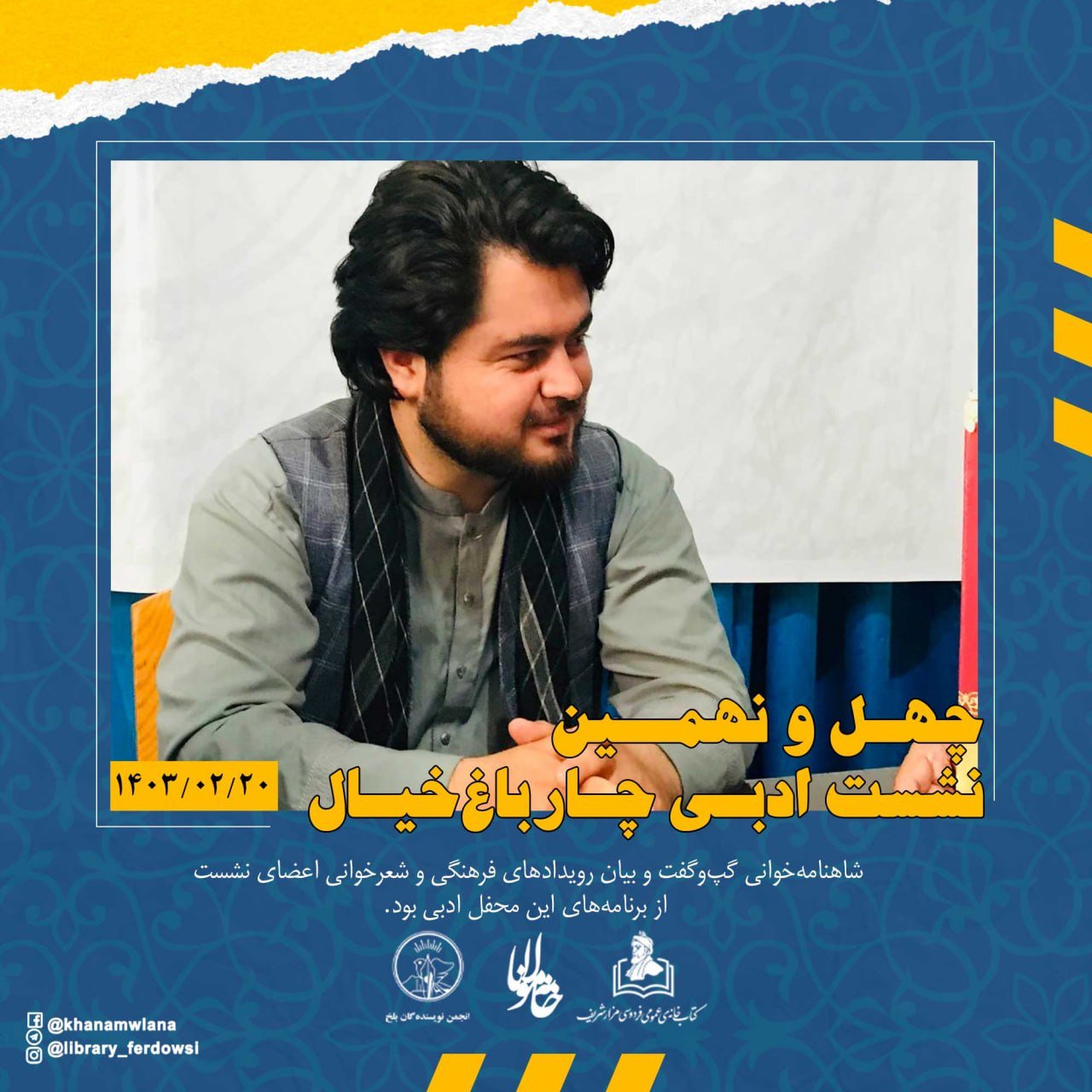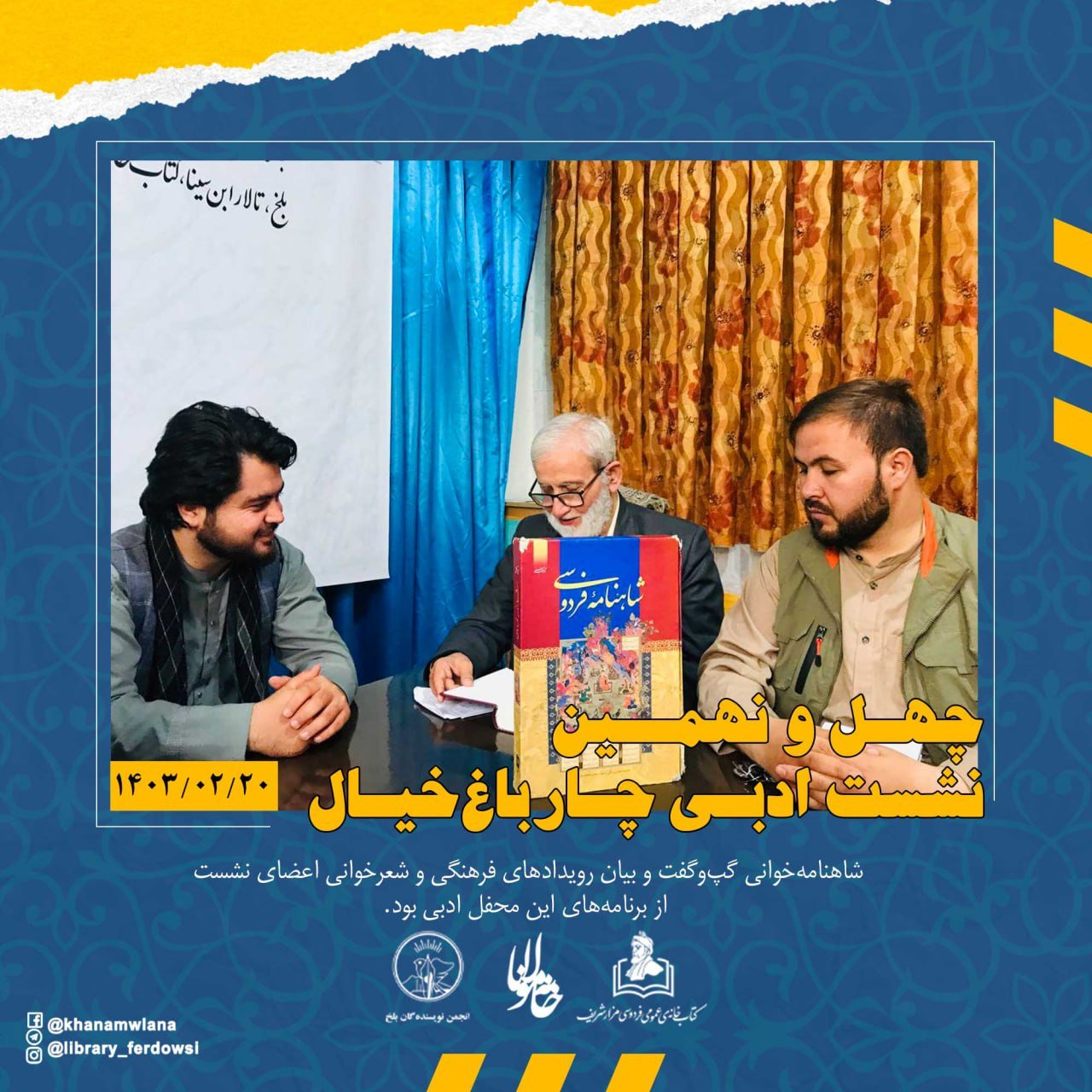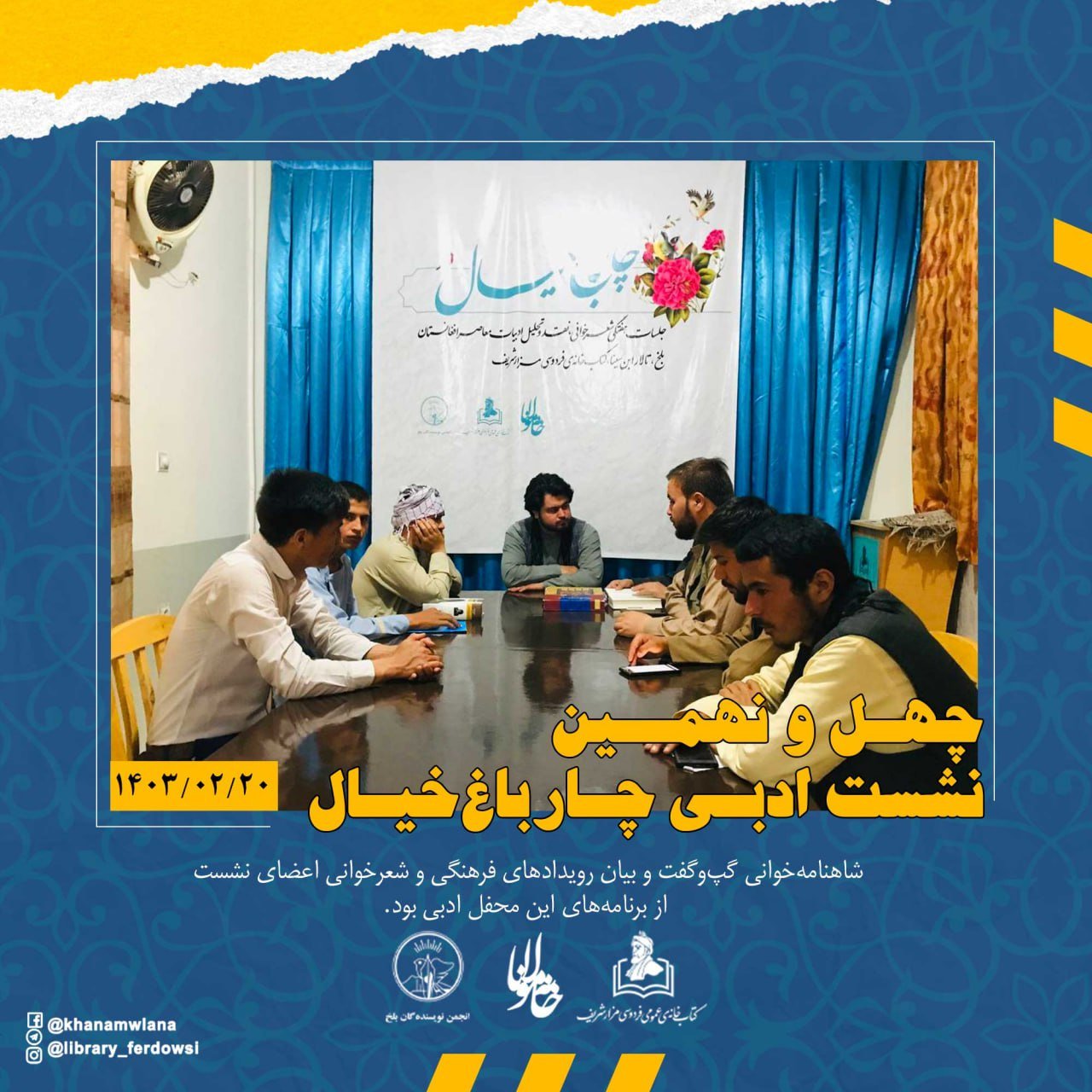 به روز پنجشنبه 20 ثور (اردیبهشت) 1403 هجری خورشیدی، چهل و نهمین نشست ادبی چارباغ خیال با حضور استاد صالحمحمد خلیق، شاعر، پژوهشگر و منتقد ادبی و رئیس انجمن نویسندهگان بلخ، استاد سیدسکندر حسینی بامداد، شاعر و منتقد ادبی و رئیس کتابخانۀ عمومی فردوسی و انجمن ادبی خانۀ مولانا، عبدالواحد عاطف کابلیان، شاعر و منتقد ادبی و شماری از شاعران جوان، از سوی انجمن نویسندهگان بلخ، انجمن ادبی خانۀ مولانا و ادارۀ کتابخانۀ عمومی فردوسی شهر مزار شریف، در سالن ابن سینای بلخی آن کتابخانه برگزار شد.