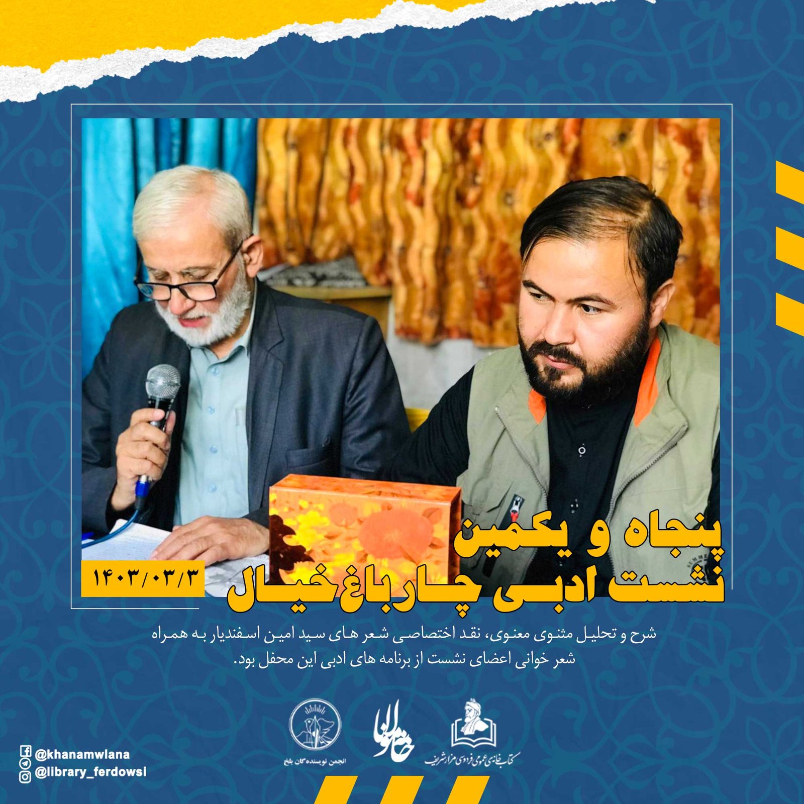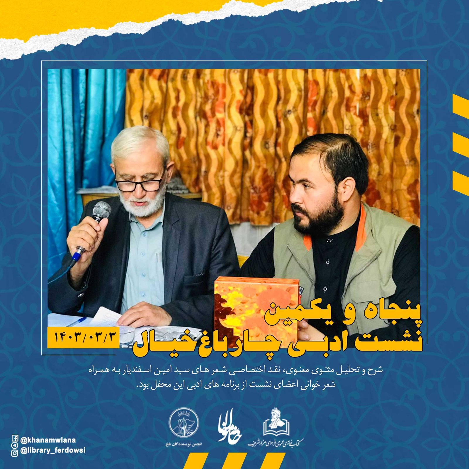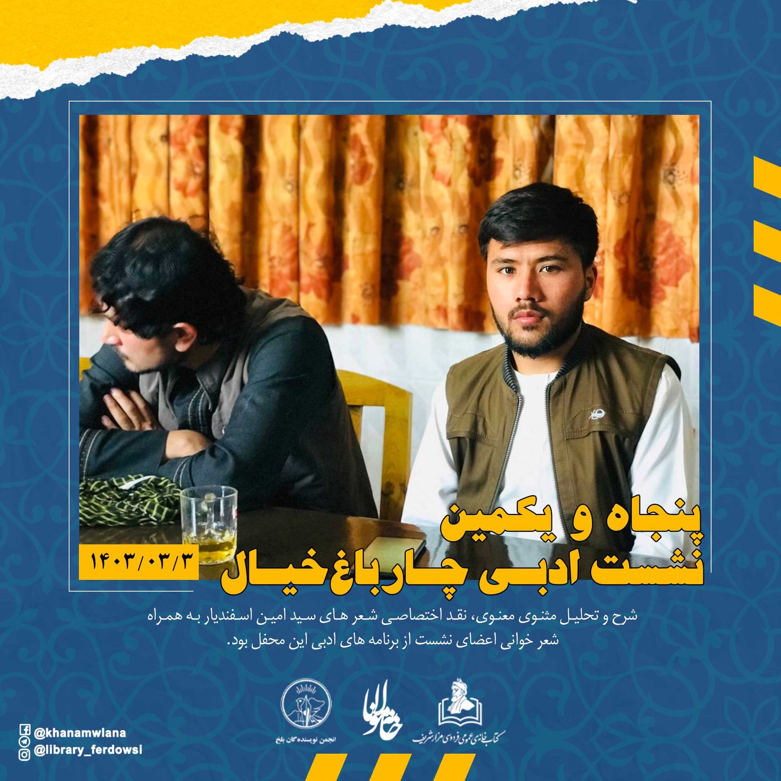 به ادامهی سلسله نشستهای ادبی «چارباغ خیال» پنجاه و یکمین نشست هفتگی انجمنهای ادبی «خانهی مولانا» و «نویسندگان بلخ»، عصر روز پنجشنبه ۱۴۰۳/۳/۳ هجری خورشیدی با حضور استاد صالح محمد خلیق (شاعر، نویسنده و رییس انجمن نویسندگان بلخ)، استاد سید سکندر حسینی بامداد (شاعر، نویسنده و رییس کتابخانهی عمومی فردوسی مزارشریف)، استاد عاطف کابلیان (شاعر و منتقد ادبی) و جمع باشکوهی از شاعران و نویسندگان بلخی بر محورهای مثنویخوانی، نقد اختصاصی پنج غزل از سید امین اسفندیار و شعرخوانی همگانی در سالن ابنسینای کتابخانهی فردوسی مزارشریف برگزار گردید.