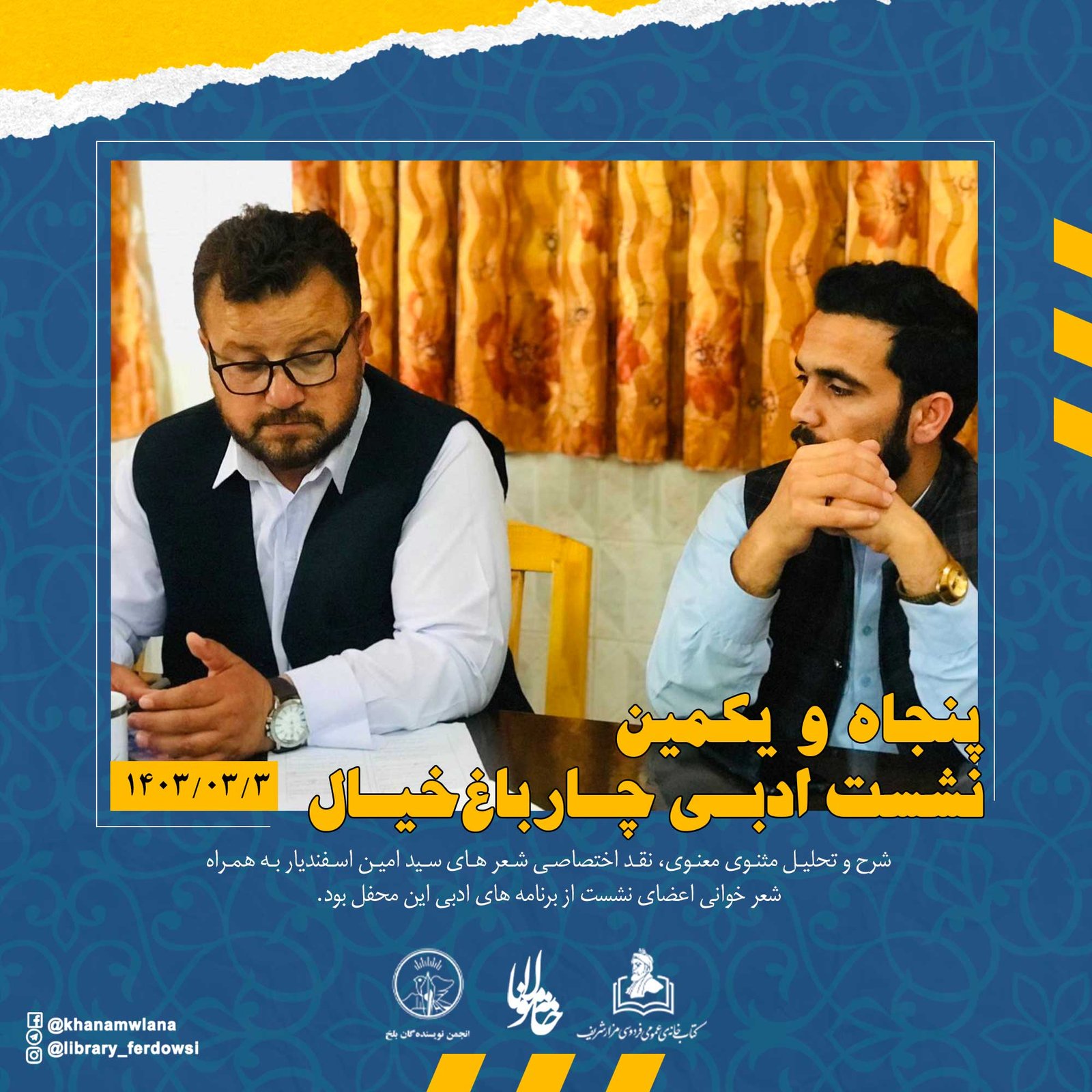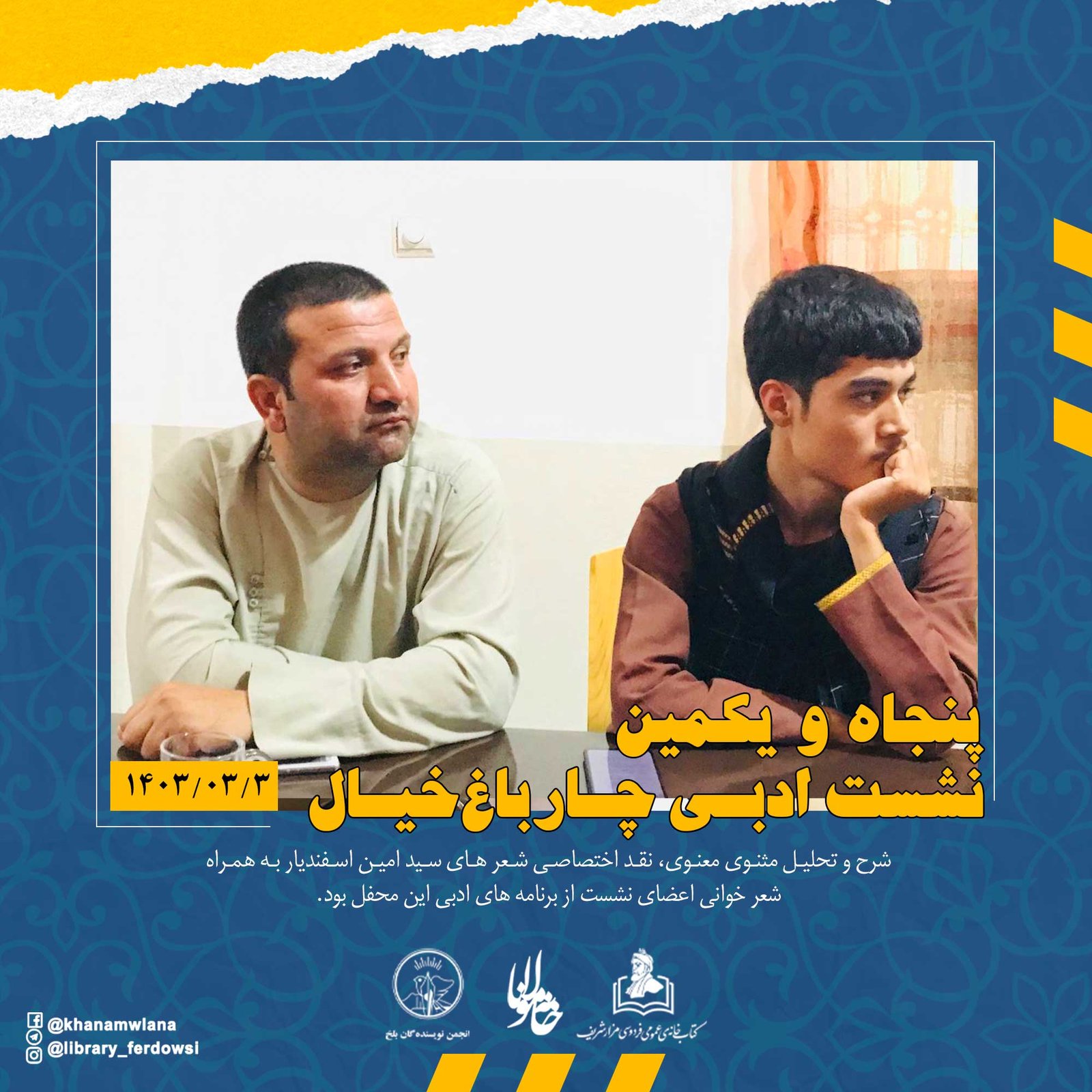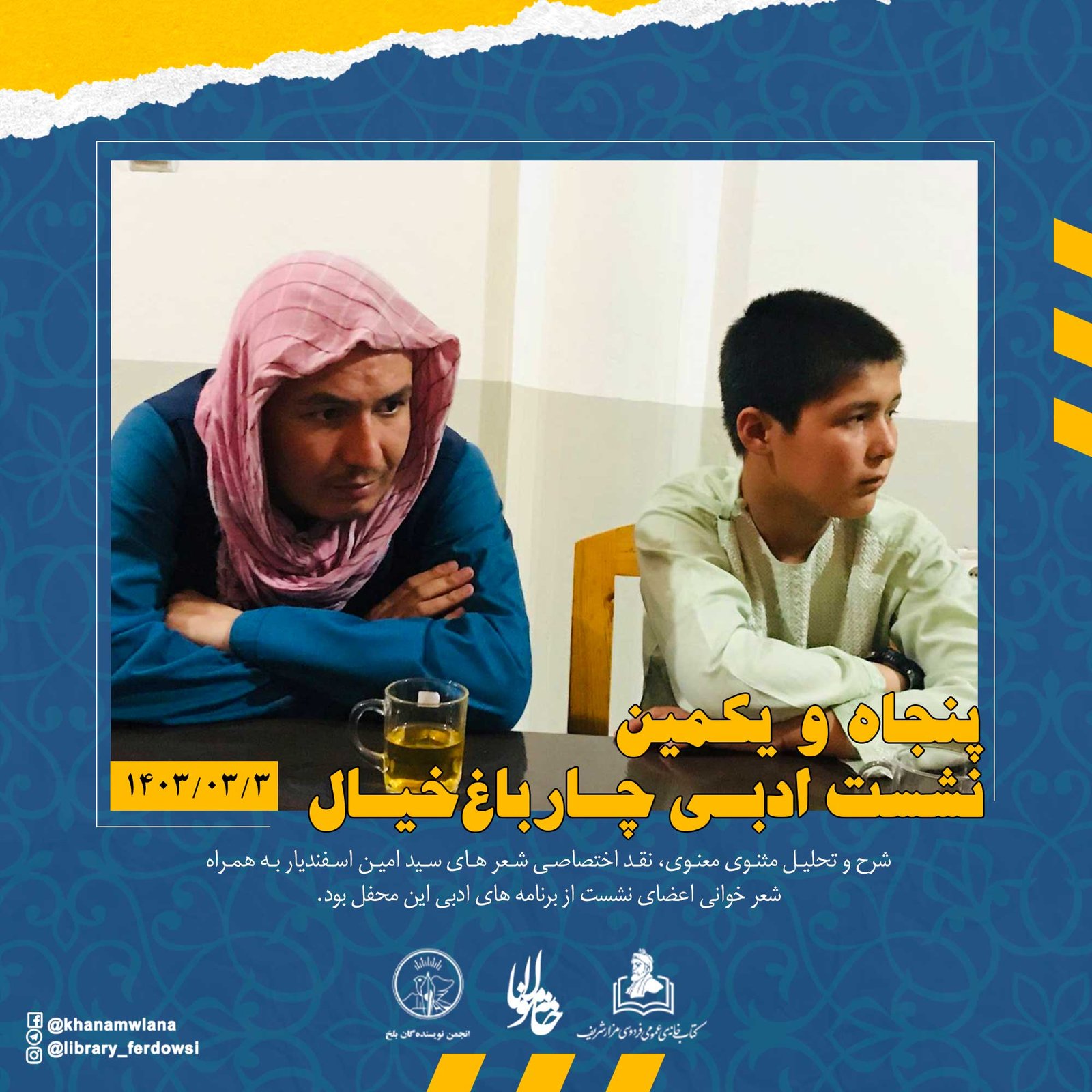 به ادامهی سلسله نشستهای ادبی «چارباغ خیال» پنجاه و یکمین نشست هفتگی انجمنهای ادبی «خانهی مولانا» و «نویسندگان بلخ»، عصر روز پنجشنبه ۱۴۰۳/۳/۳ هجری خورشیدی با حضور استاد صالح محمد خلیق (شاعر، نویسنده و رییس انجمن نویسندگان بلخ)، استاد سید سکندر حسینی بامداد (شاعر، نویسنده و رییس کتابخانهی عمومی فردوسی مزارشریف)، استاد عاطف کابلیان (شاعر و منتقد ادبی) و جمع باشکوهی از شاعران و نویسندگان بلخی بر محورهای مثنویخوانی، نقد اختصاصی پنج غزل از سید امین اسفندیار و شعرخوانی همگانی در سالن ابنسینای کتابخانهی فردوسی مزارشریف برگزار گردید.