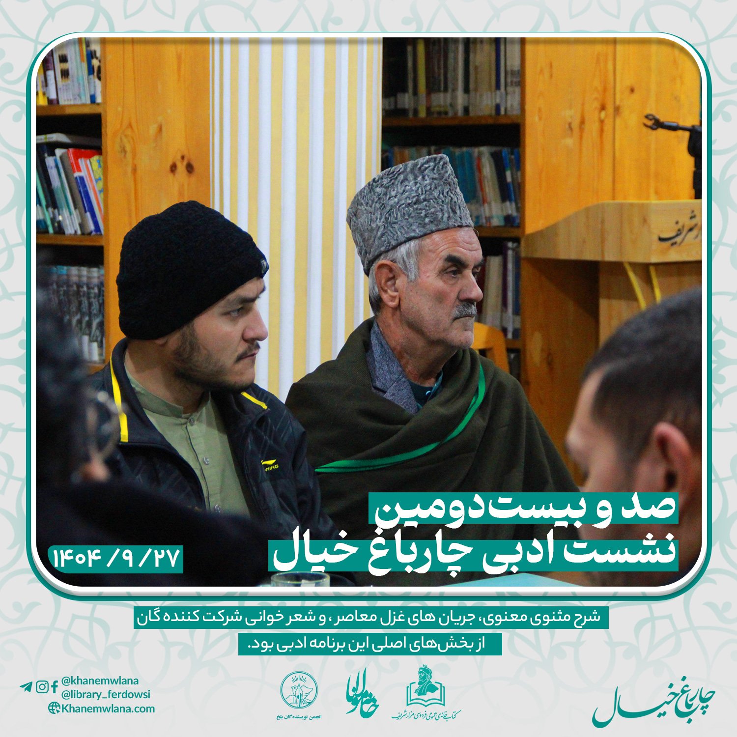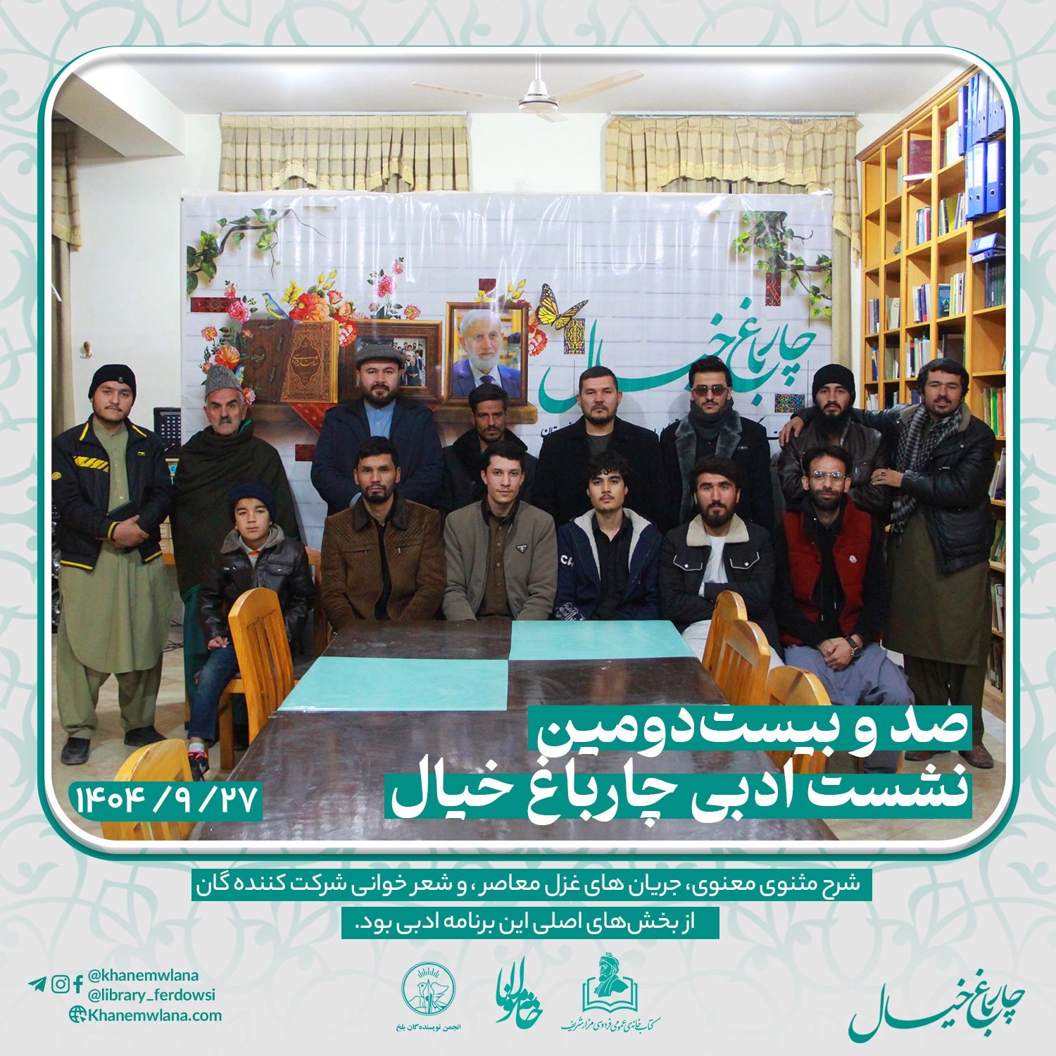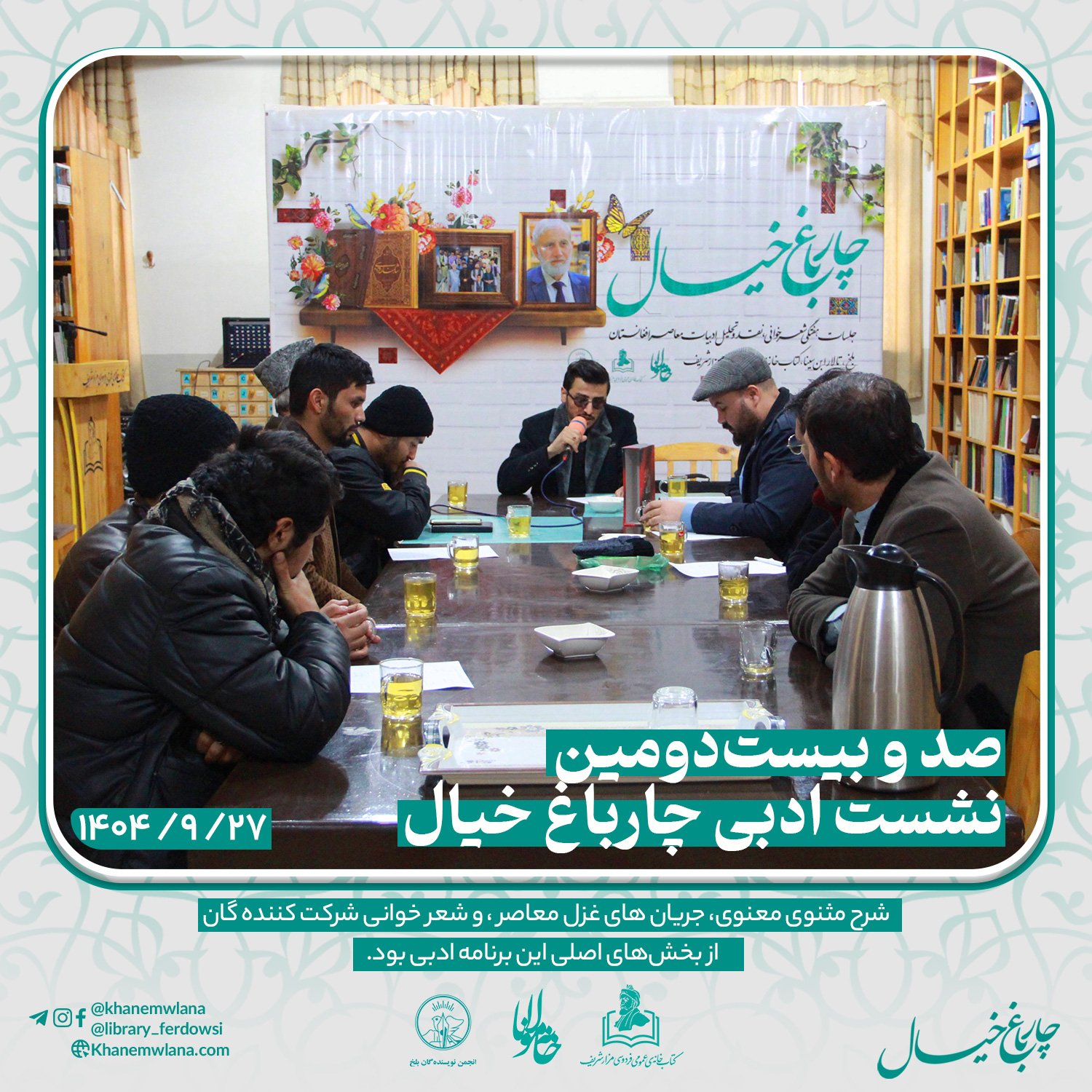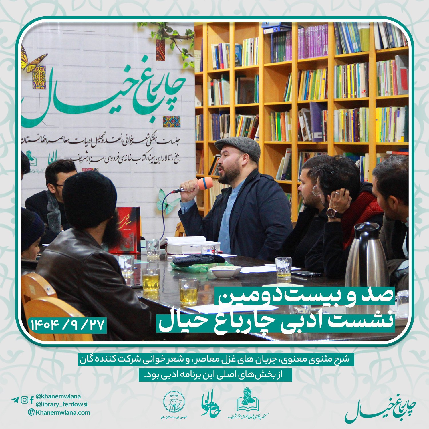 بعدازظهر پنجشنبه، 27 قوس (آذرماه) ۱۴۰۴ خورشیدی، صدوبیستودومین نشست ادبی «چارباغ خیال» با حضور جمعی از شاعران، نویسندگان و دوستداران ادب و فرهنگ، در مخزن کتابخانهٔ عمومی فردوسی شهر مزارشریف برگزار شد.
