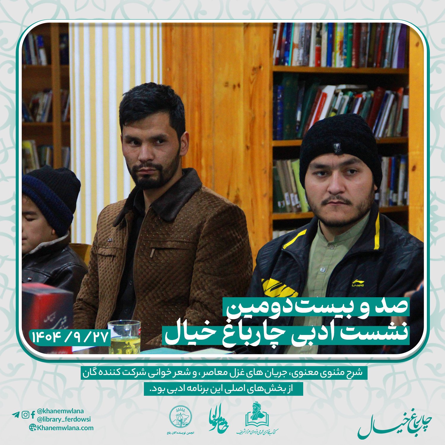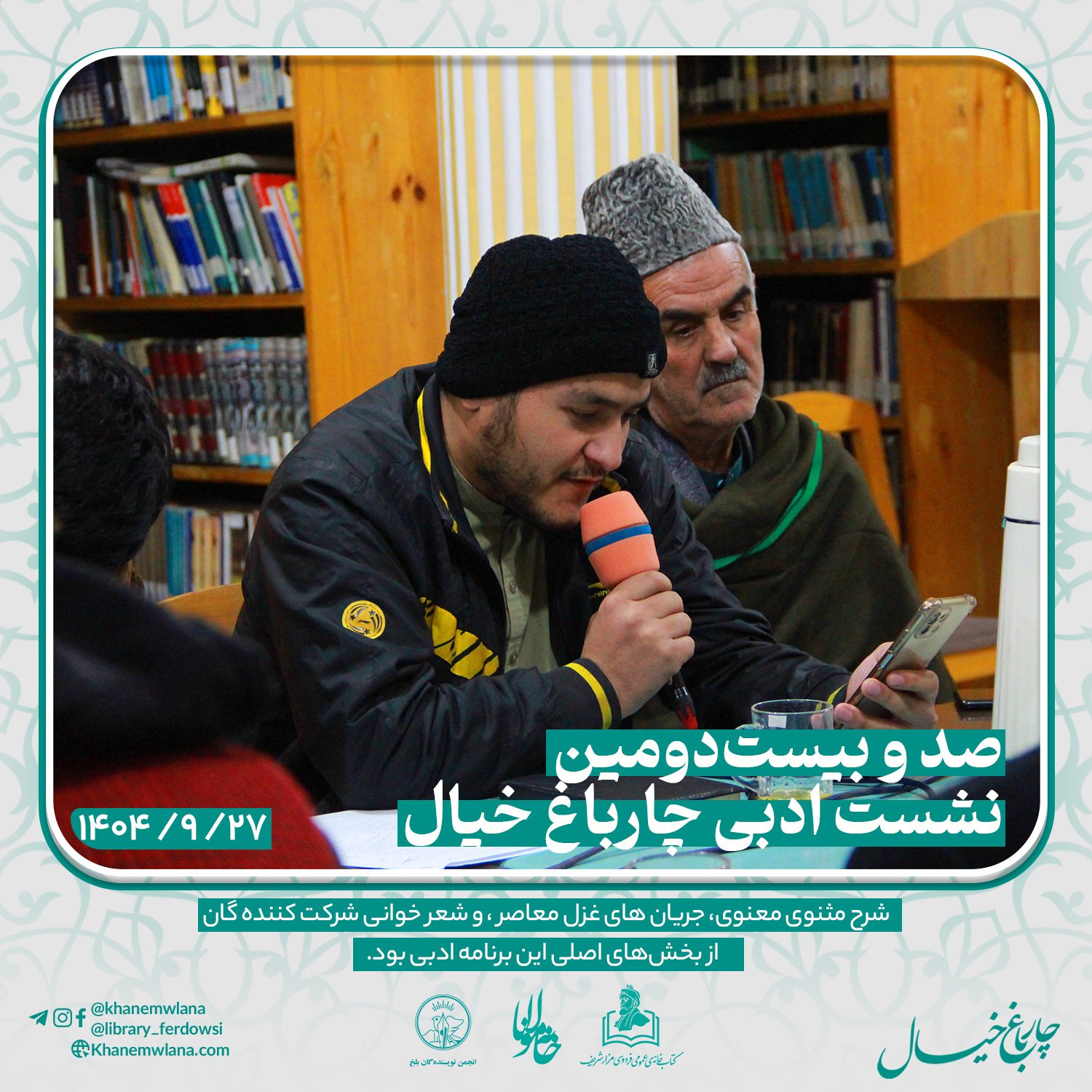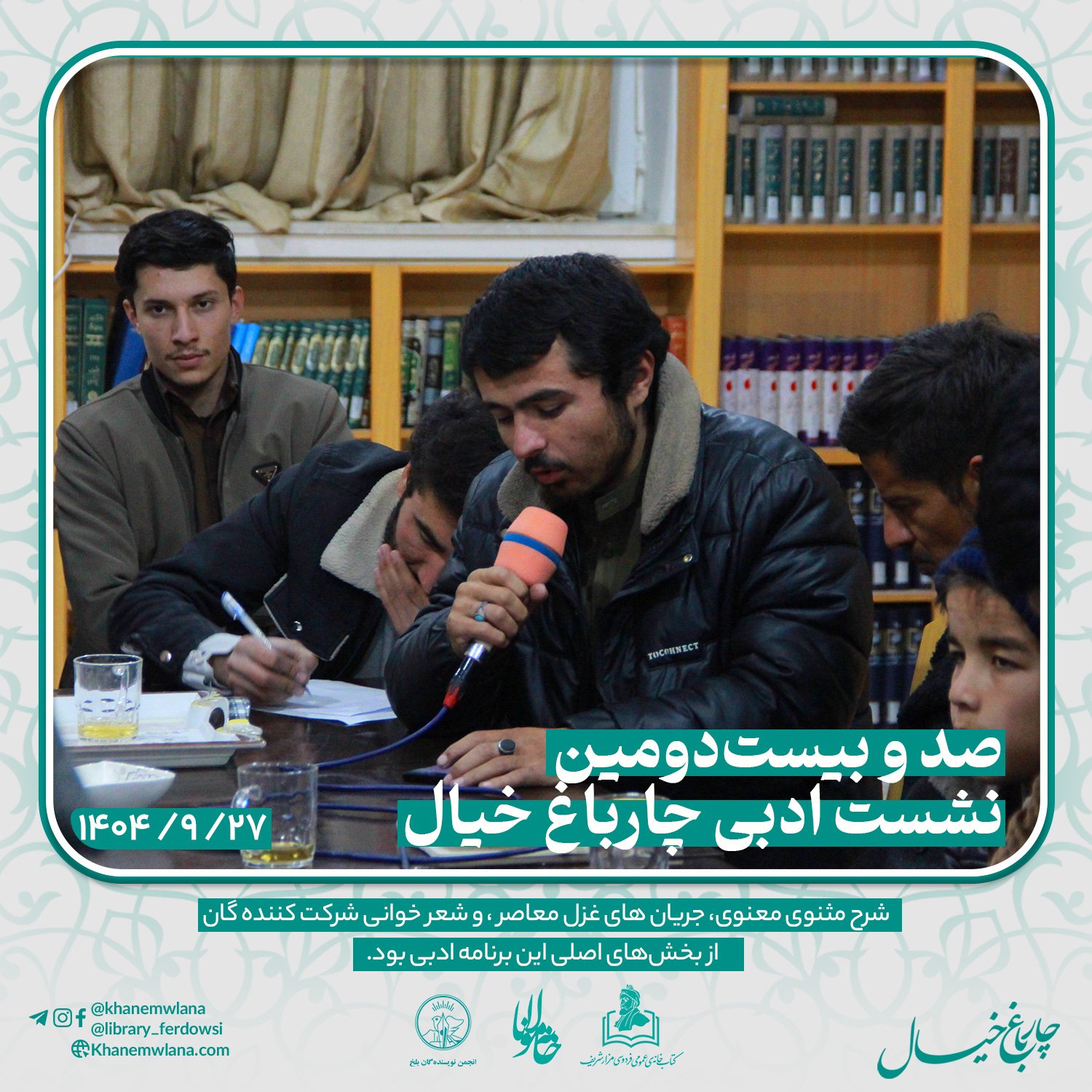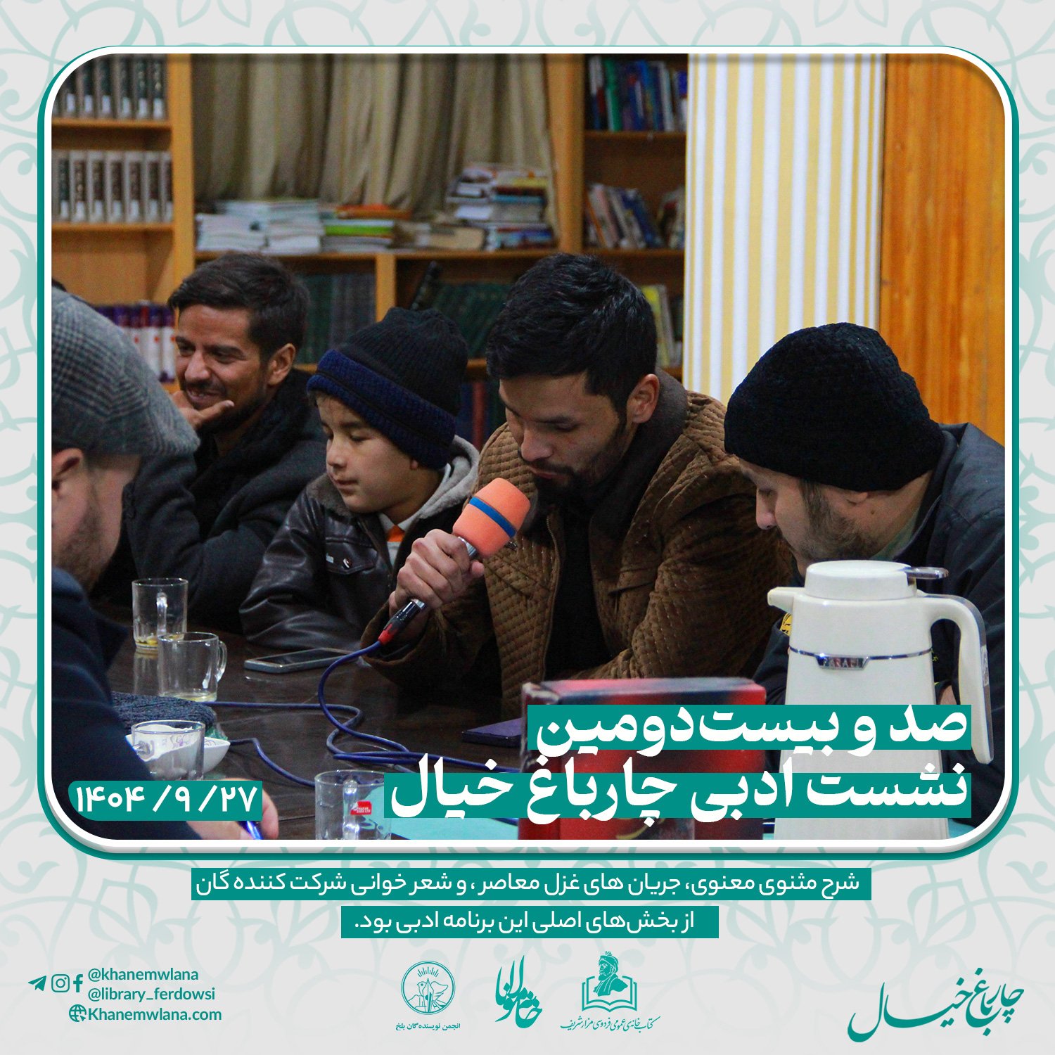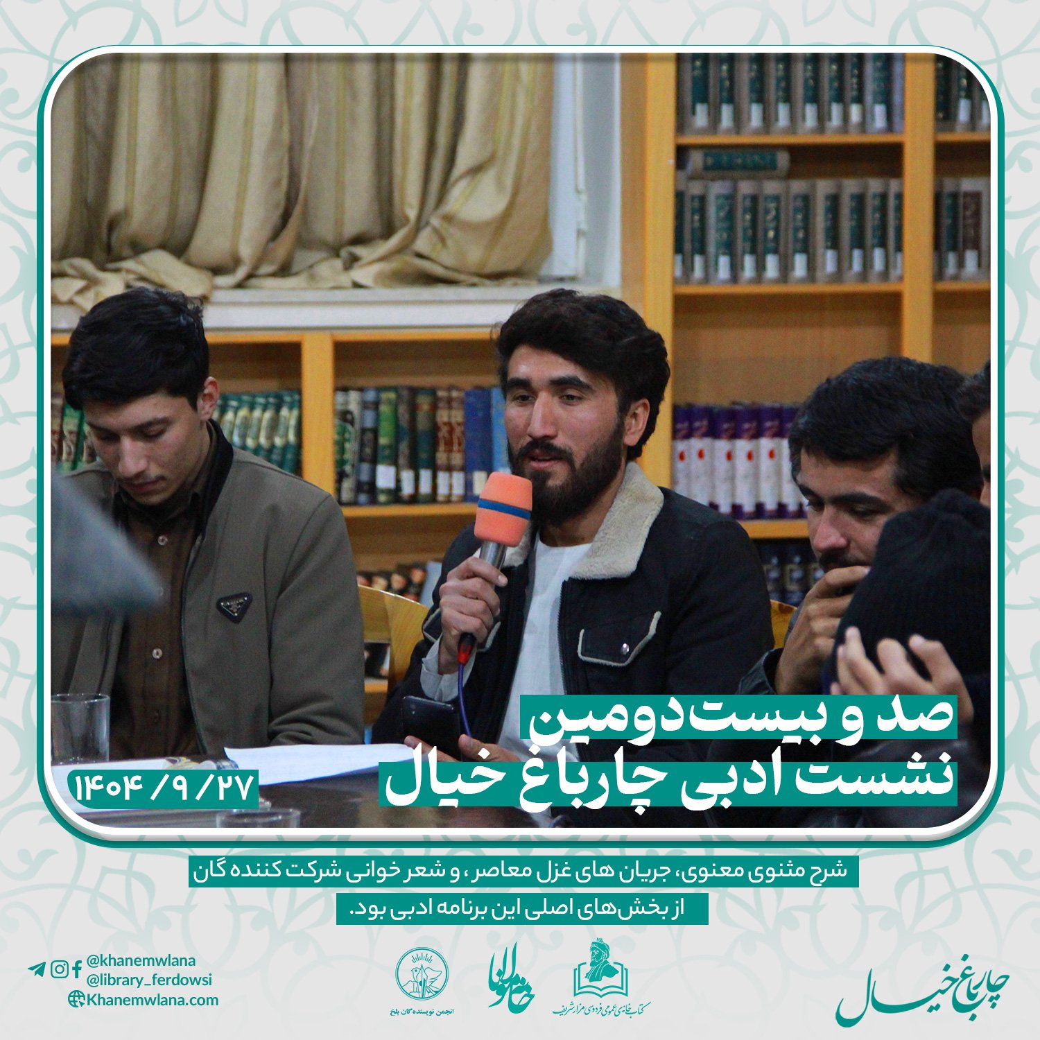 بعدازظهر پنجشنبه، 27 قوس (آذرماه) ۱۴۰۴ خورشیدی، صدوبیستودومین نشست ادبی «چارباغ خیال» با حضور جمعی از شاعران، نویسندگان و دوستداران ادب و فرهنگ، در مخزن کتابخانهٔ عمومی فردوسی شهر مزارشریف برگزار شد.
