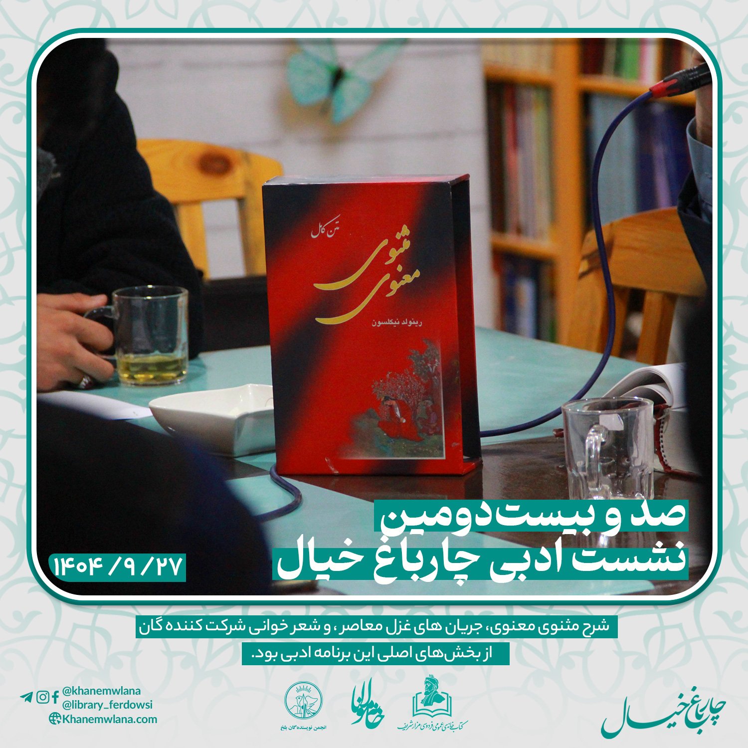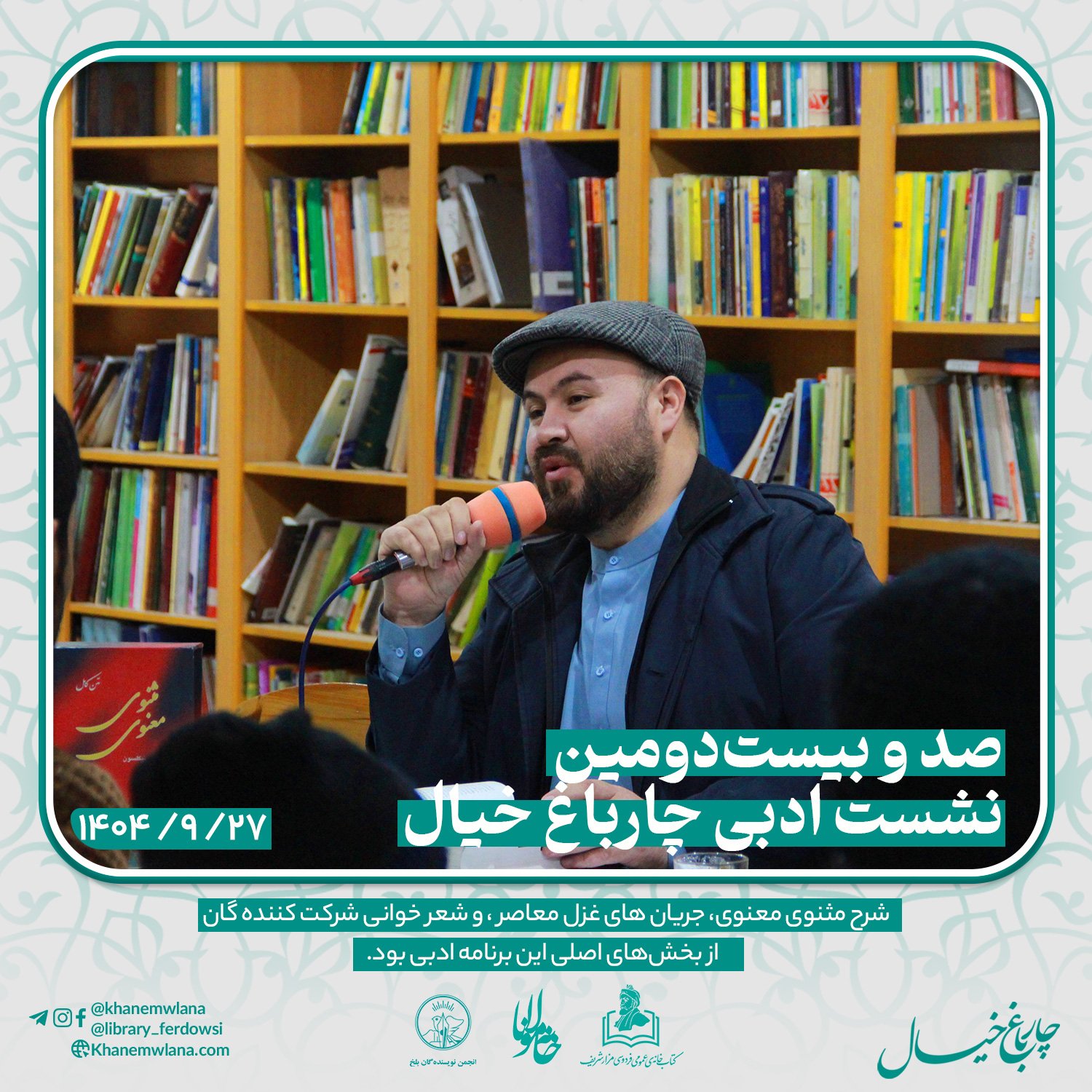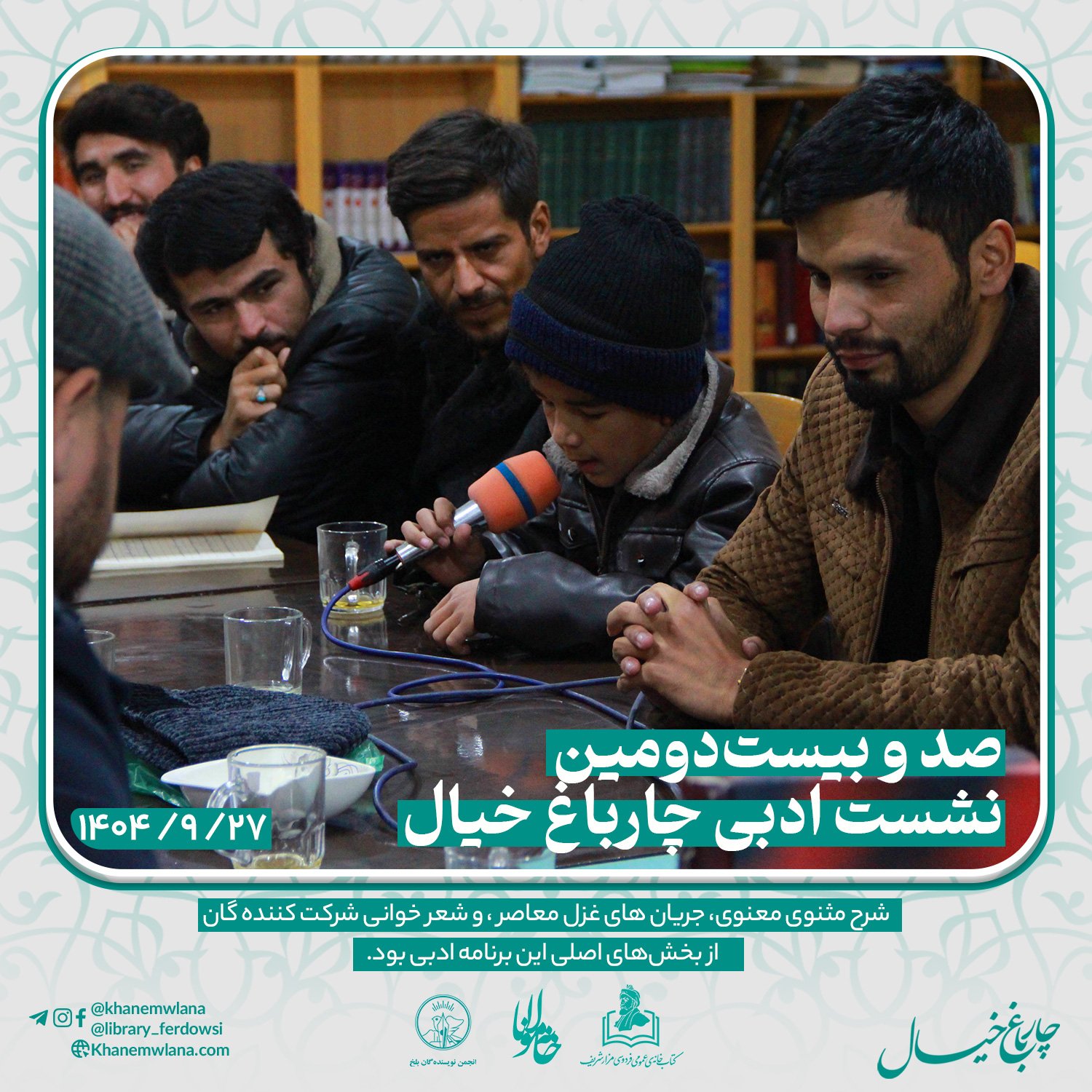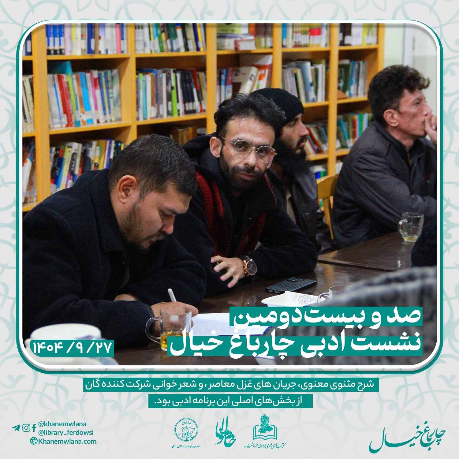 بعدازظهر پنجشنبه، 27 قوس (آذرماه) ۱۴۰۴ خورشیدی، صدوبیستودومین نشست ادبی «چارباغ خیال» با حضور جمعی از شاعران، نویسندگان و دوستداران ادب و فرهنگ، در مخزن کتابخانهٔ عمومی فردوسی شهر مزارشریف برگزار شد.