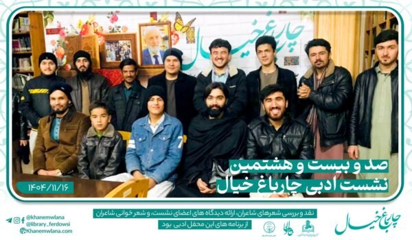 چارباغ خیال در بلخ بهنام خداوندِ جان و خردکزین برتر اندیشه برنگذرد صدوبیستودومین نشست ادبی «چارباغ خیال» در بلخ گزارش: موسی مهربان بعدازظهر پنجشنبه، ۲۷ قوس (آذرماه) ۱۴۰۴ خورشیدی، صدوبیستودومین...